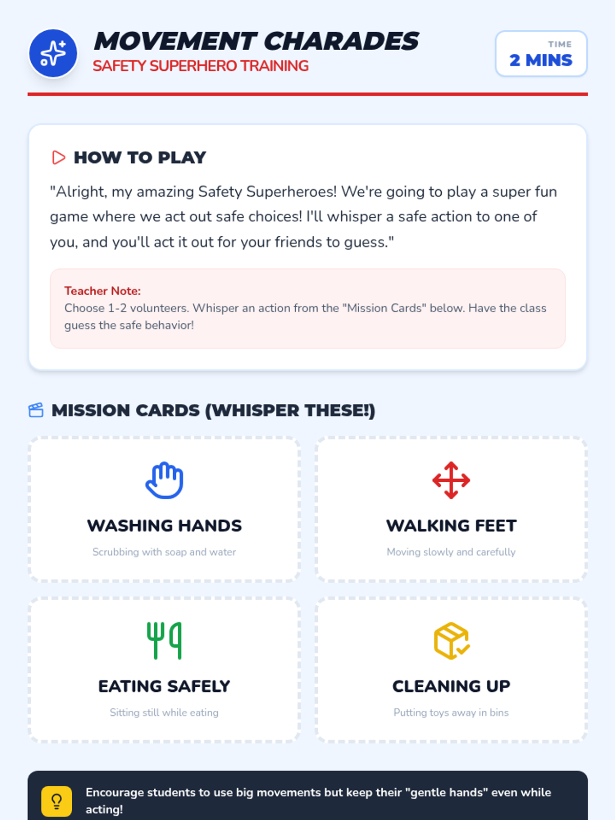 A high-energy lesson focused on gross motor skills through themed movement cards. Students mimic zoo animals and superheroes to develop coordination and body awareness.