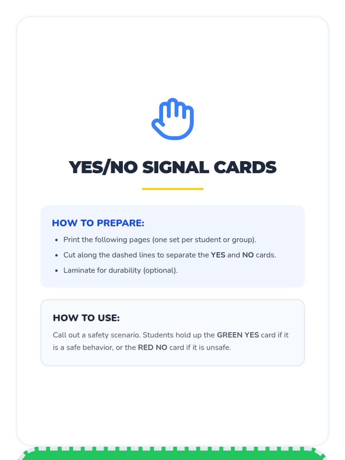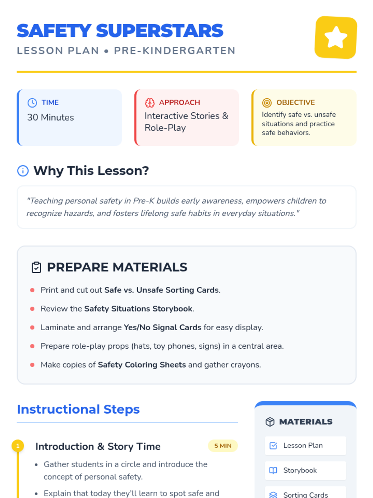 A 30-minute Pre-K lesson where students learn to distinguish between safe and unsafe situations through storytelling, interactive sorting, and role-play. Students become 'Safety Superstars' by practicing essential personal safety habits.