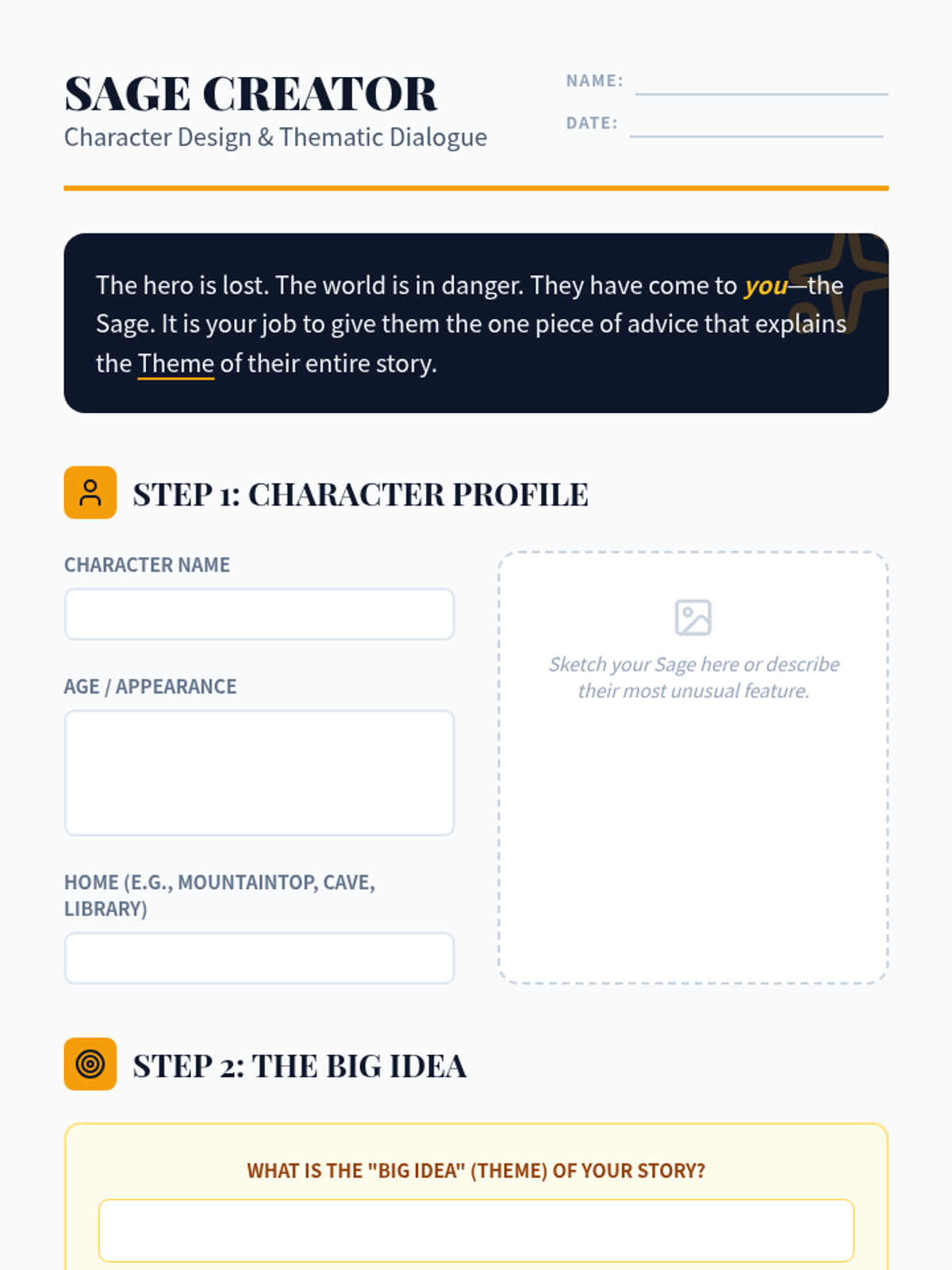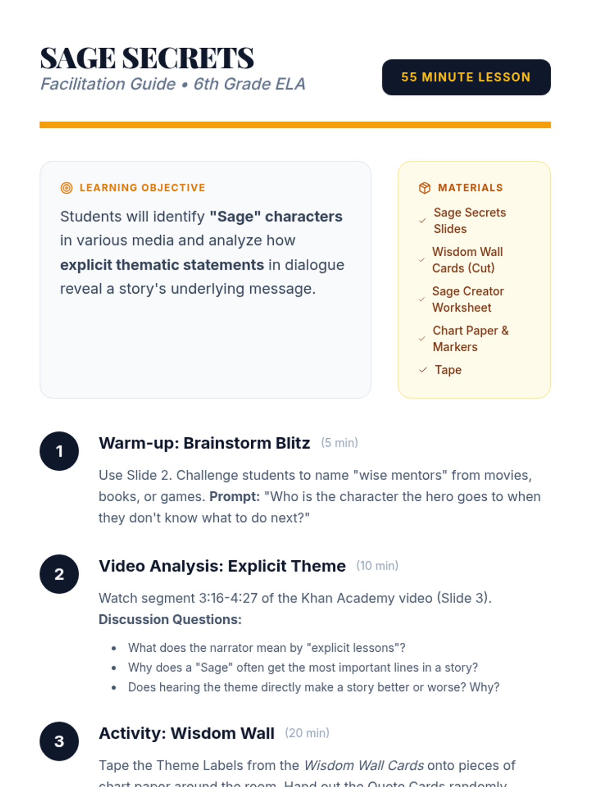 Students explore the role of 'Sage' characters in literature and film, learning how these characters often voice the story's theme through explicit dialogue. The lesson includes a video analysis, a quote-matching activity, and a creative writing task.