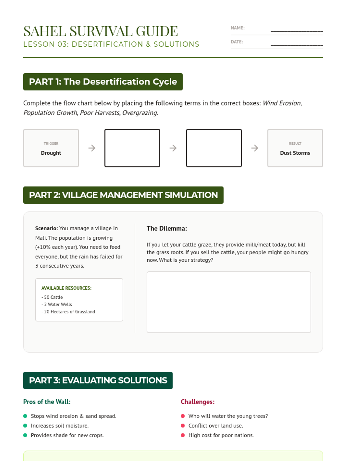 Students examine the Sahel as a transition zone, simulating the causes and effects of desertification and evaluating the Great Green Wall as a restorative solution.