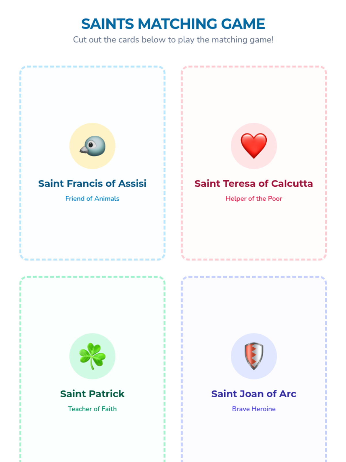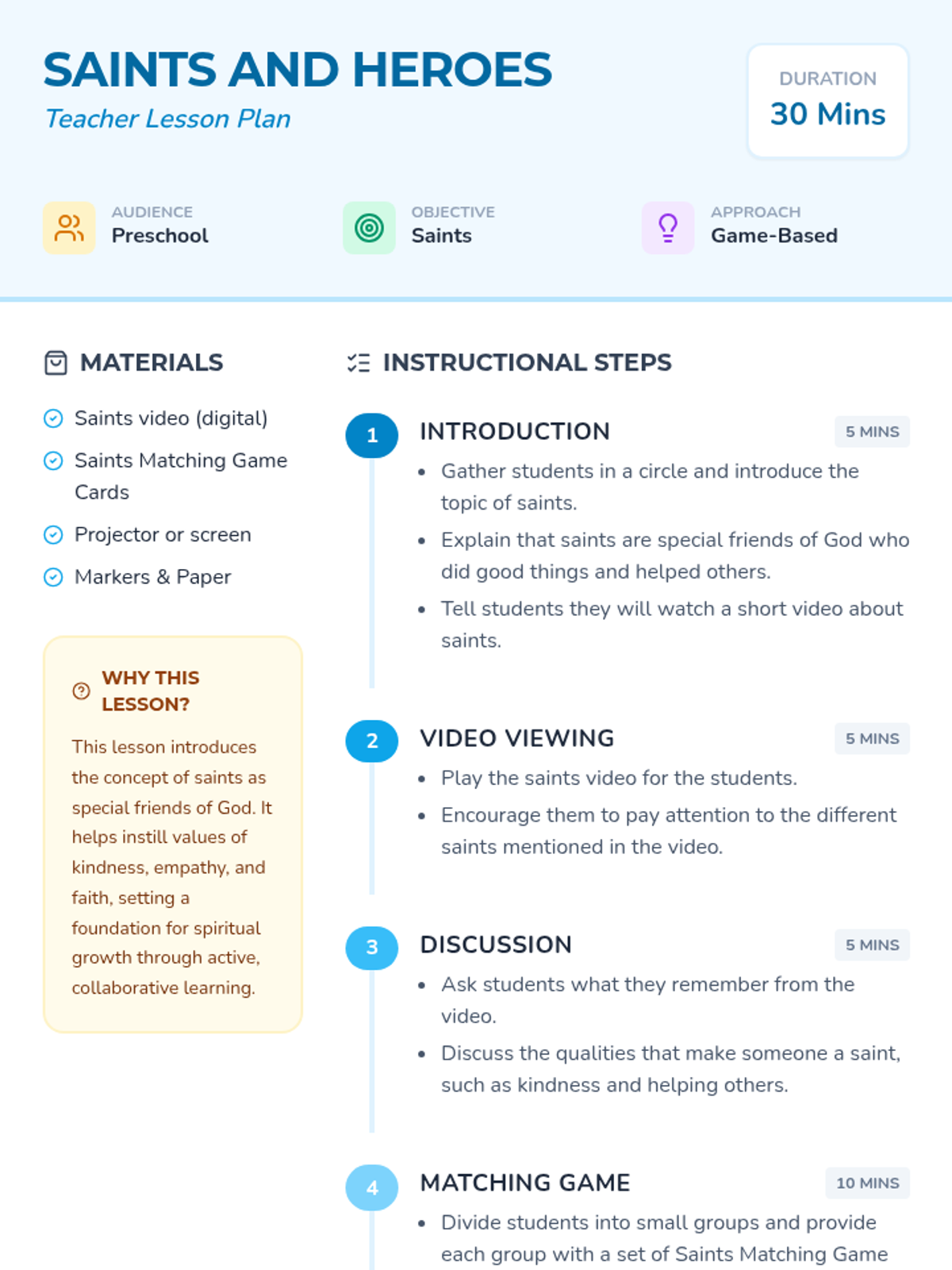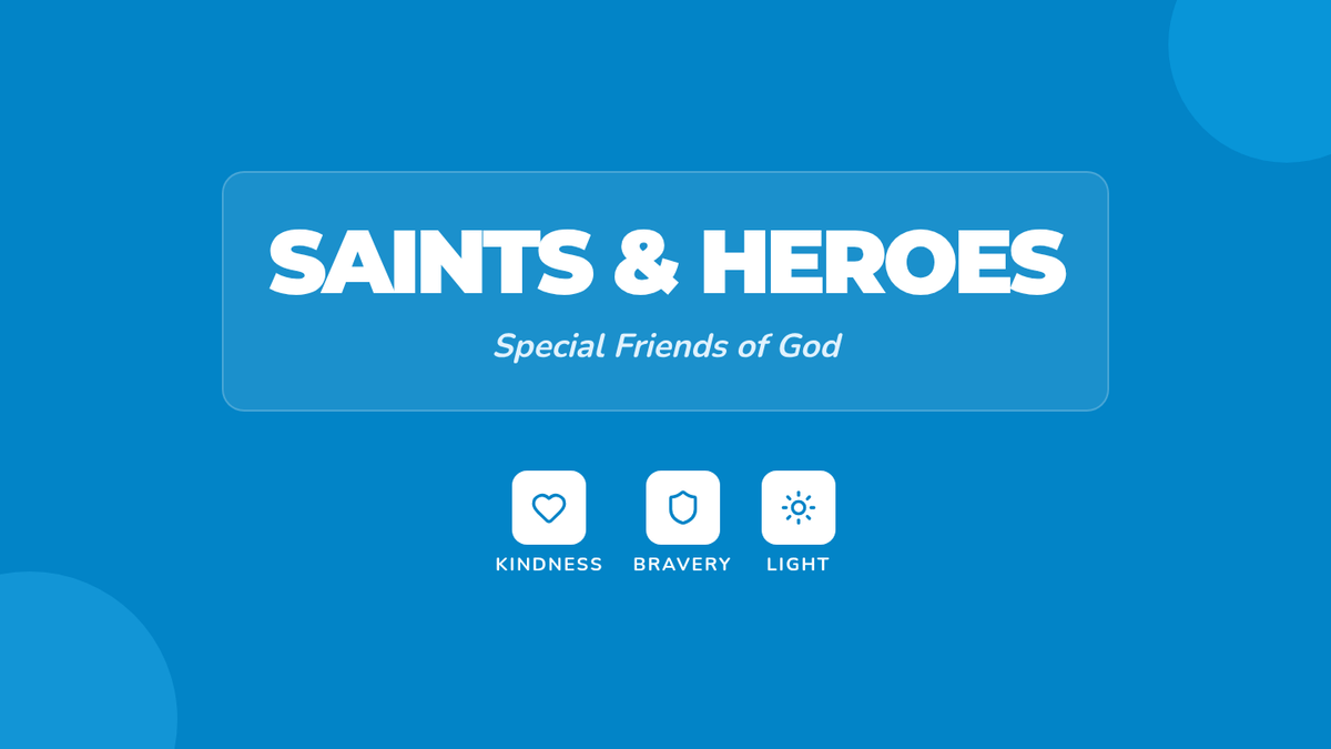 A preschool lesson introducing the concept of saints as special friends of God through interactive storytelling, a video, and a matching game. Students explore qualities like kindness and bravery while learning about historical figures who lived holy lives.