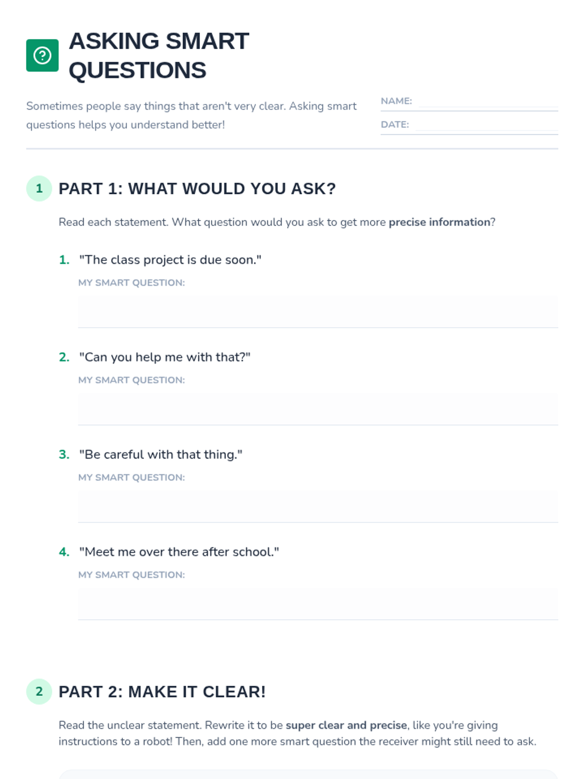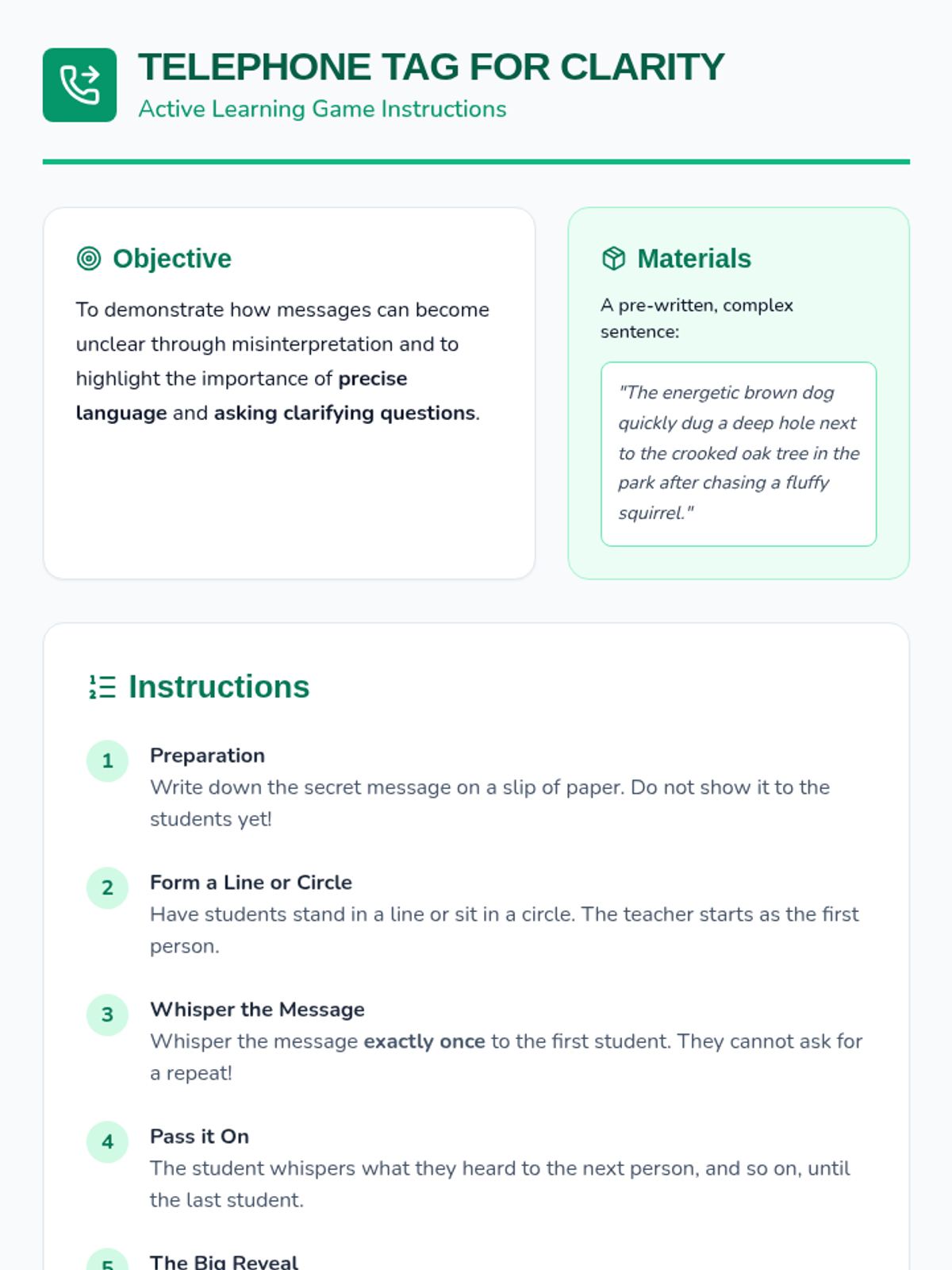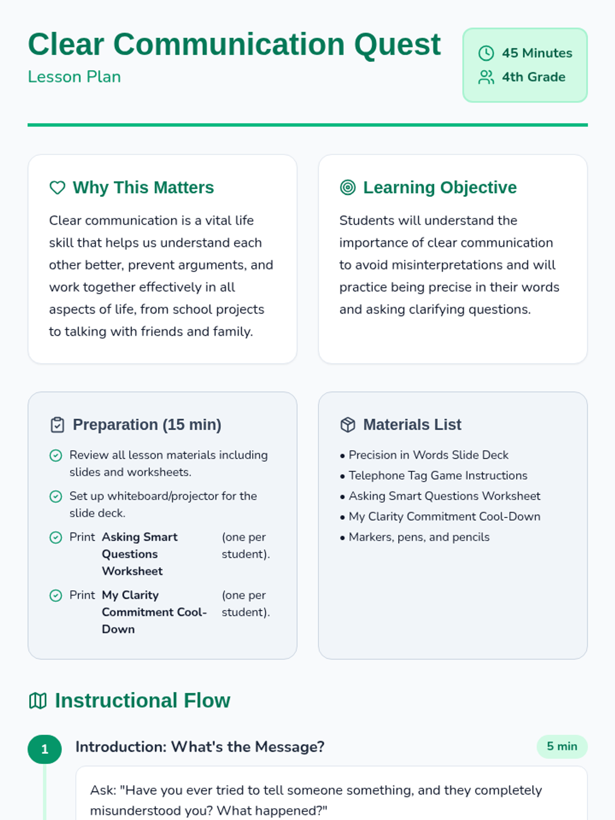 A 45-minute lesson for 4th graders on the importance of clear communication, focusing on using precise language and asking clarifying questions to avoid misunderstandings.