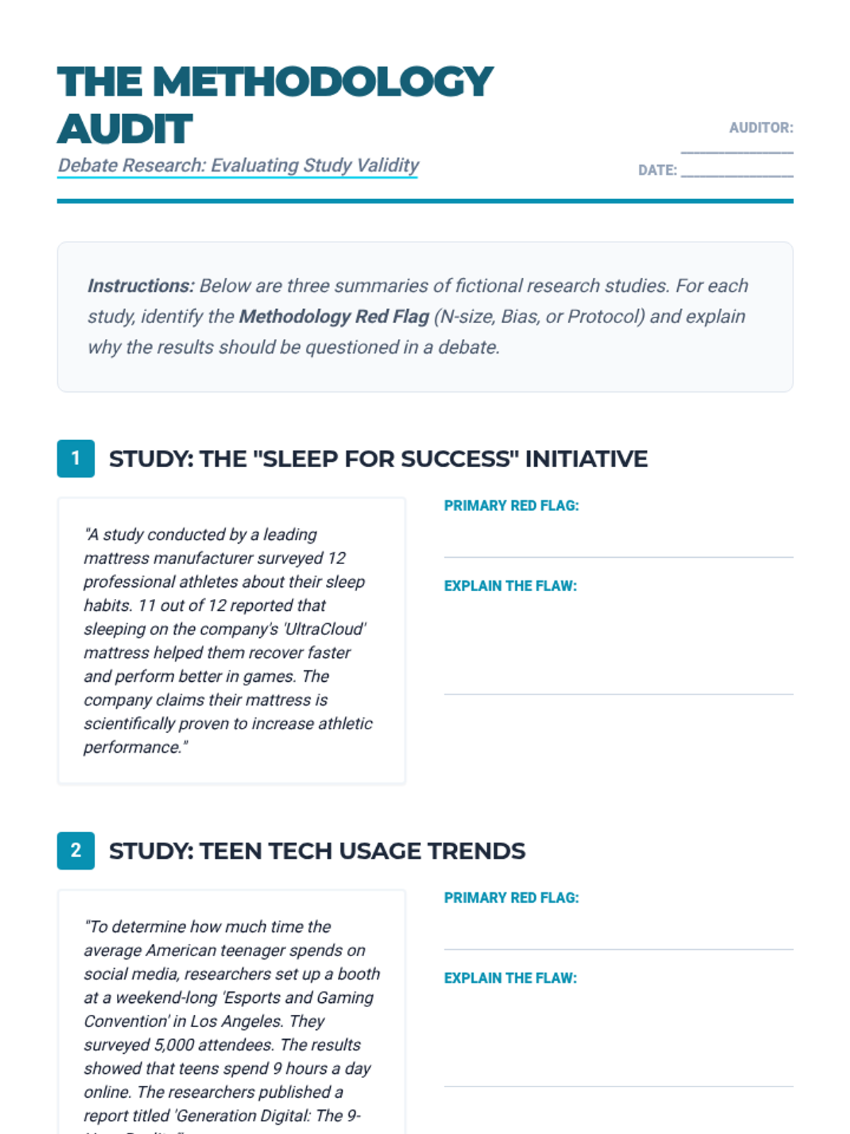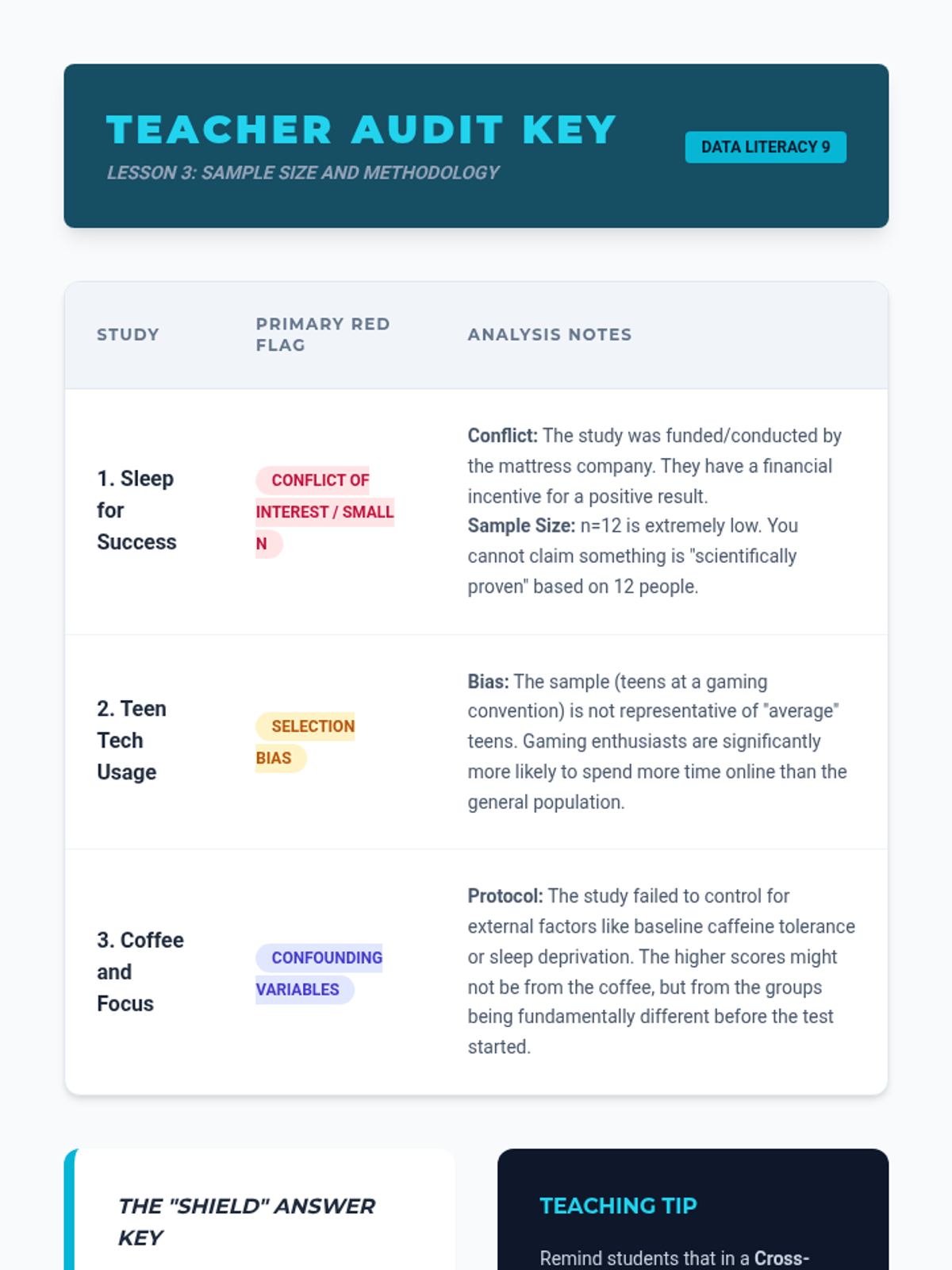 Students learn to check the 'n' number (sample size) and methodology of studies. They practice rejecting sources that survey too few people or use unrepresentative samples.