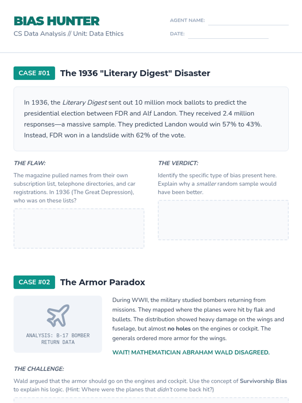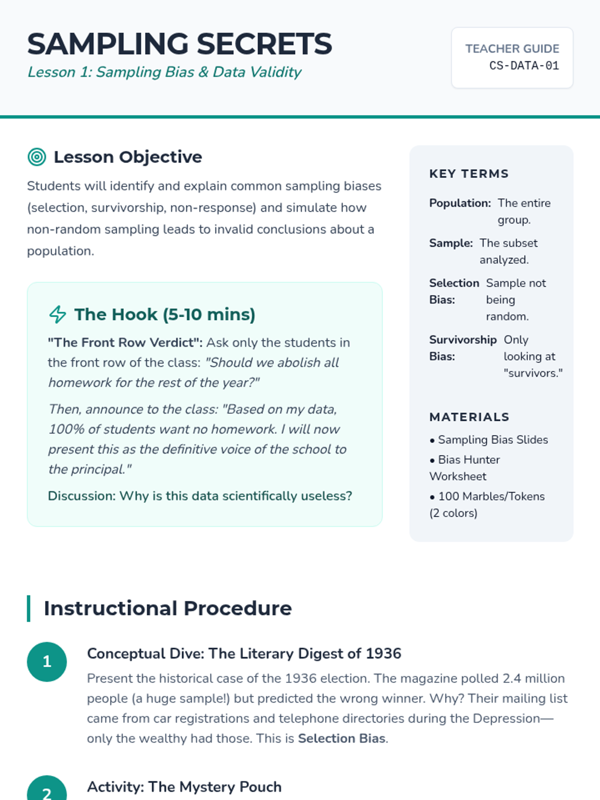 Students investigate how non-representative samples warp results using simulations and historical case studies like election polling failures.