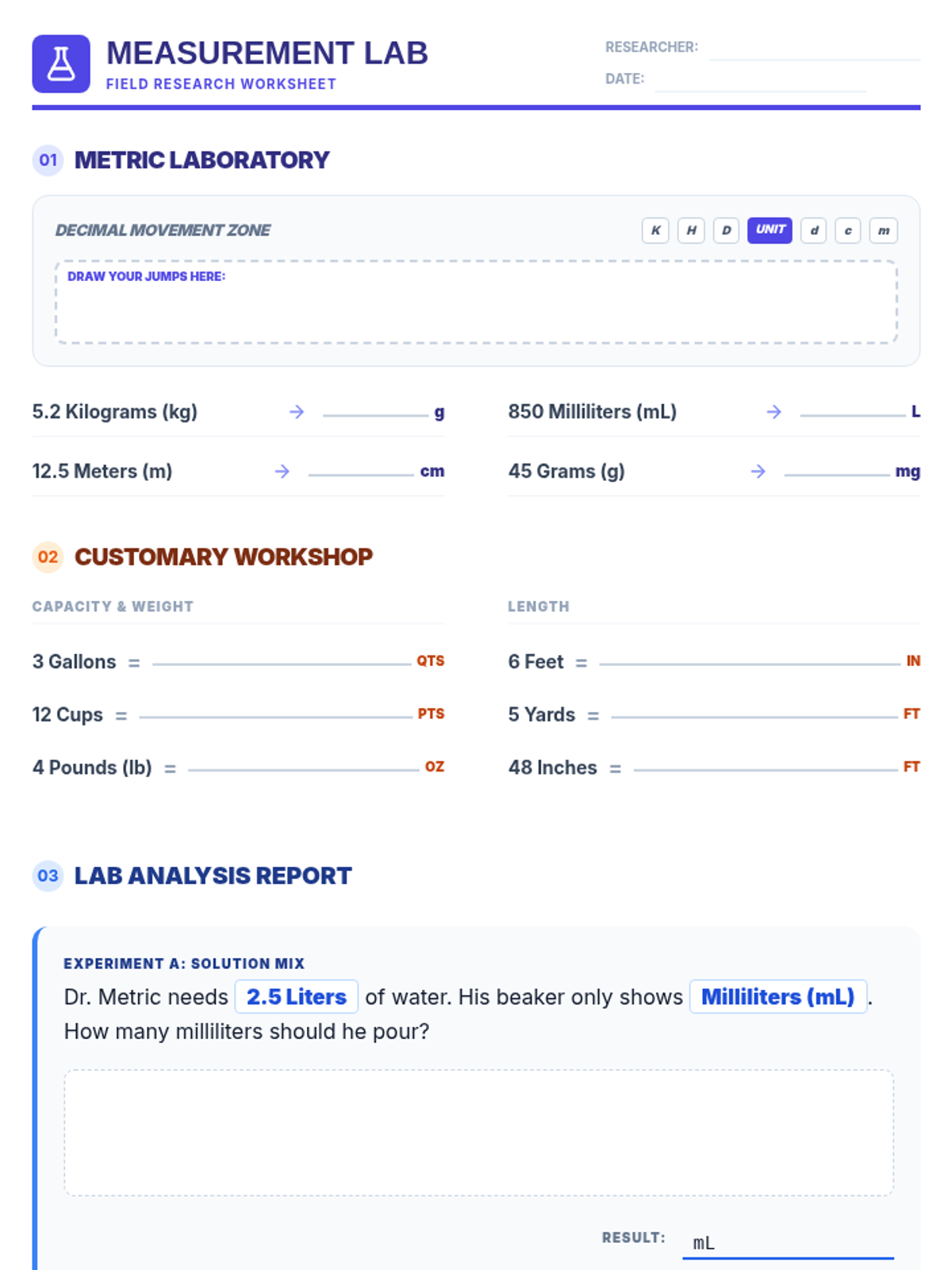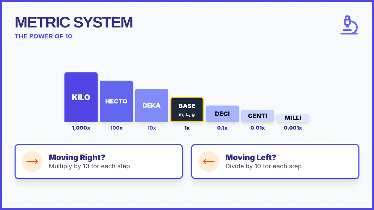 Students explore the relationship between metric units and powers of ten, using visual staircases and laboratory 'blueprints' to master conversions.