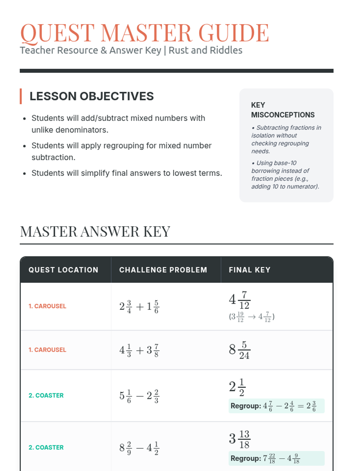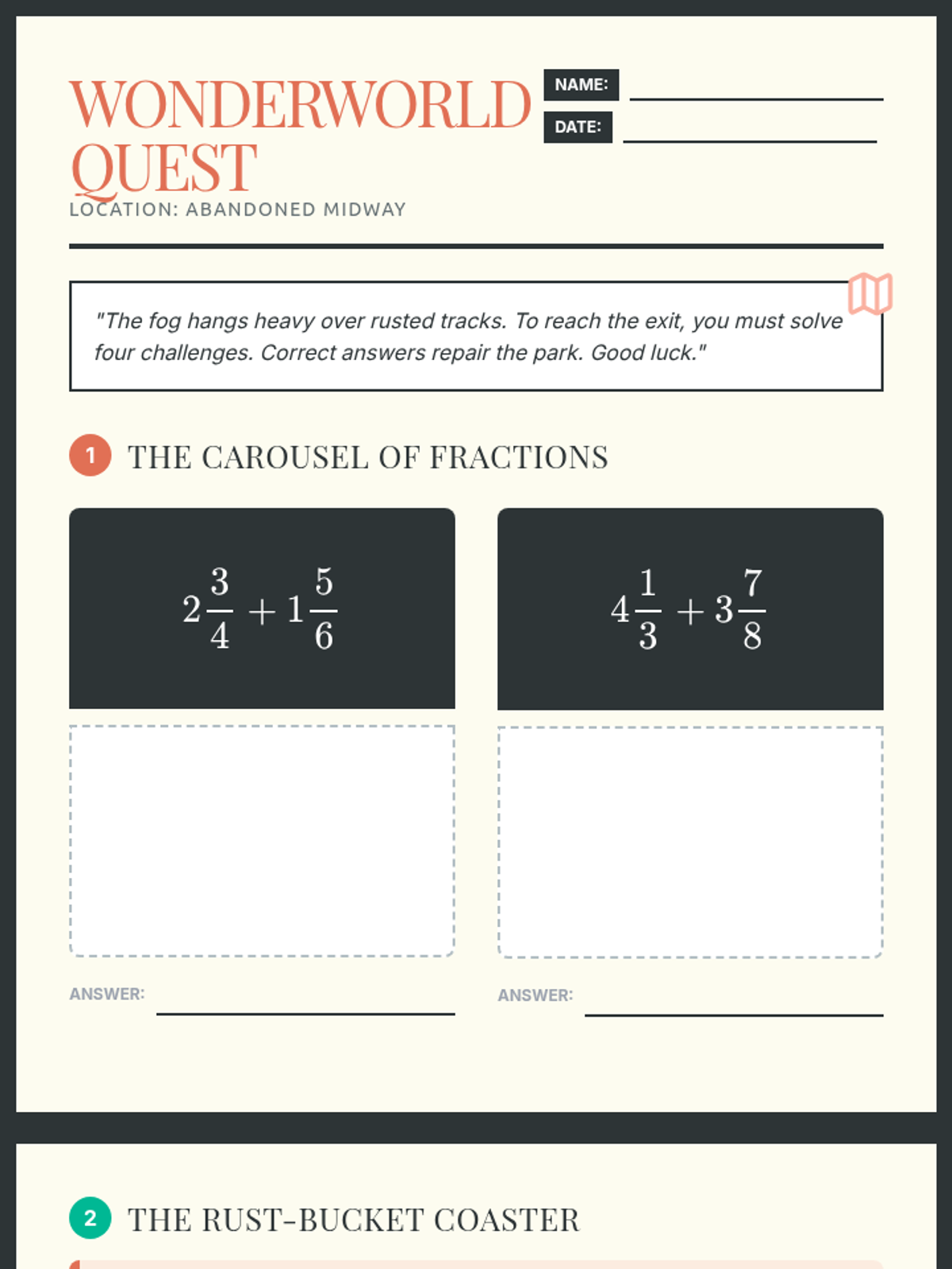 A mathematical quest set in an abandoned theme park where students solve fraction and mixed number problems with unlike denominators and regrouping to navigate the park.