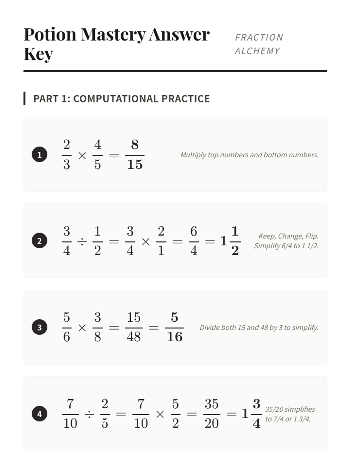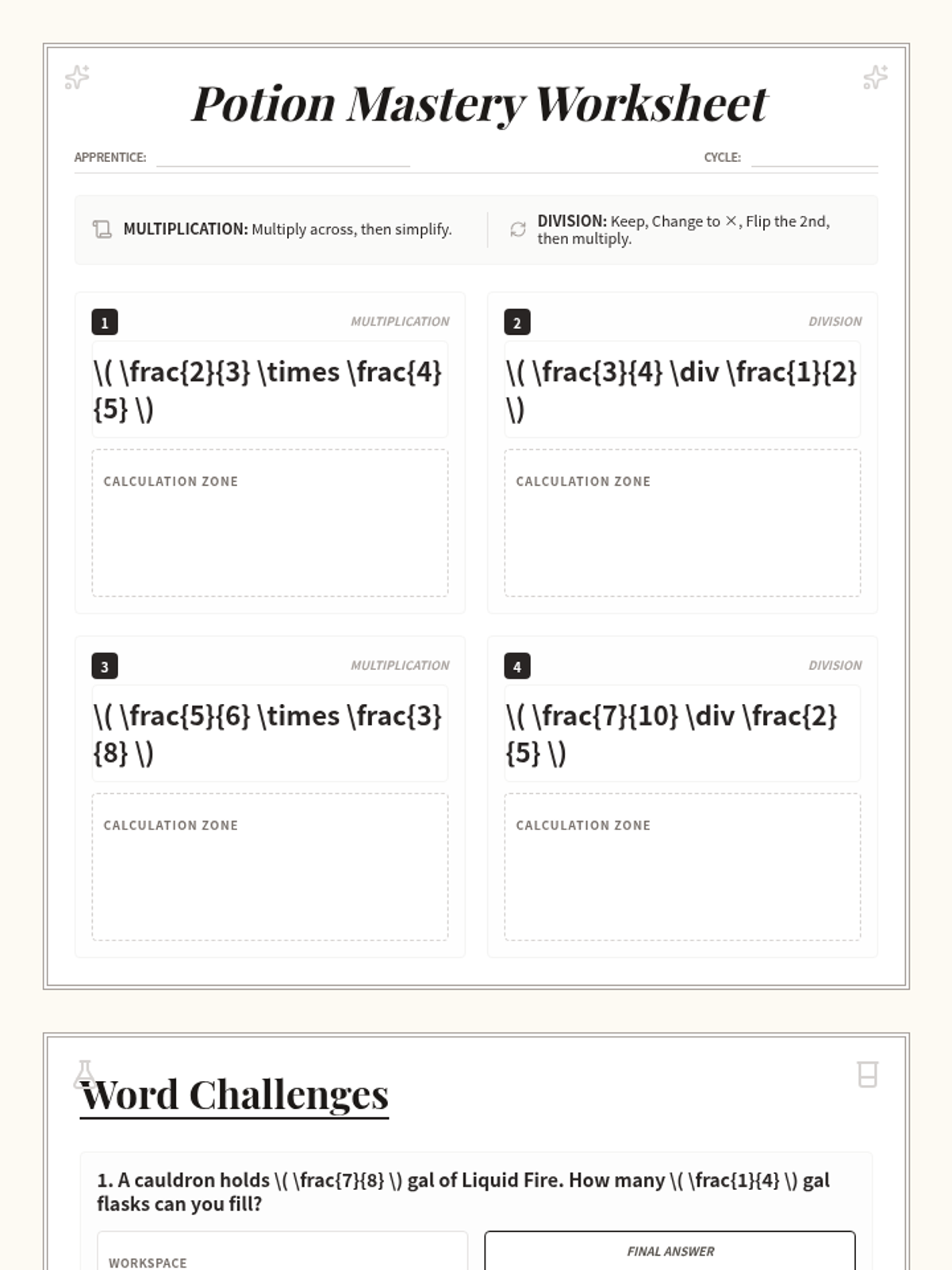 A lesson on multiplying and dividing fractions with unlike denominators, themed around an alchemy lab where students brew potions using mathematical formulas.