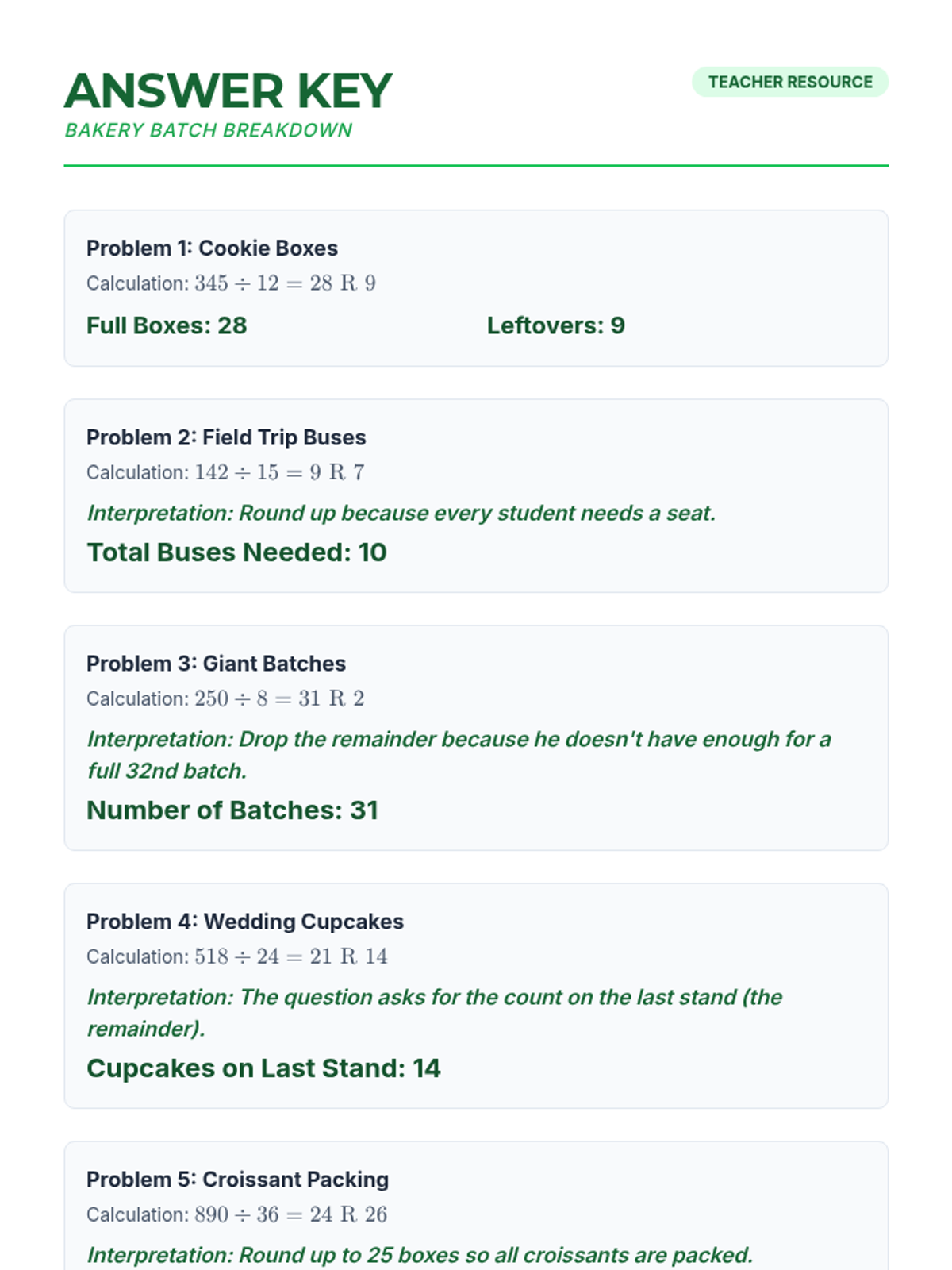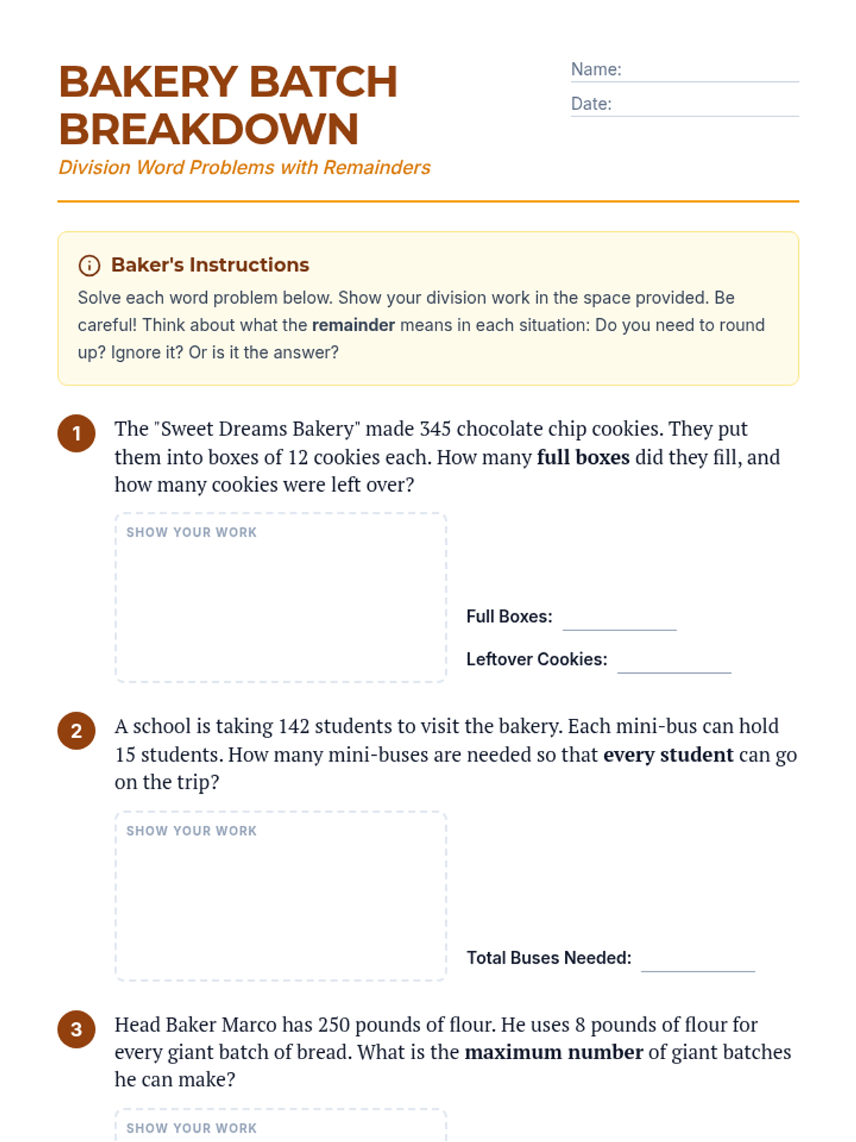 A lesson focused on solving and interpreting division word problems with remainders, using a bakery theme to provide real-world context.