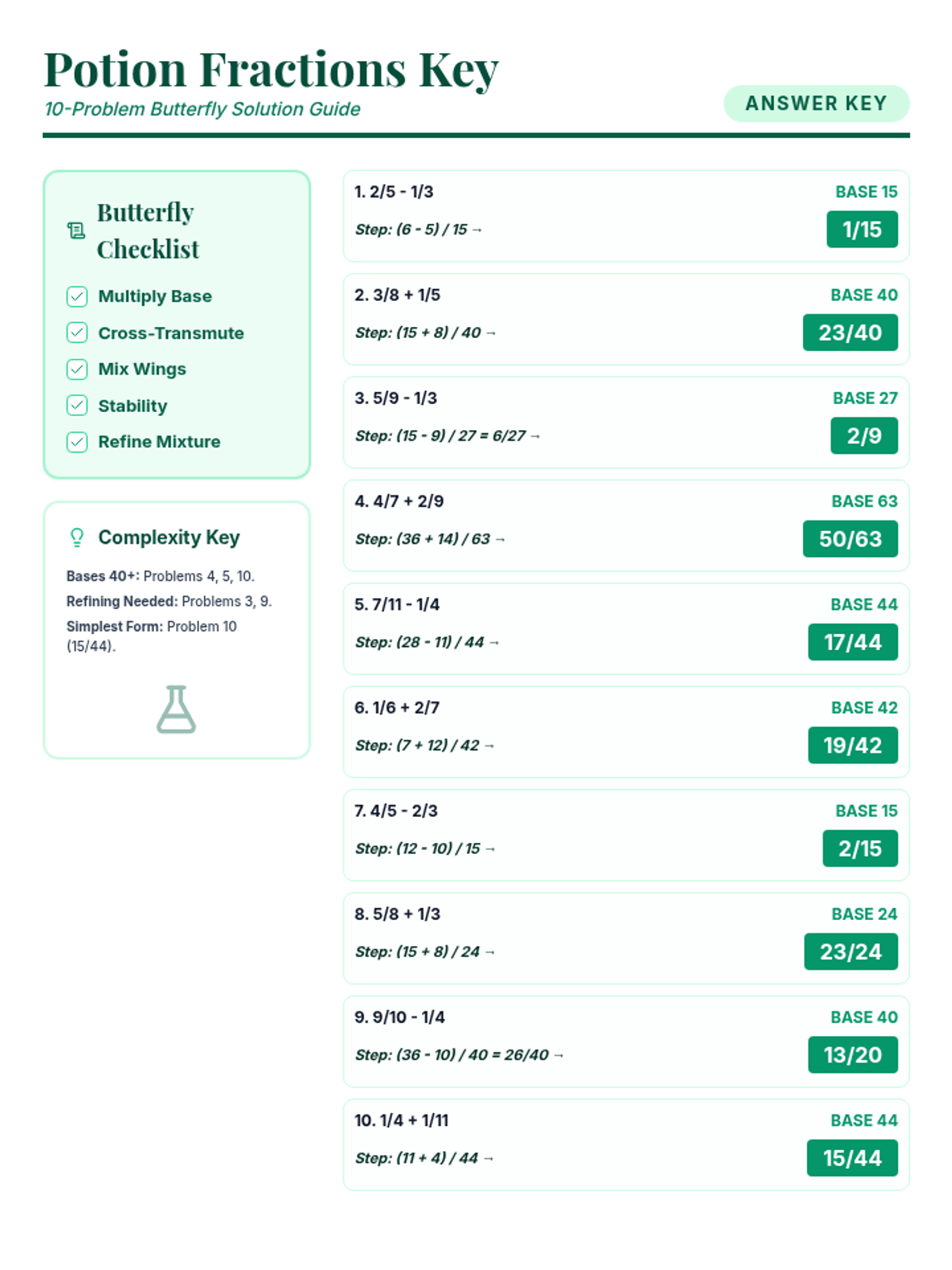A lesson focused on adding and subtracting proper fractions with unlike denominators using a step-by-step checklist and potion-themed problems.
