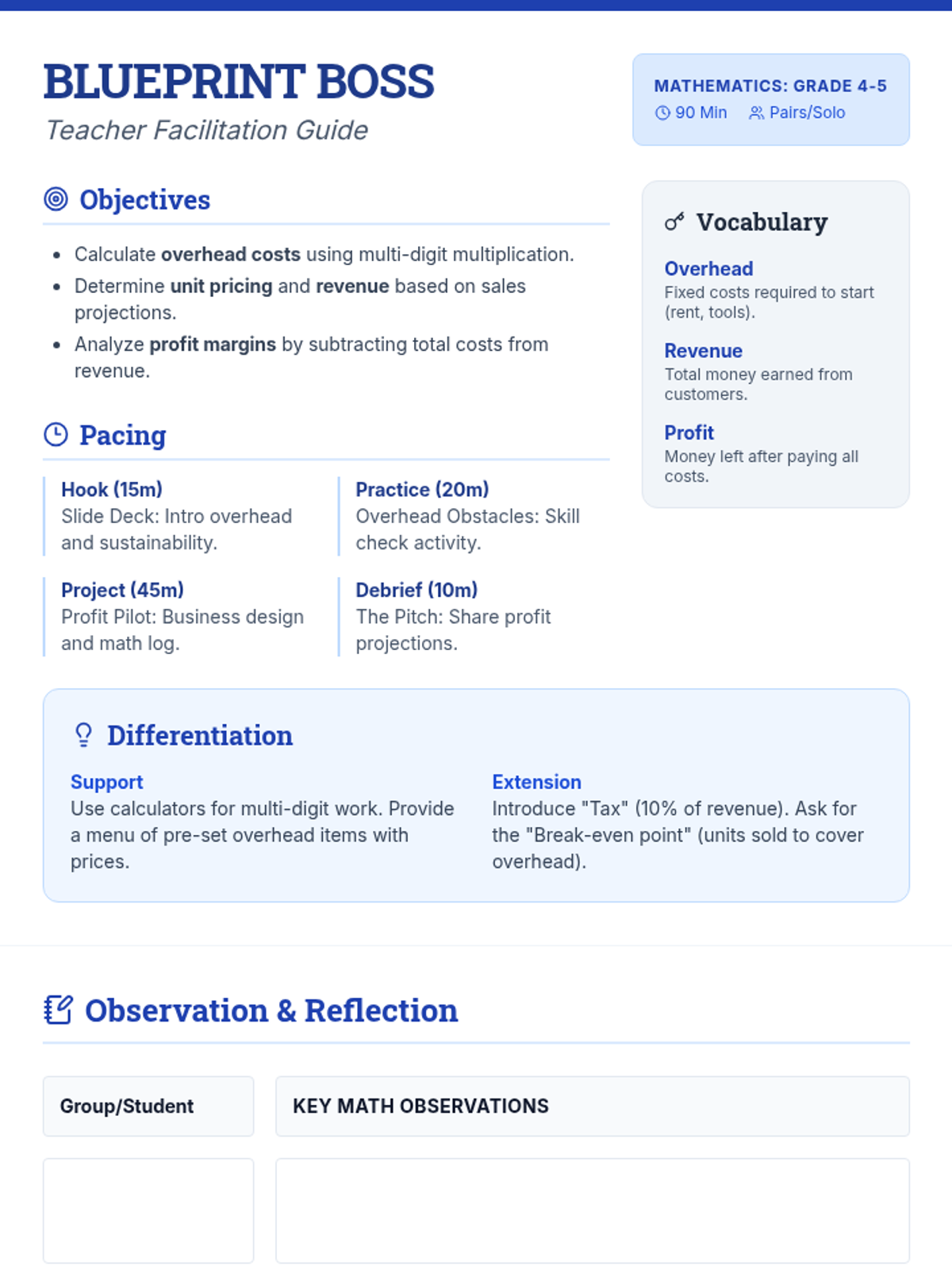 Upper elementary students step into the shoes of business owners to design a sustainable venture. They will master multiplication and division through real-world applications of overhead costs, revenue, and profit margins.