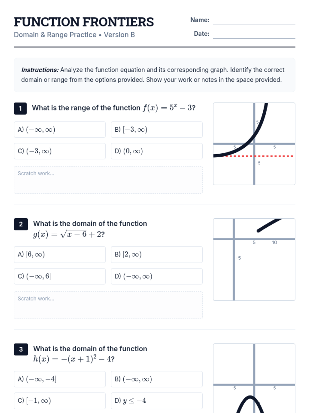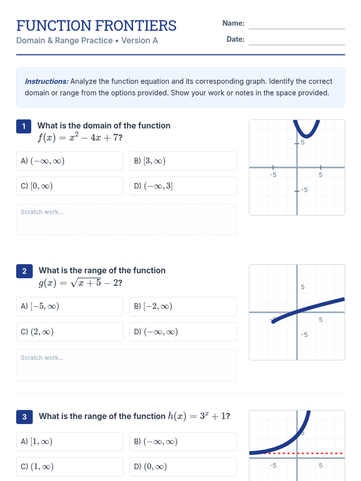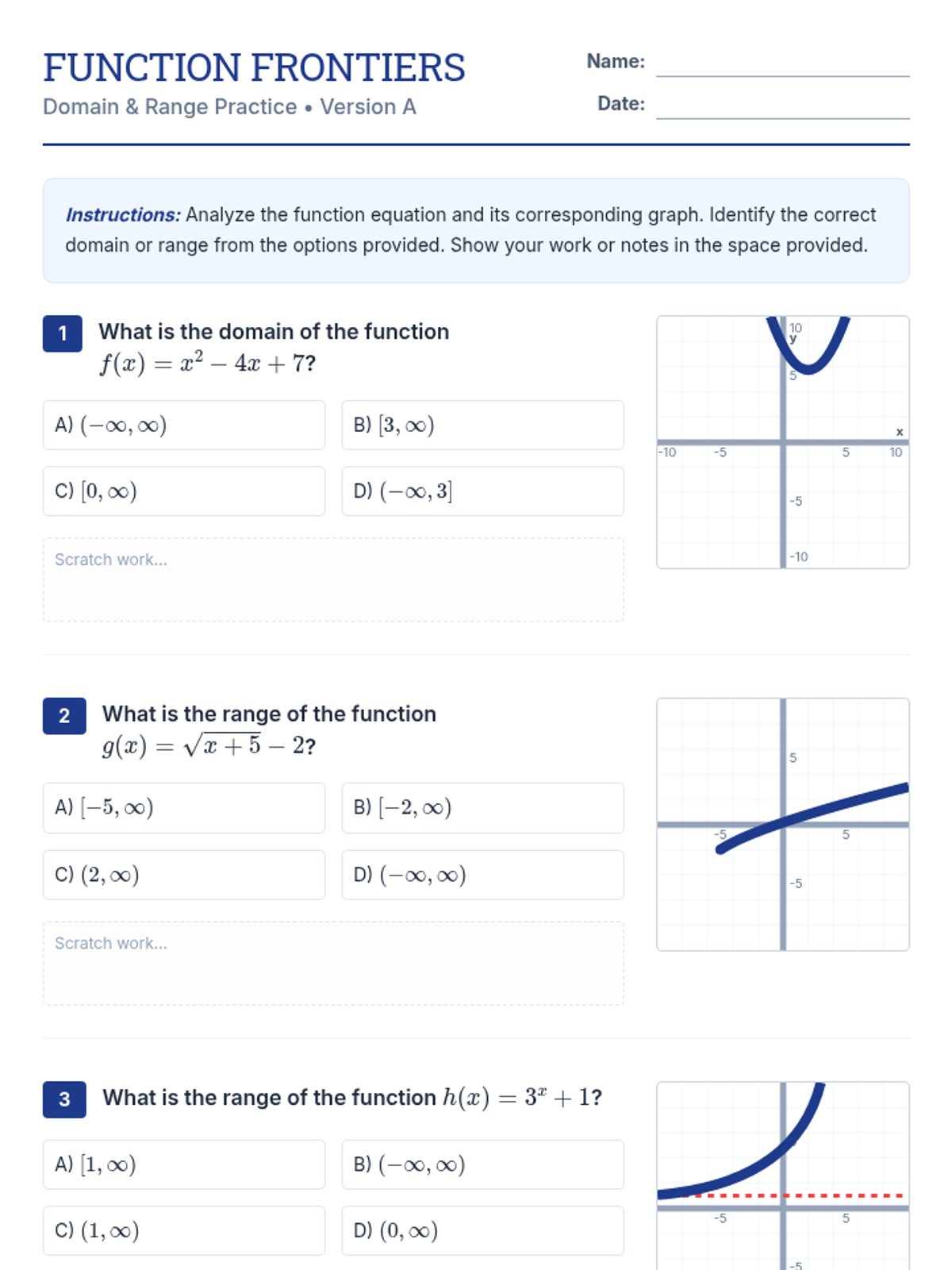 This lesson covers identifying the domain and range of exponential, square root, and quadratic functions through multiple-choice practice. Students will analyze function equations to determine possible input and output values.
