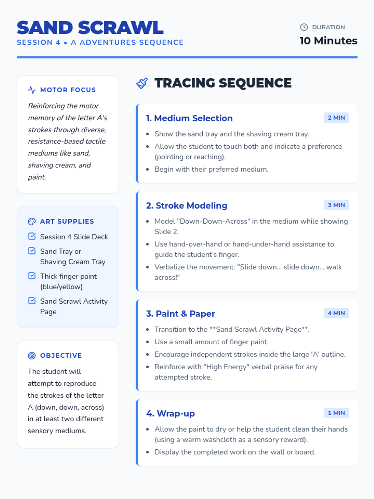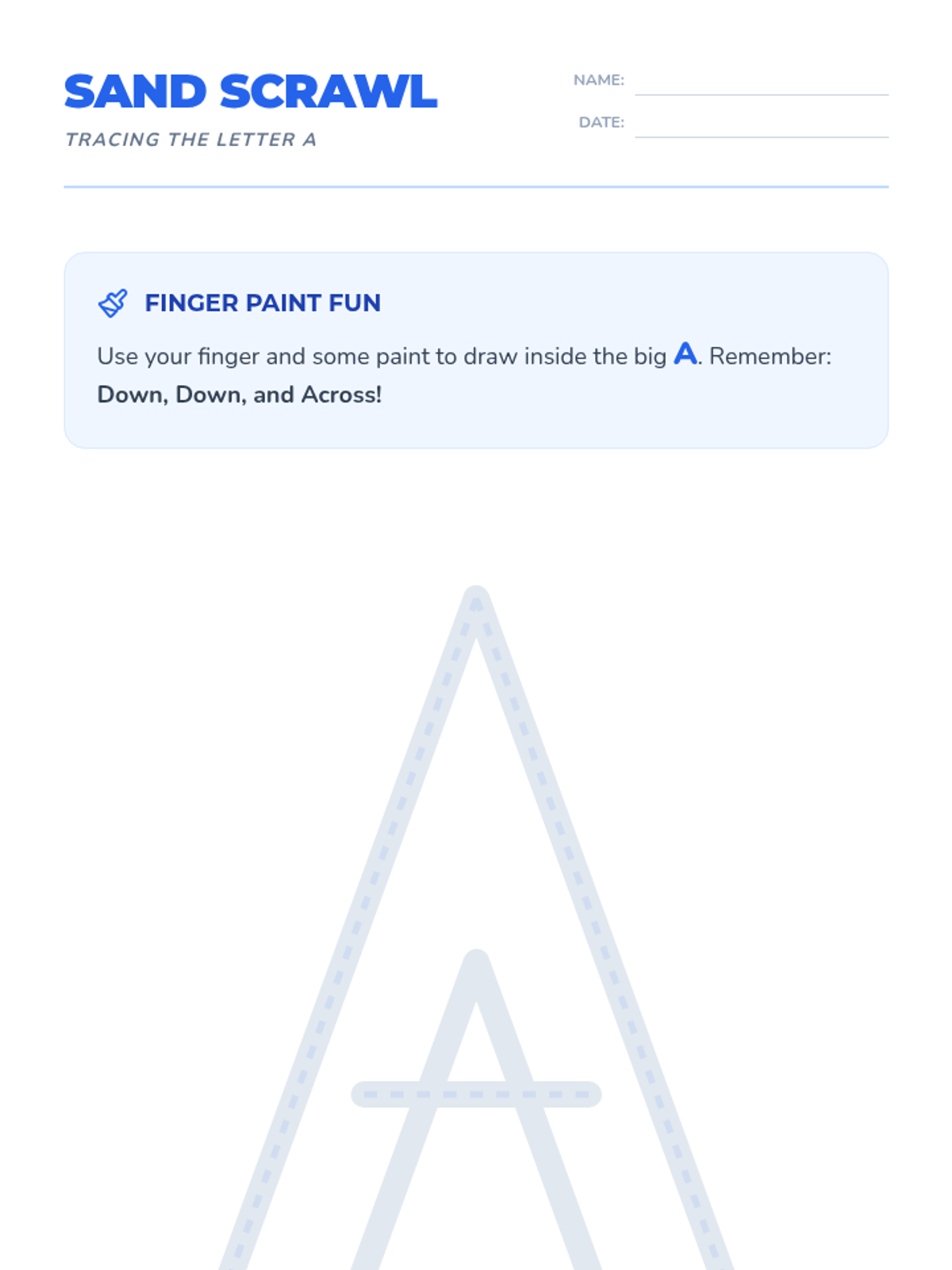 Guided tracing activities in various mediums to reinforce the motor movements of the letter A.