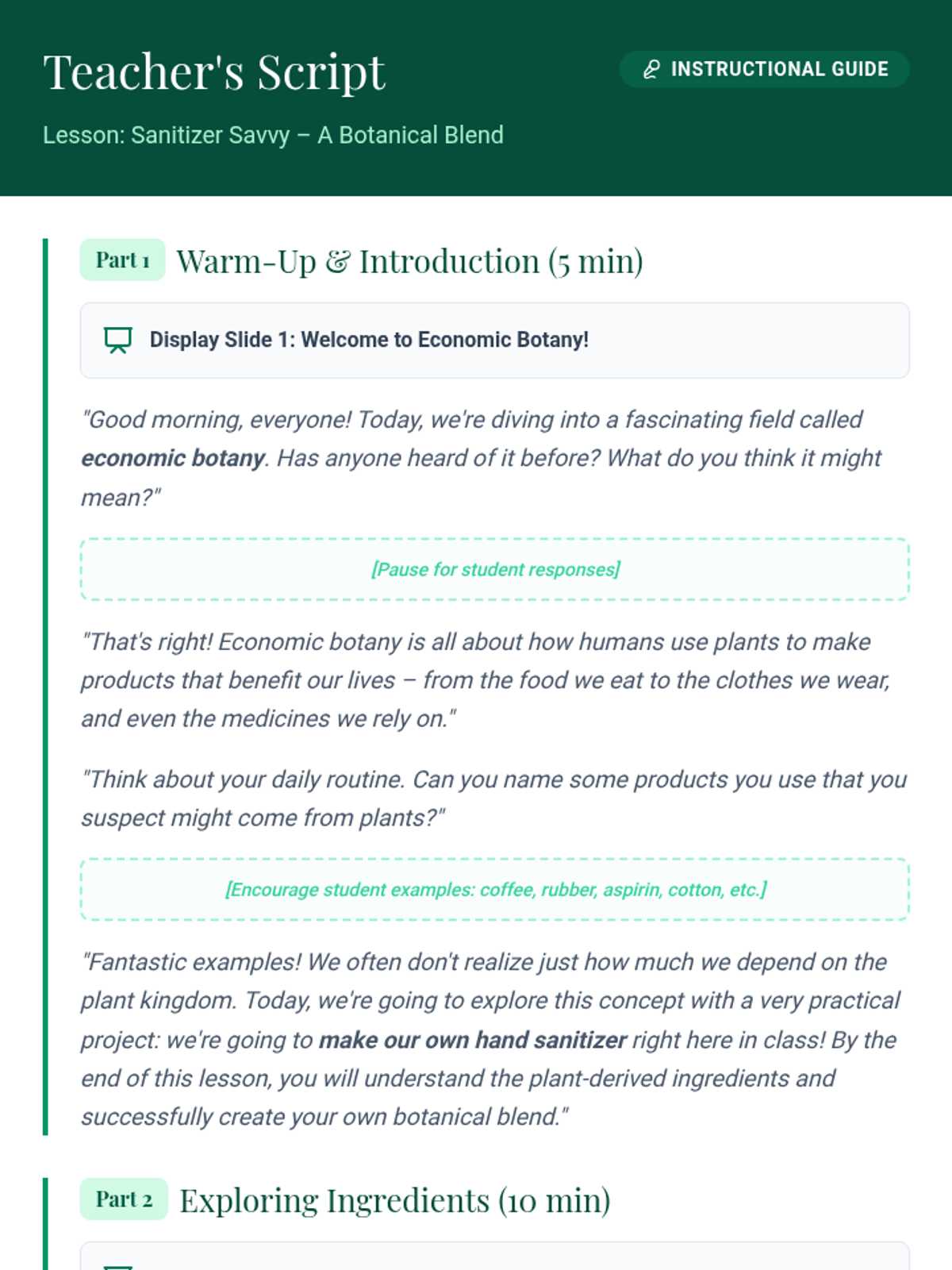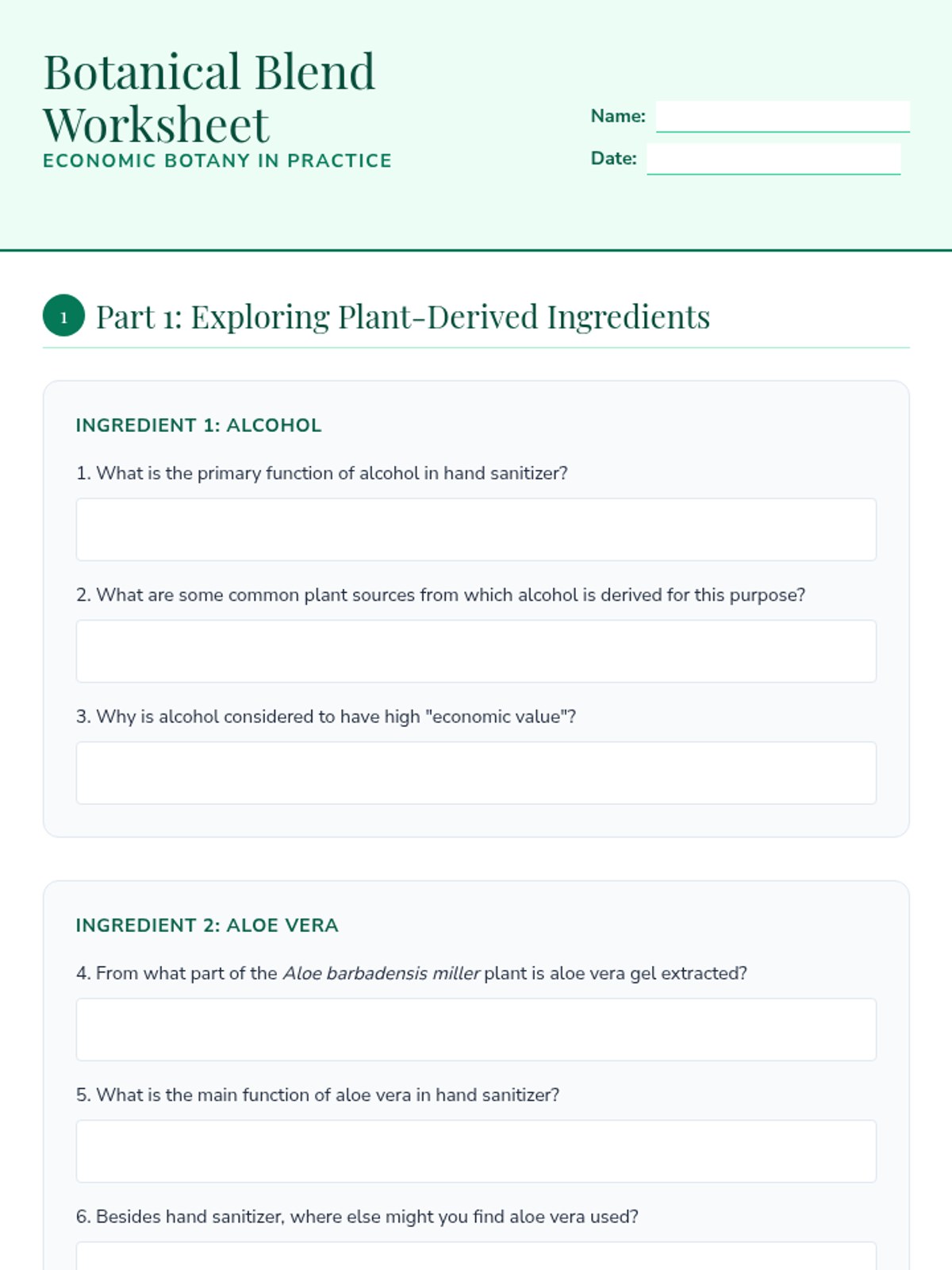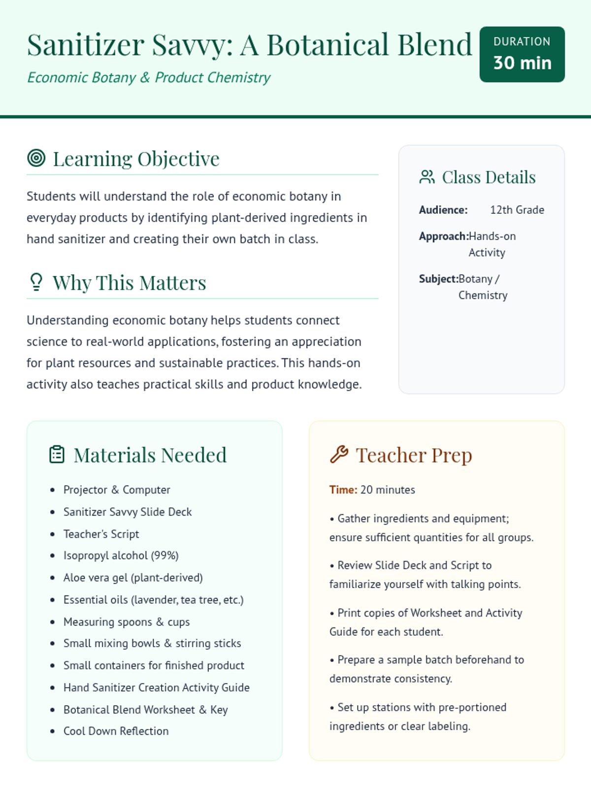 A 30-minute lesson for 12th-grade students exploring economic botany through the creation of plant-derived hand sanitizer. Students identify botanical sources of common ingredients and apply their knowledge in a hands-on laboratory activity.