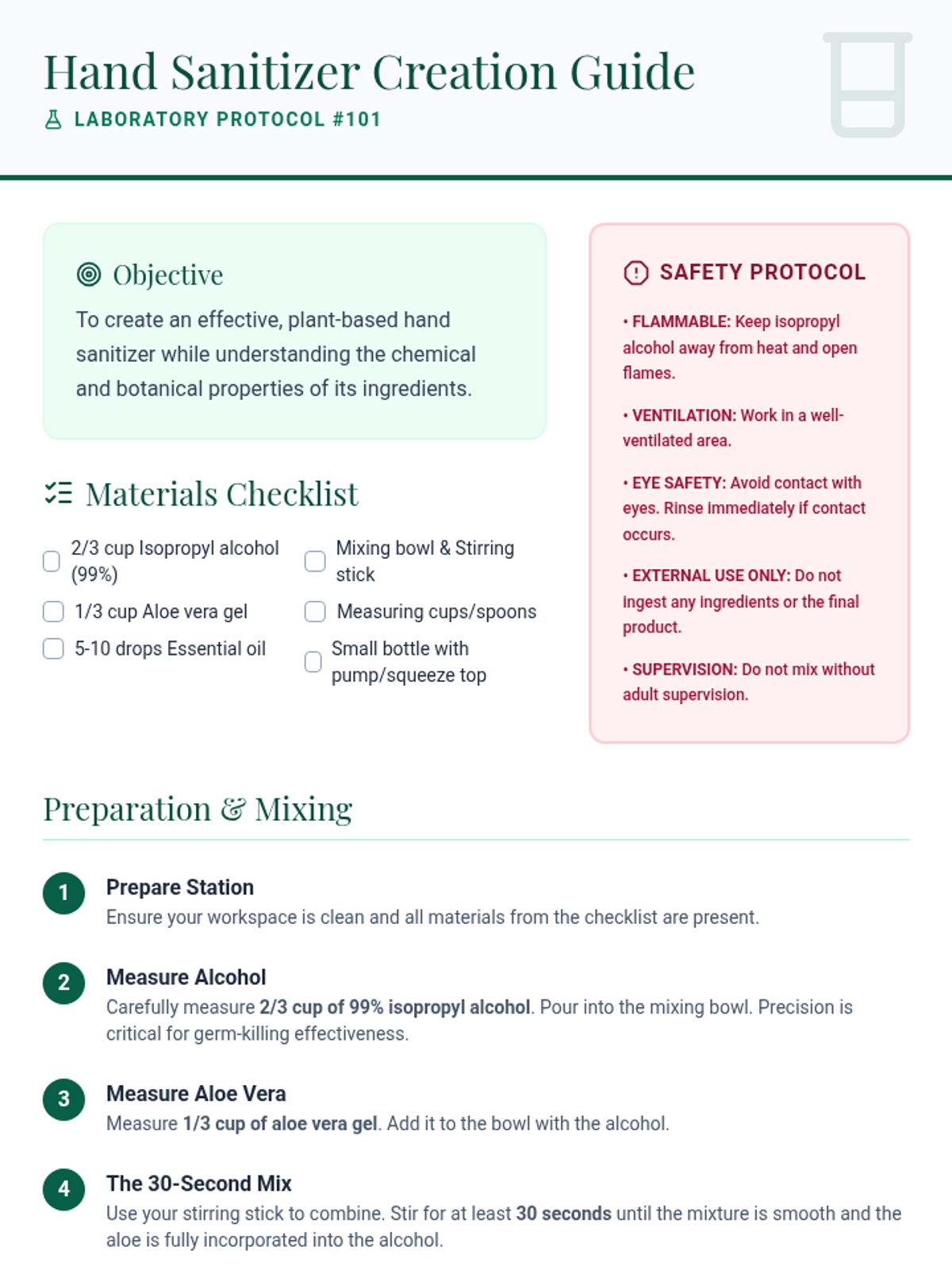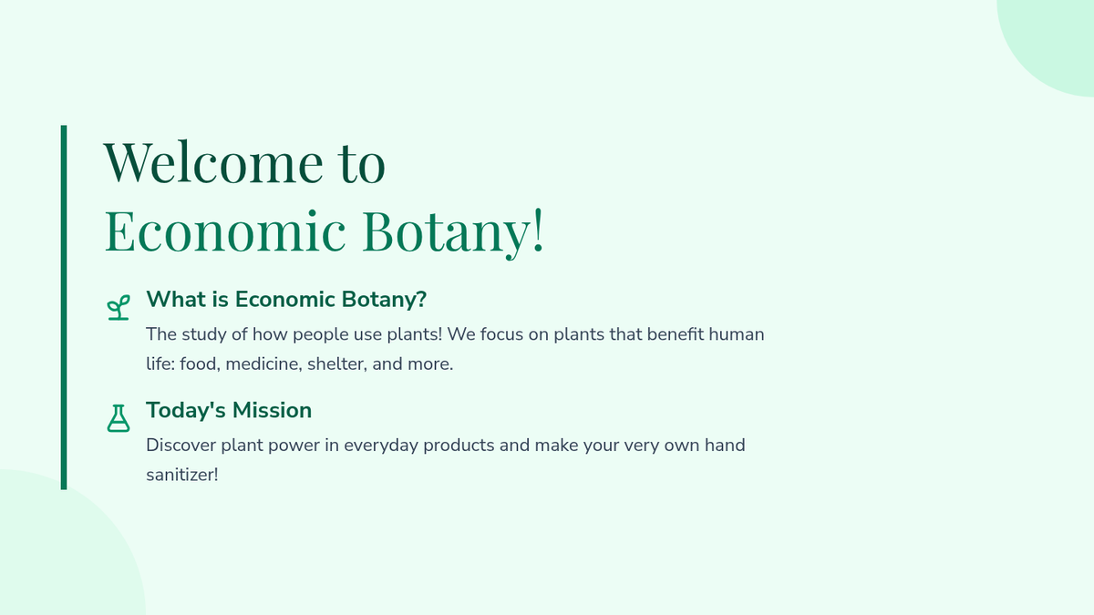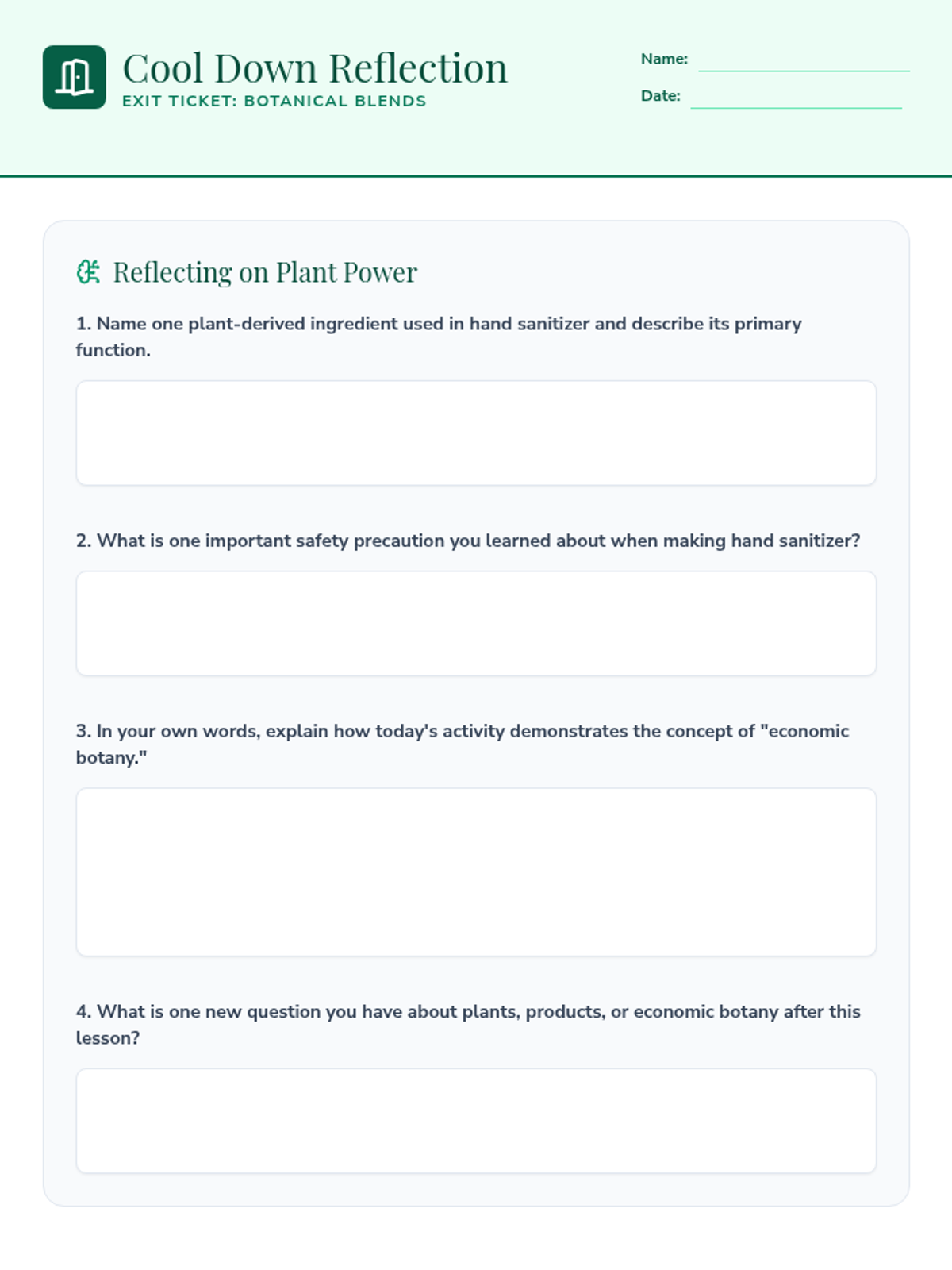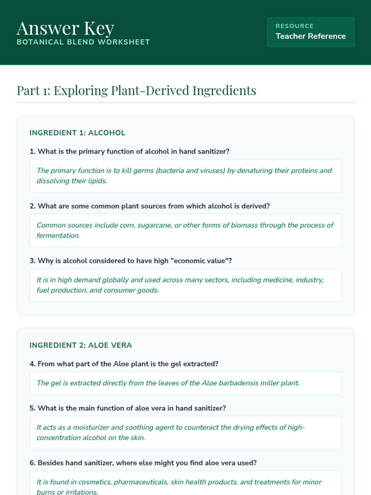 A 30-minute lesson for 12th-grade students exploring economic botany through the creation of plant-derived hand sanitizer. Students identify botanical sources of common ingredients and apply their knowledge in a hands-on laboratory activity.