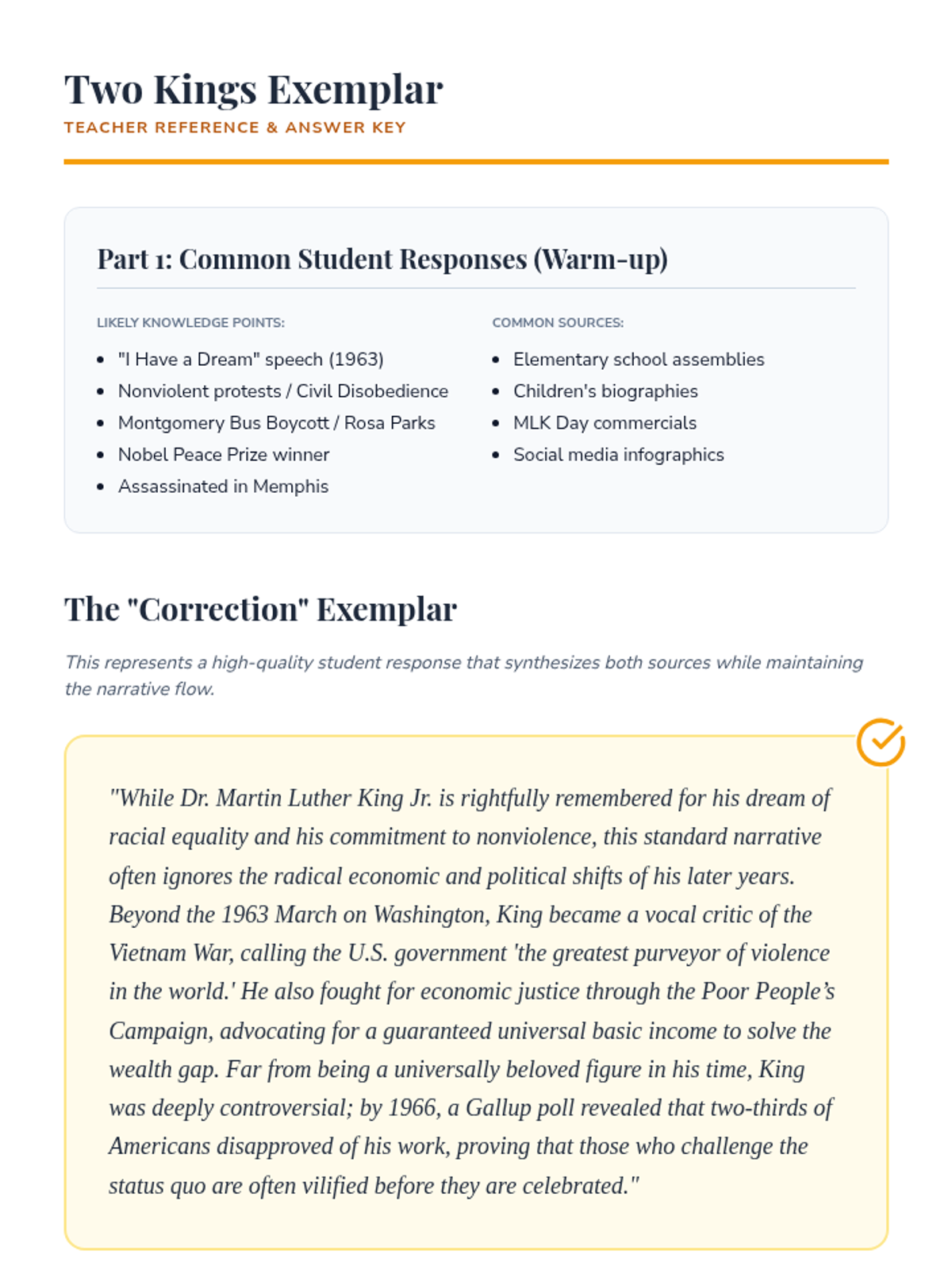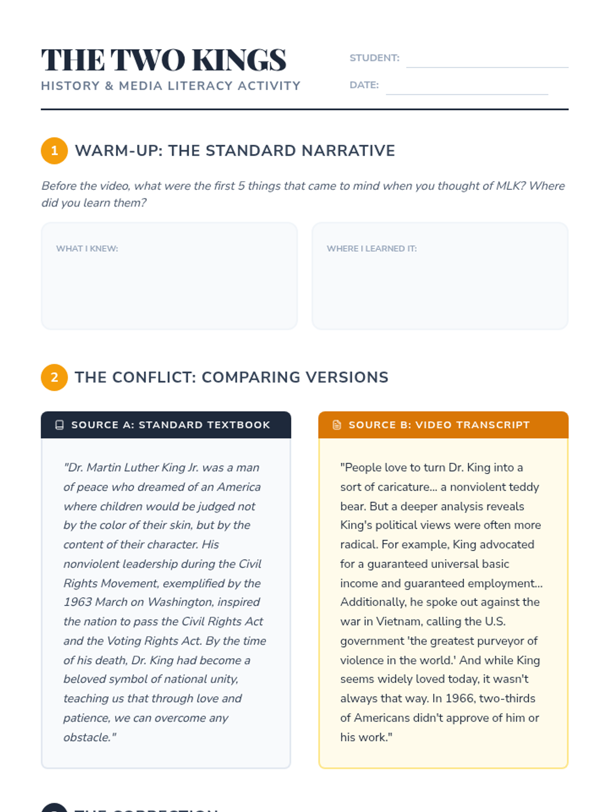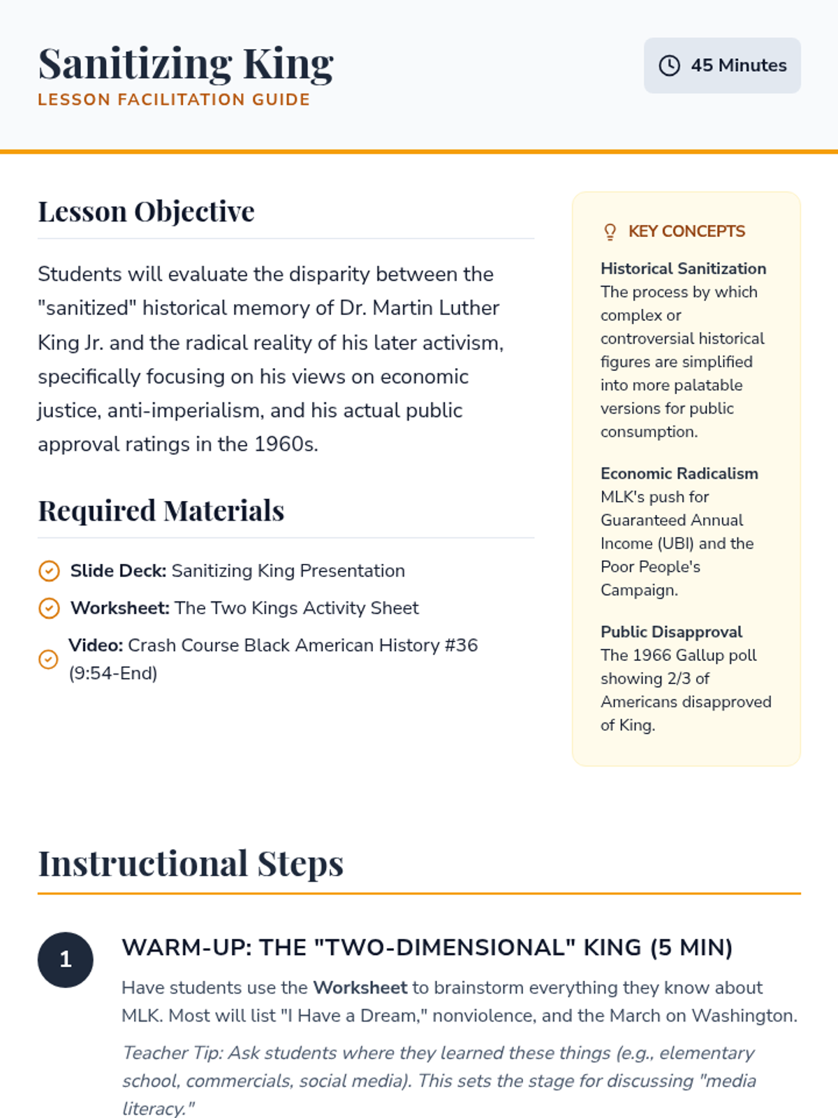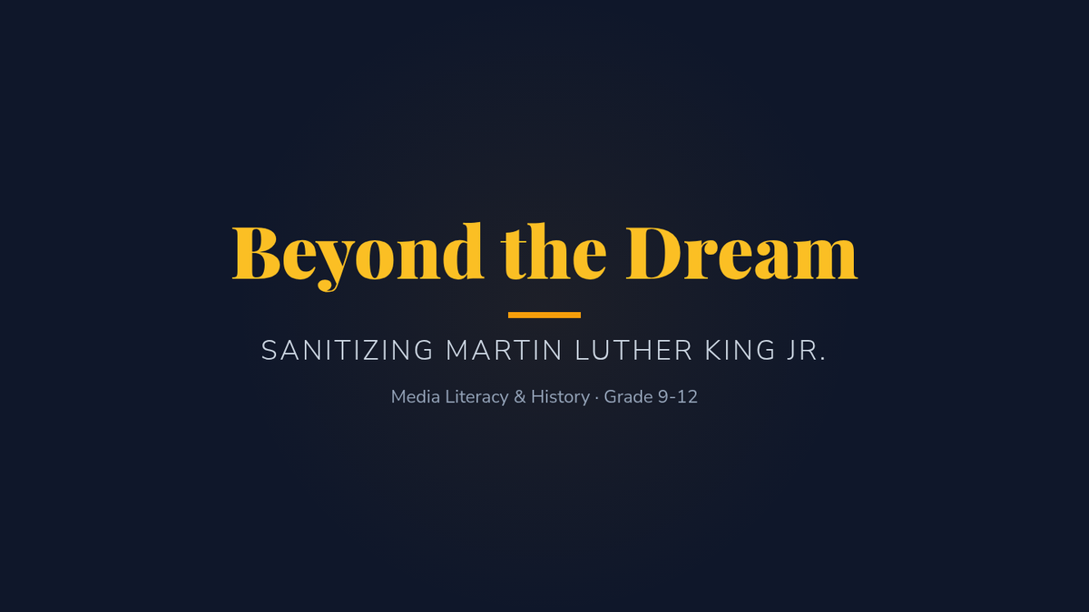 A media literacy and history lesson for high schoolers exploring the 'sanitization' of Martin Luther King Jr., comparing standard historical narratives with his more radical, lesser-known political views and the reality of his public reception.