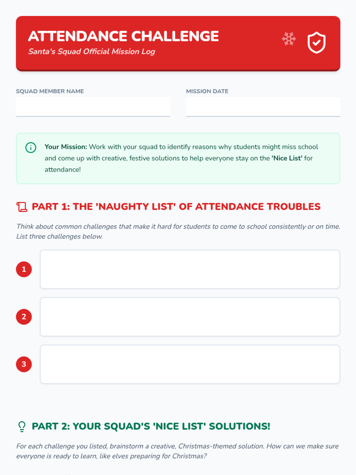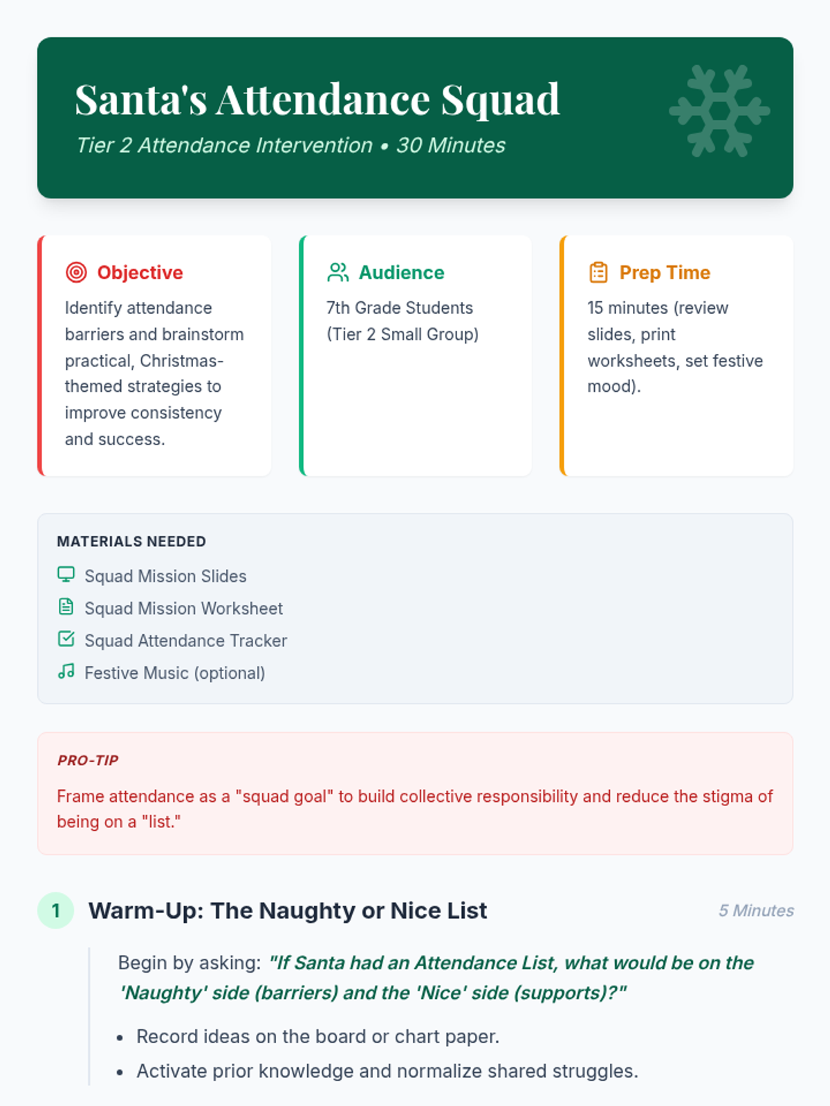 A festive 30-minute activity for 7th-grade students to explore the importance of consistent attendance, identify barriers, and create personalized strategies to stay on track during the holiday season.