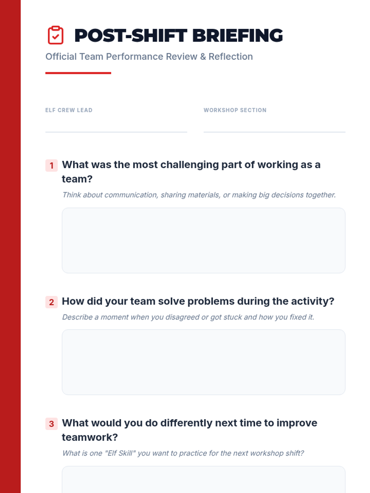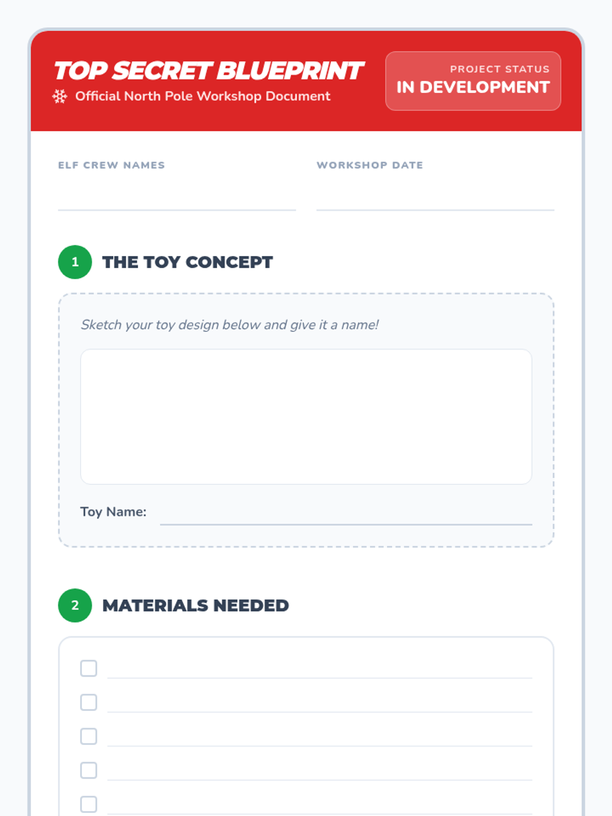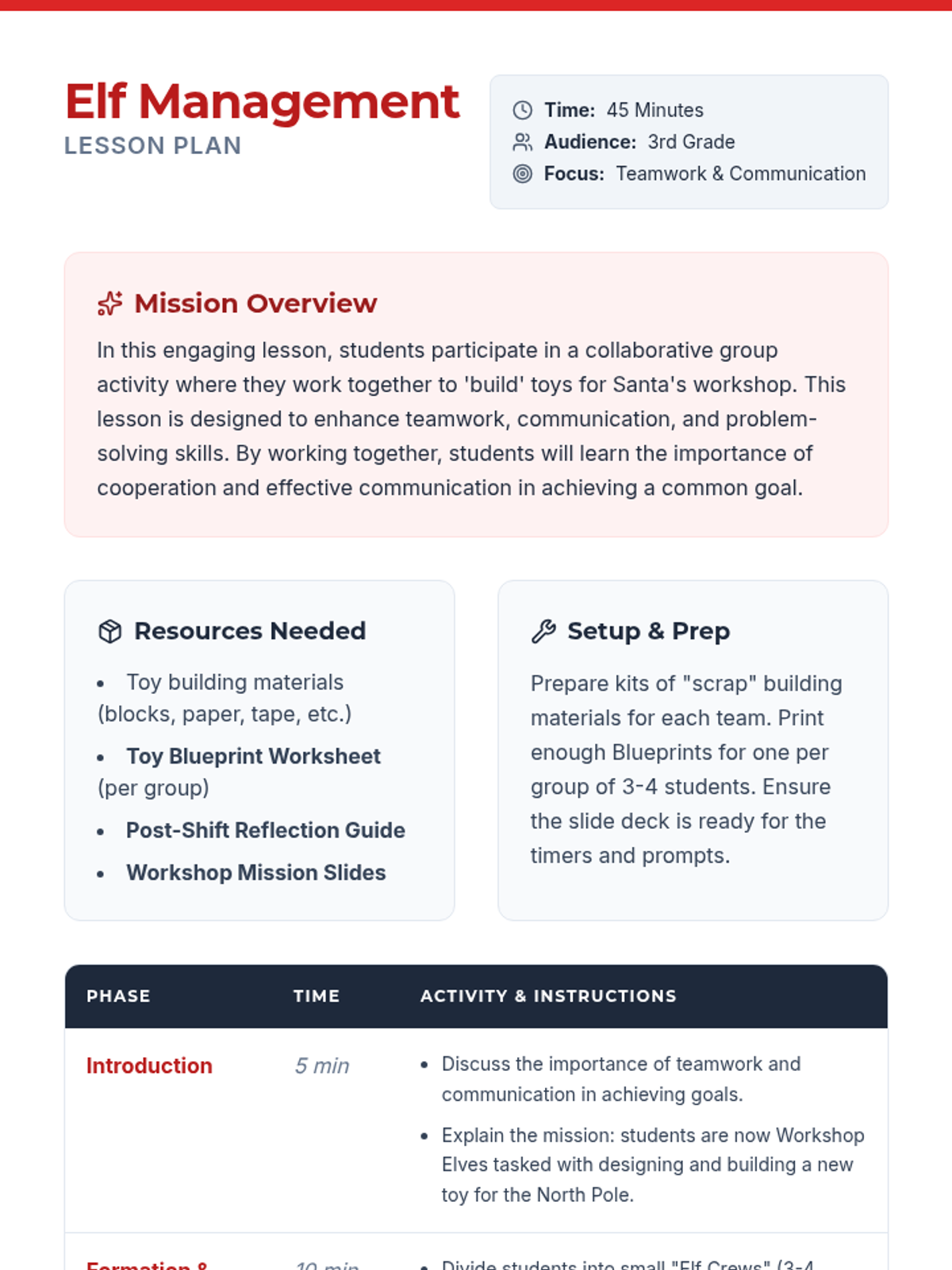 A collaborative team-building lesson where students work in teams to design and 'build' toys for Santa's workshop, focusing on teamwork and communication.