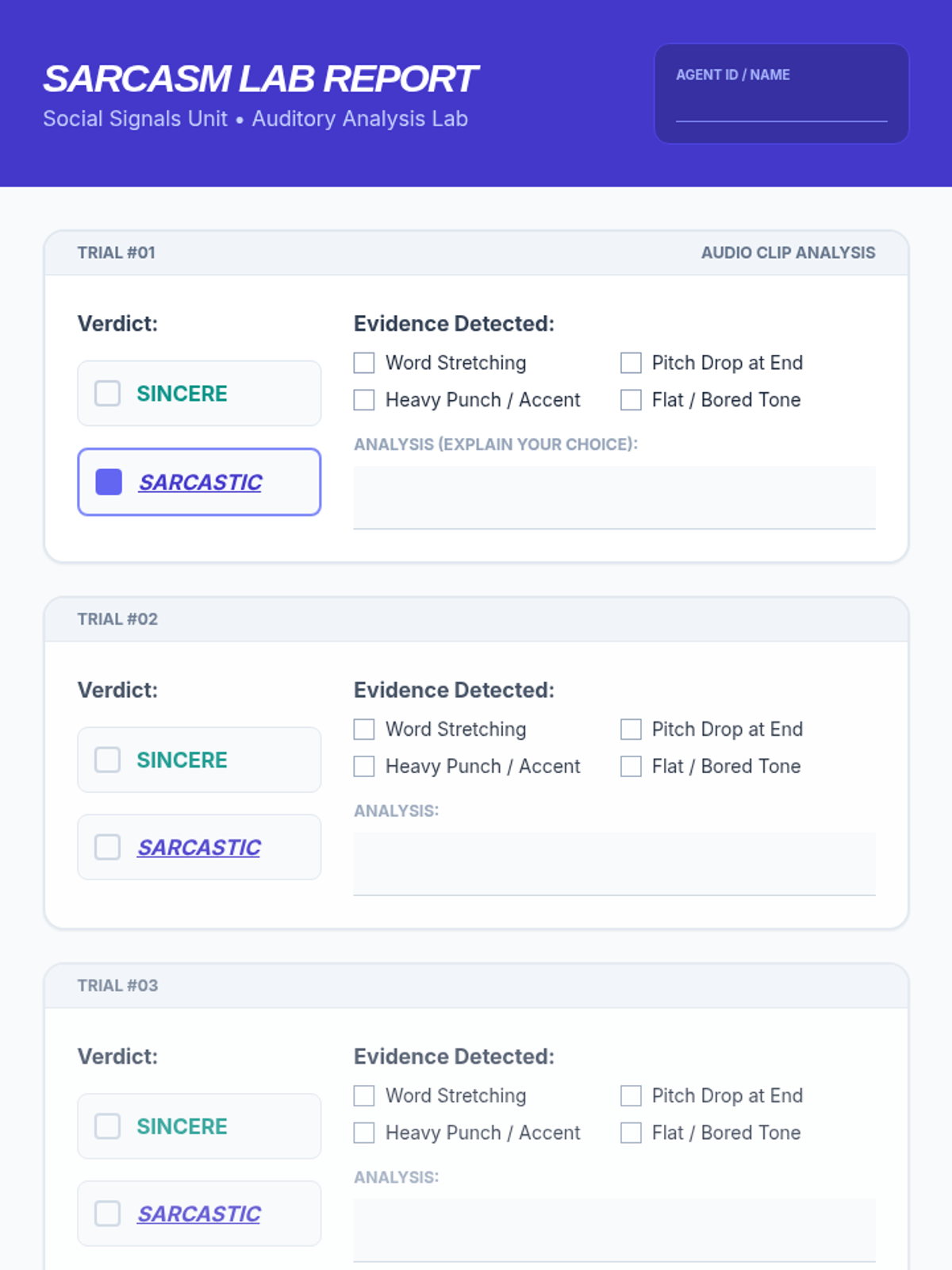 Students practice active listening to categorize audio clips as sincere or sarcastic based on vocal speed, pitch, and word elongation.