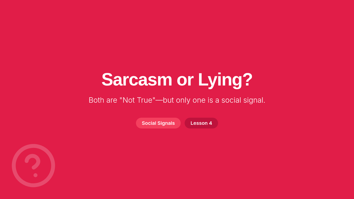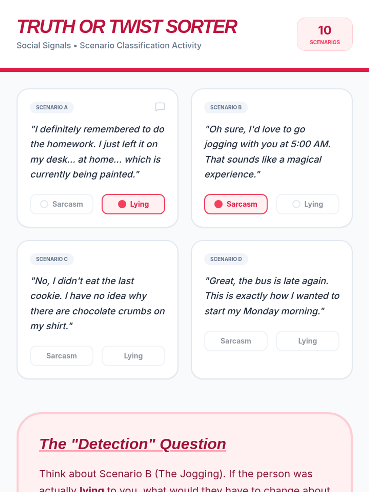 Students analyze scenarios to distinguish between the intent of sarcasm (humor/cynicism) and the intent of lying (deception).
