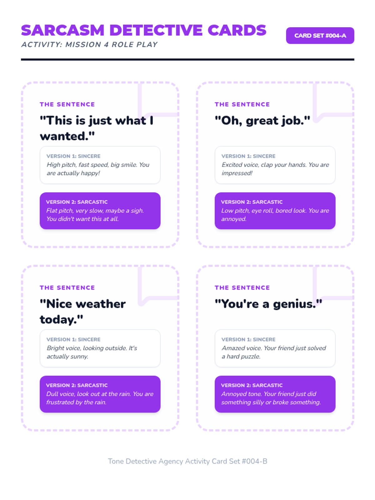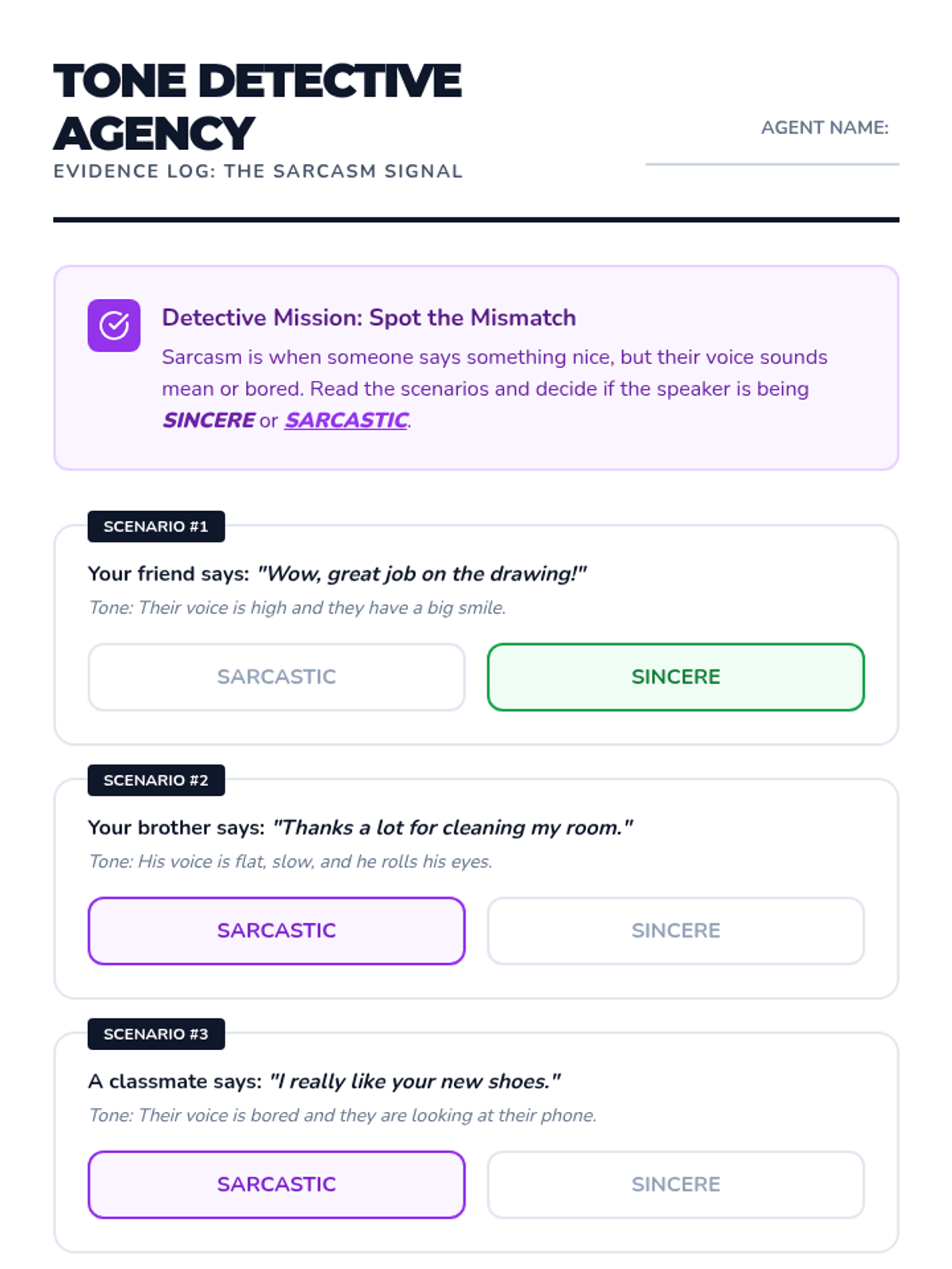 Students identify the 'mismatch' between words and tone to detect sarcasm and disagreement.