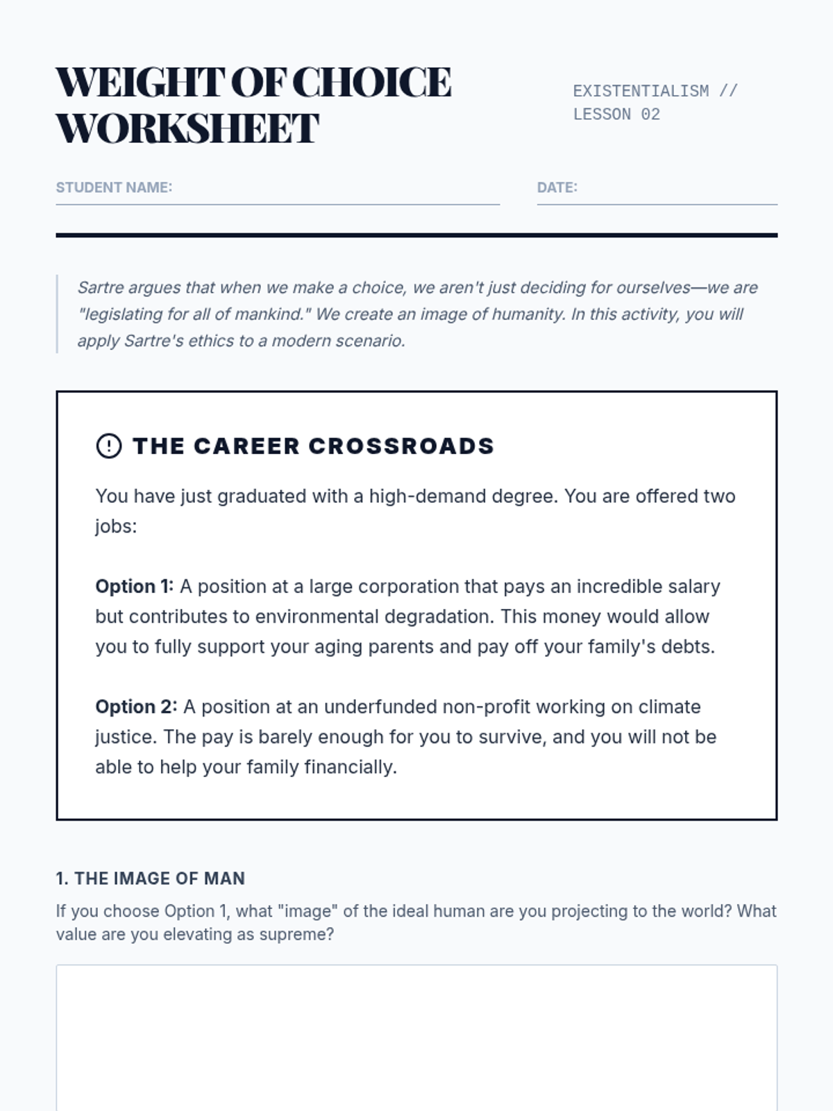 Investigate Sartre's foundational claim that existence precedes essence and the ethical implications of absolute human freedom.