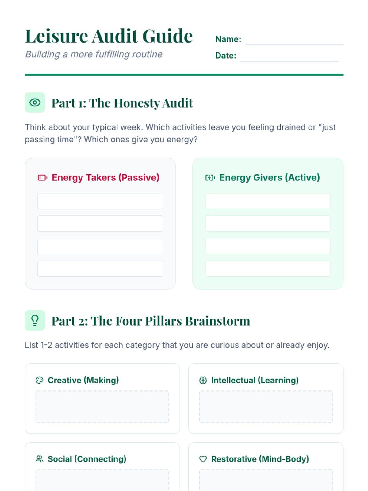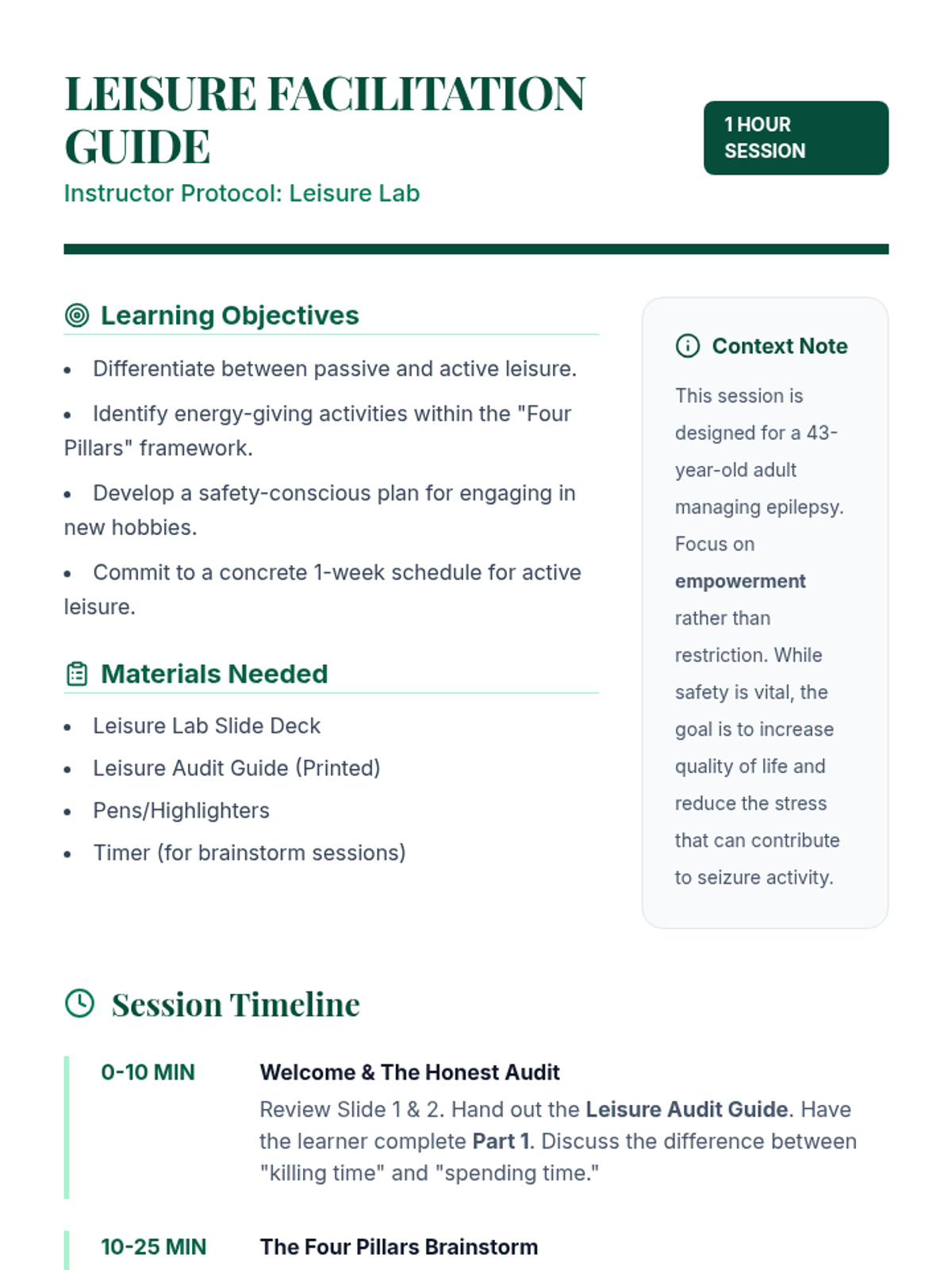 A comprehensive 1-hour lesson designed to help a 43-year-old woman with epilepsy transition from passive leisure to active, satisfying engagement. The lesson covers self-auditing current habits, identifying energy-giving activities, and planning for safe, fulfilling hobbies.
