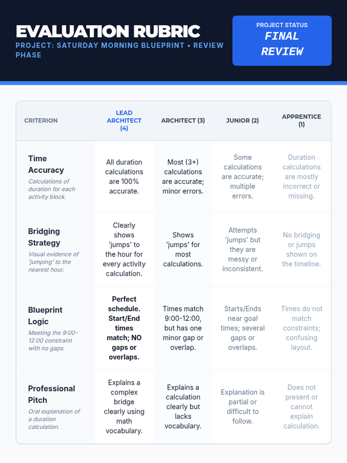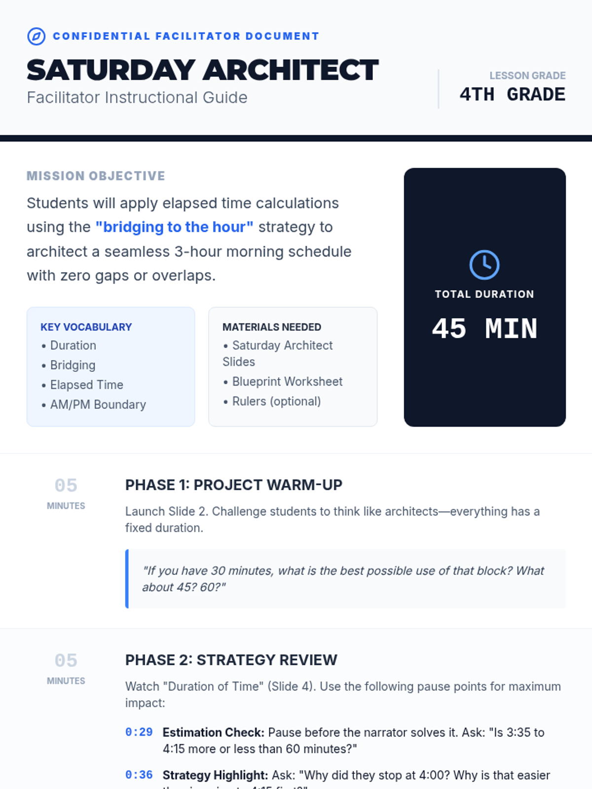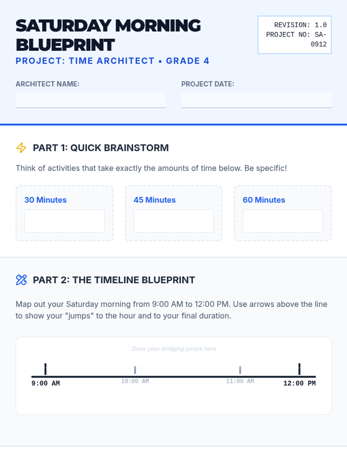 Students become 'Time Architects' as they master elapsed time. They will learn the 'bridging to the hour' strategy through a video review and then design a perfect Saturday morning schedule from 9:00 AM to 12:00 PM with no gaps or overlaps.