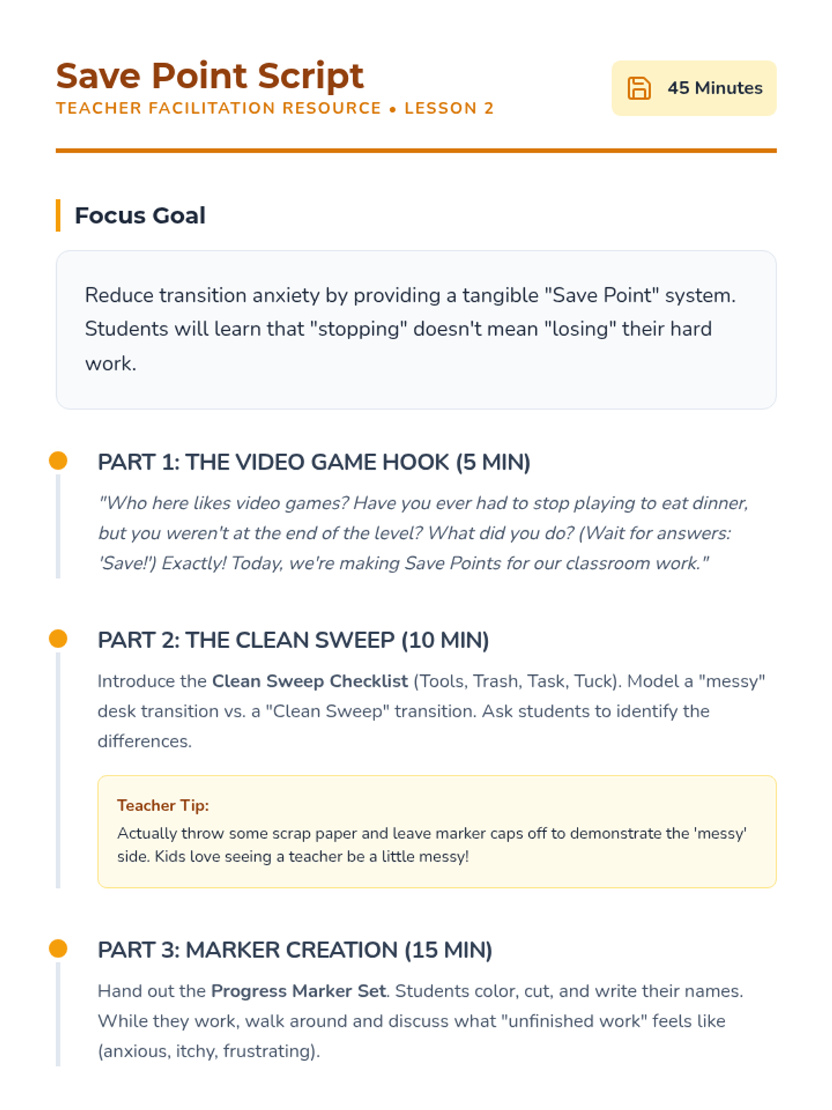 Focuses on the organization of materials and using 'Save Point' markers to reduce anxiety when pausing incomplete tasks.