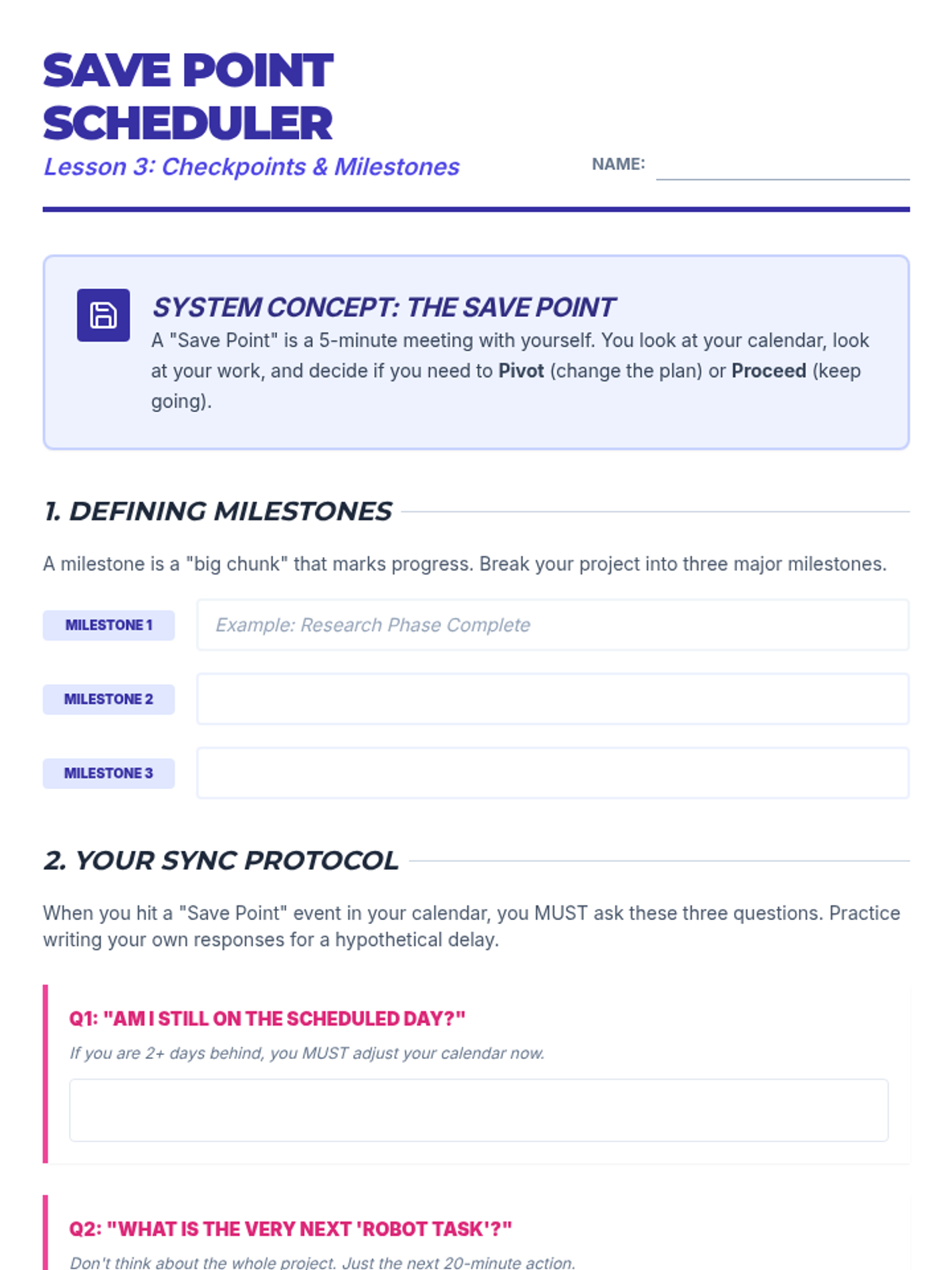 Students learn to schedule 'check-in' appointments and milestones that act as 'save points' to assess their progress and adjust their plans.
