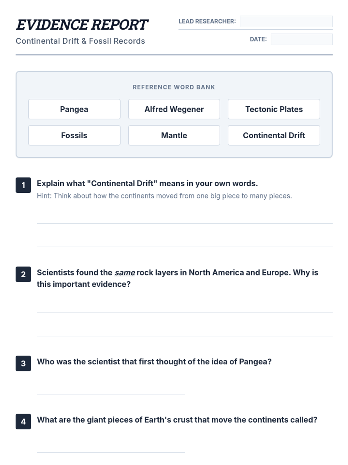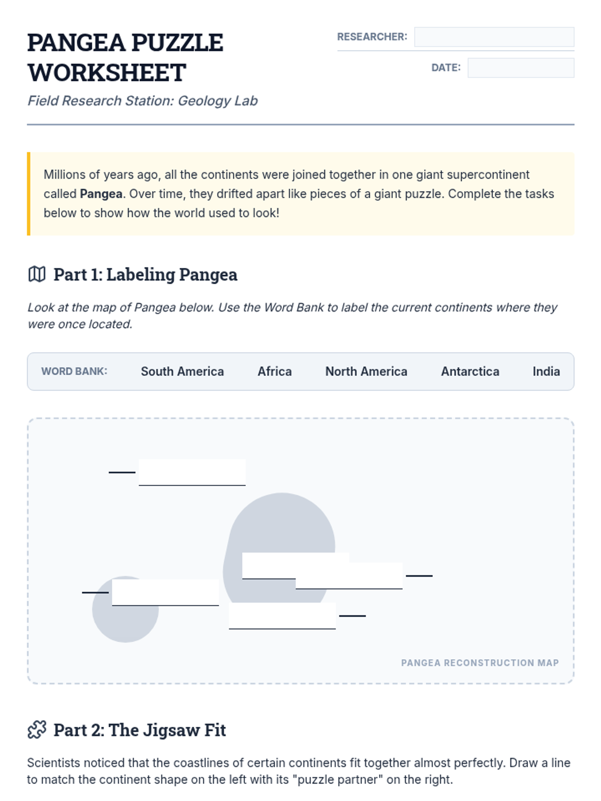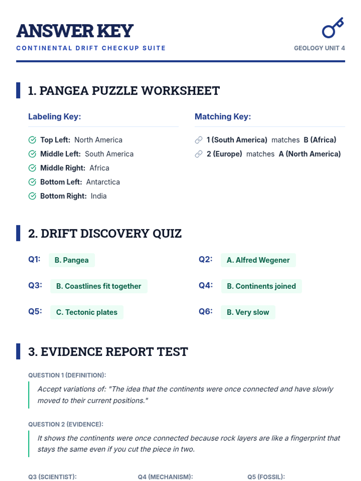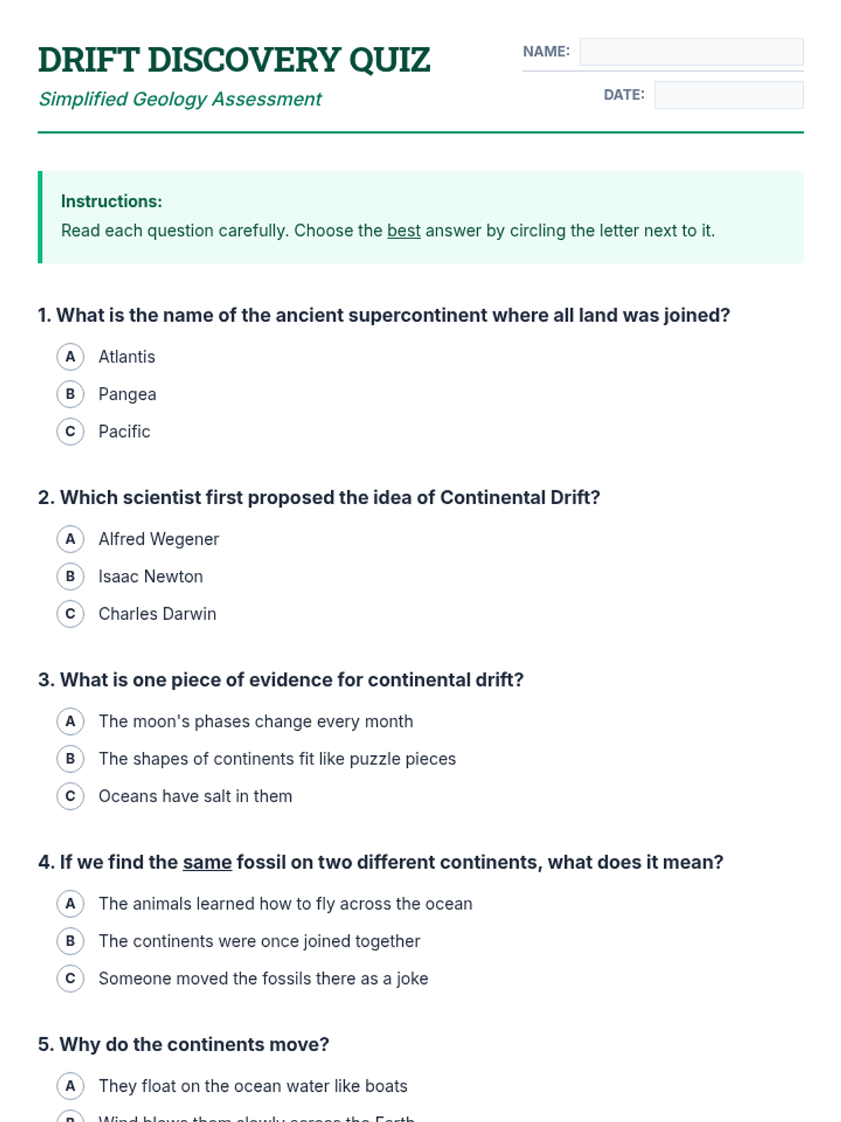 A comprehensive assessment suite covering continental drift, Pangea, and geological evidence through visual labeling, simplified quizzes, and short-answer prompts.