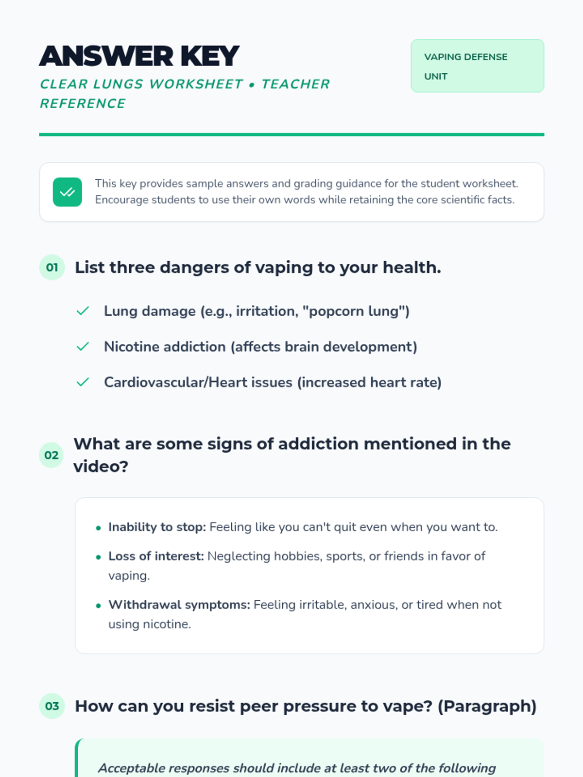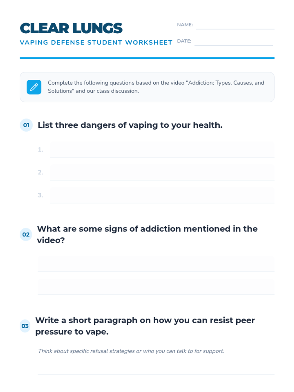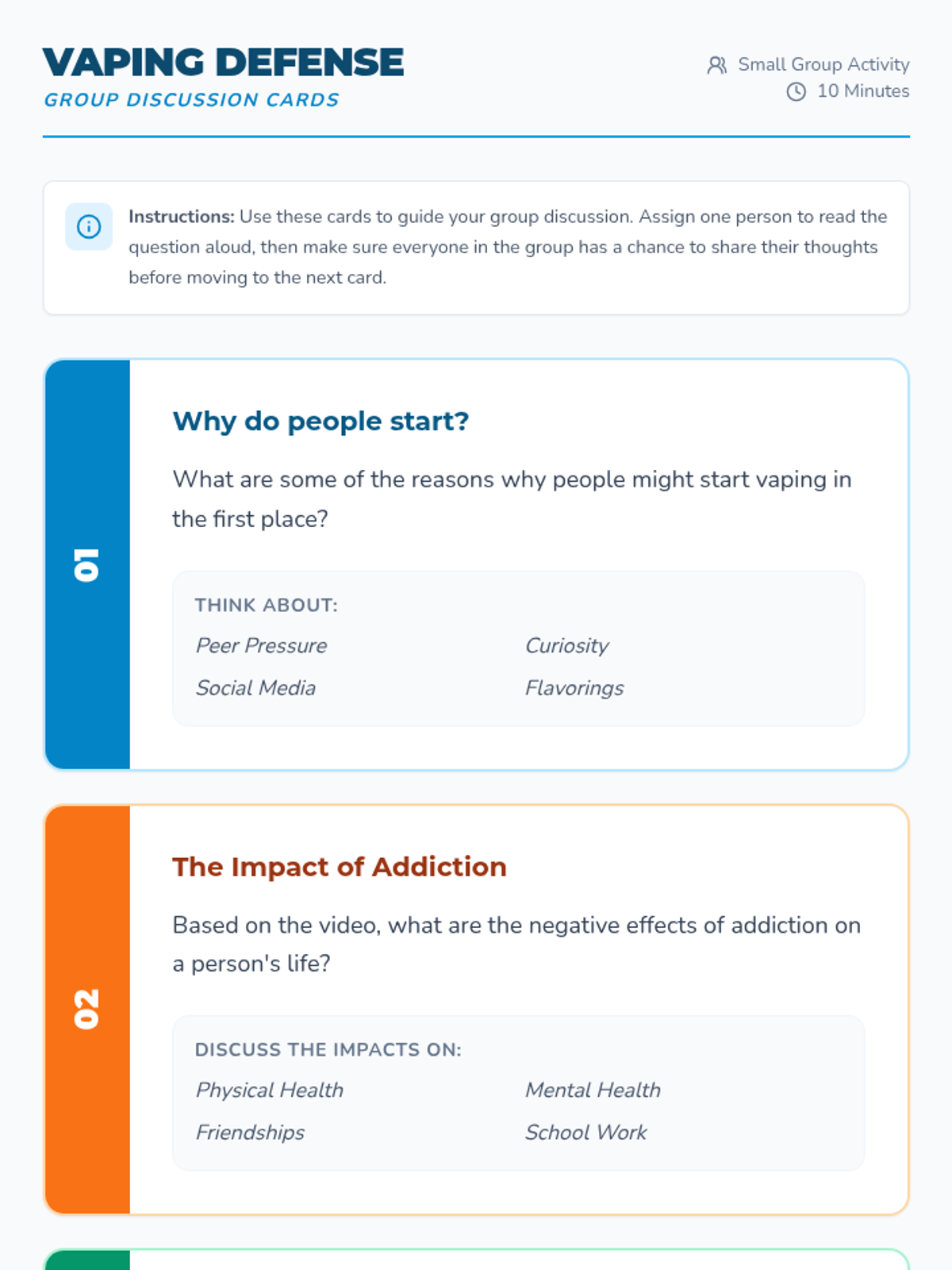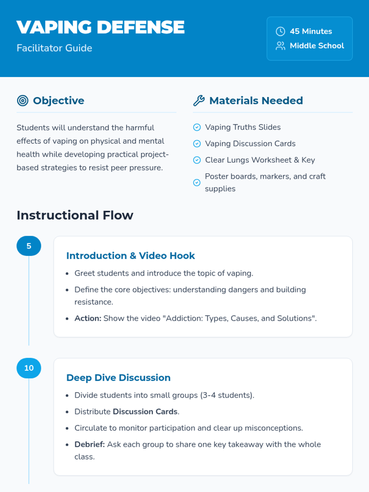A comprehensive 45-minute lesson designed to educate middle school students on the health risks of vaping and provide them with concrete refusal skills for peer pressure situations.