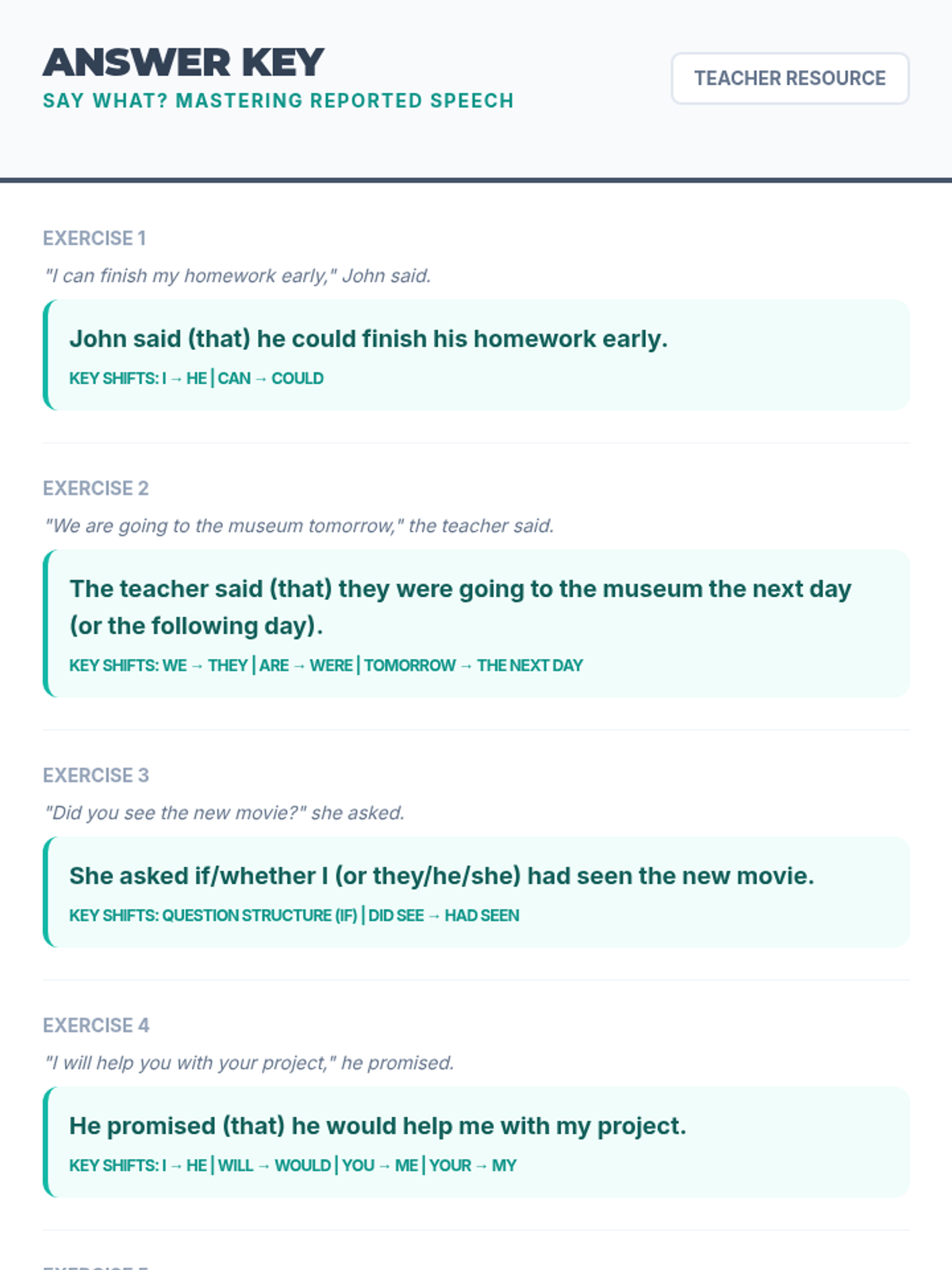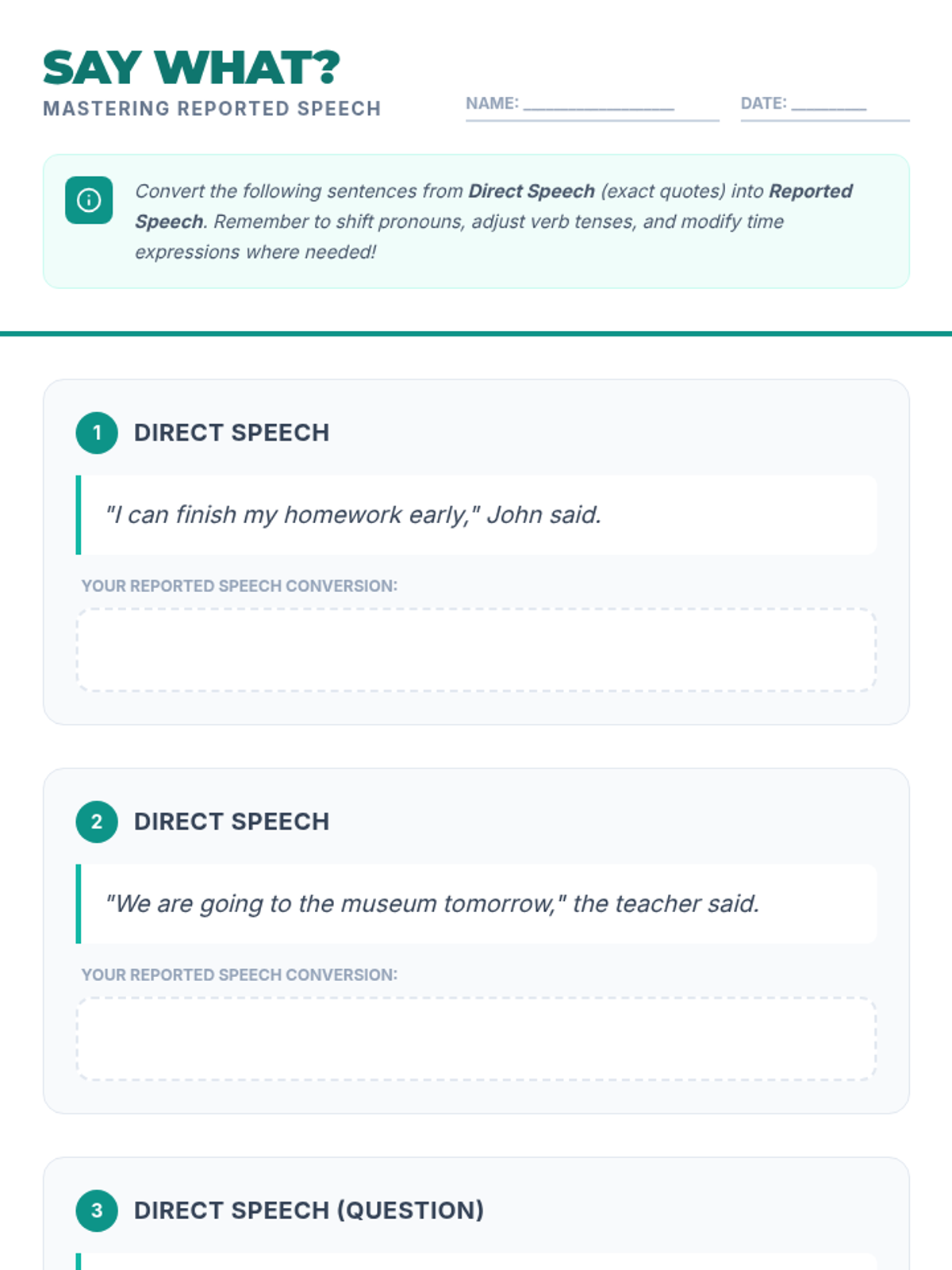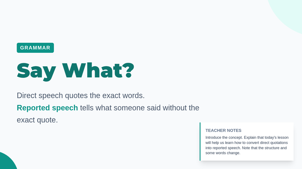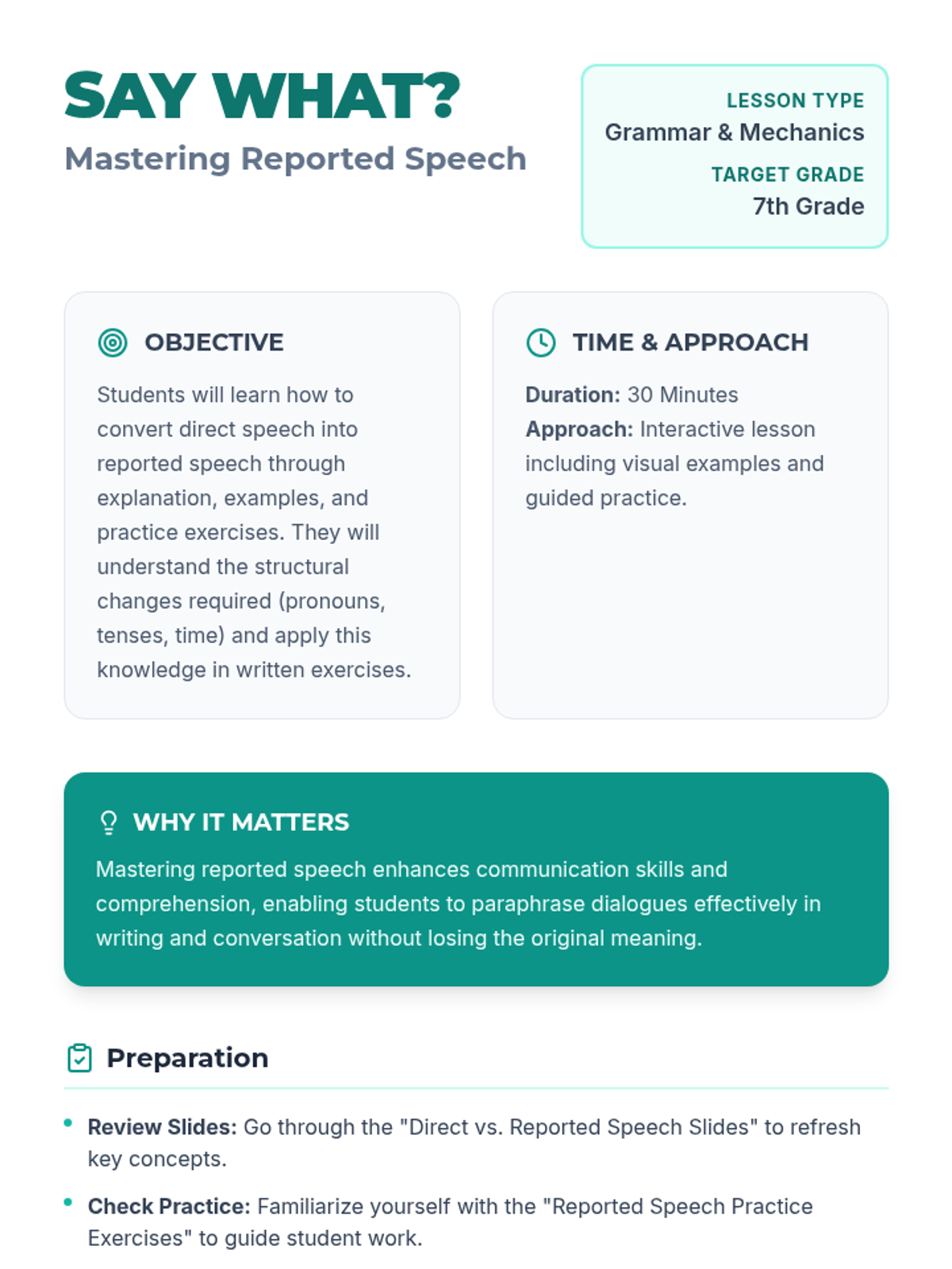 This lesson introduces 7th-grade students to the concept of reported speech, helping them understand how to convert direct speech into reported speech with a focus on pronoun and tense shifts.