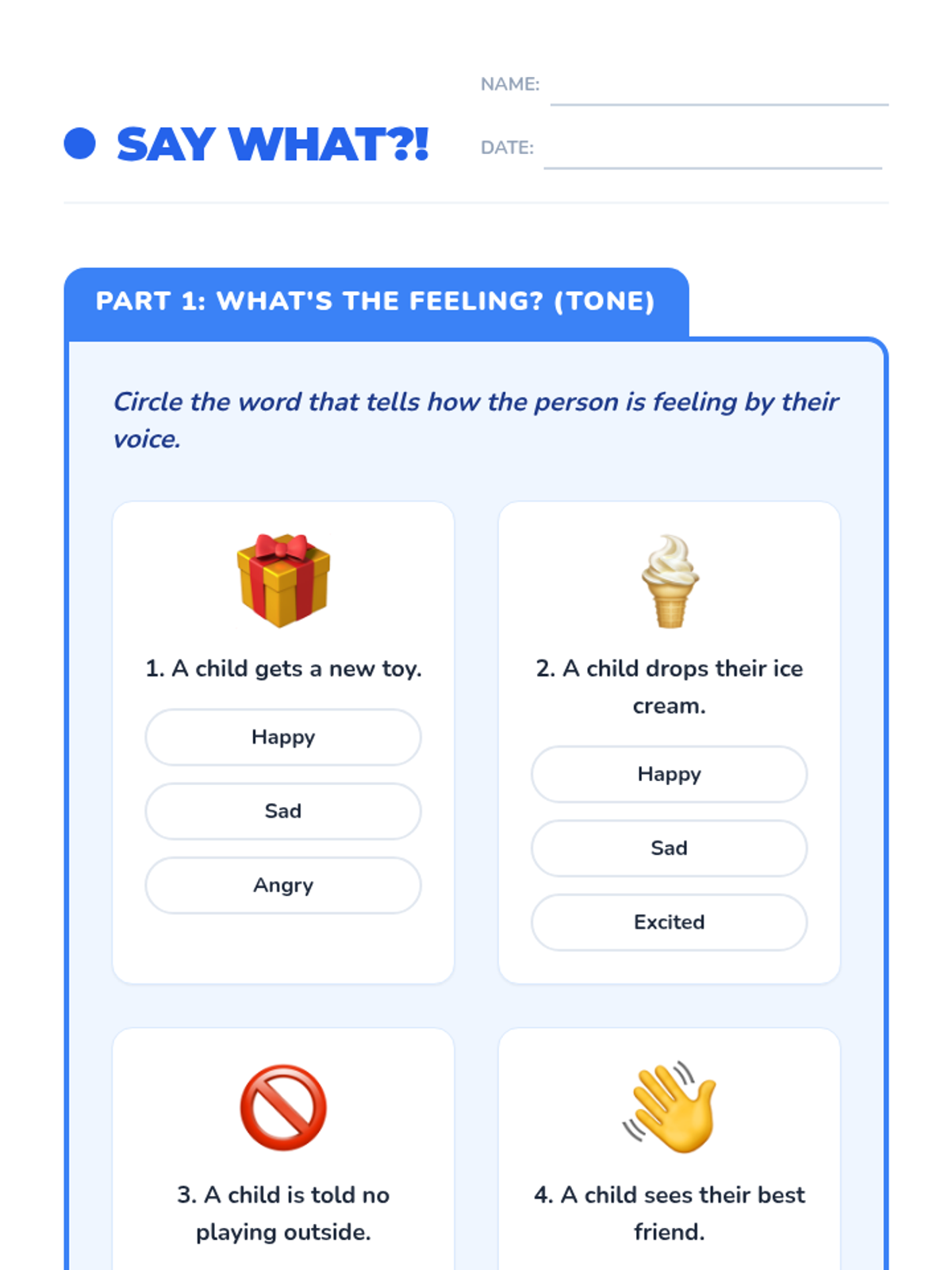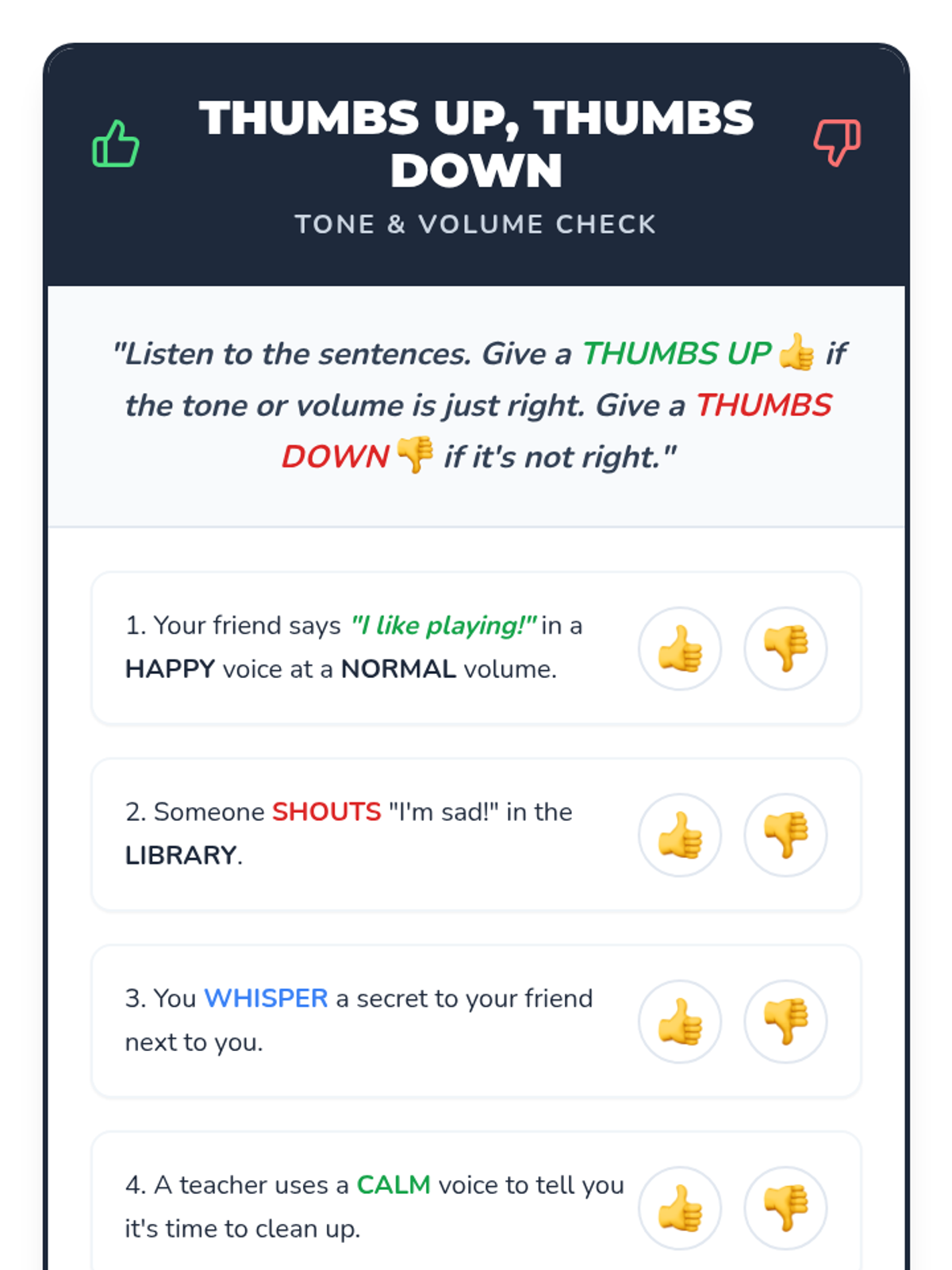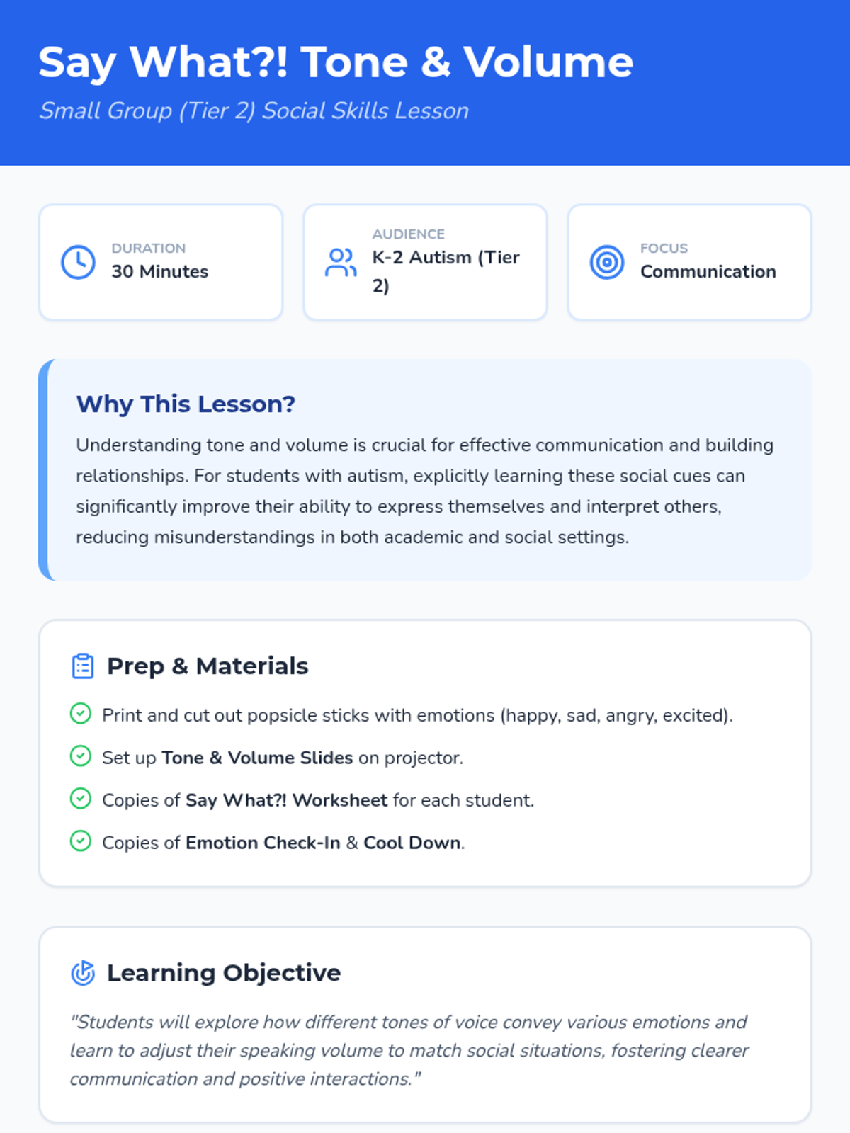 This lesson helps K-2 students with autism understand how their tone of voice and speaking volume impact communication. Through interactive role-playing and visual aids, students learn to adjust their voices to match different social situations.