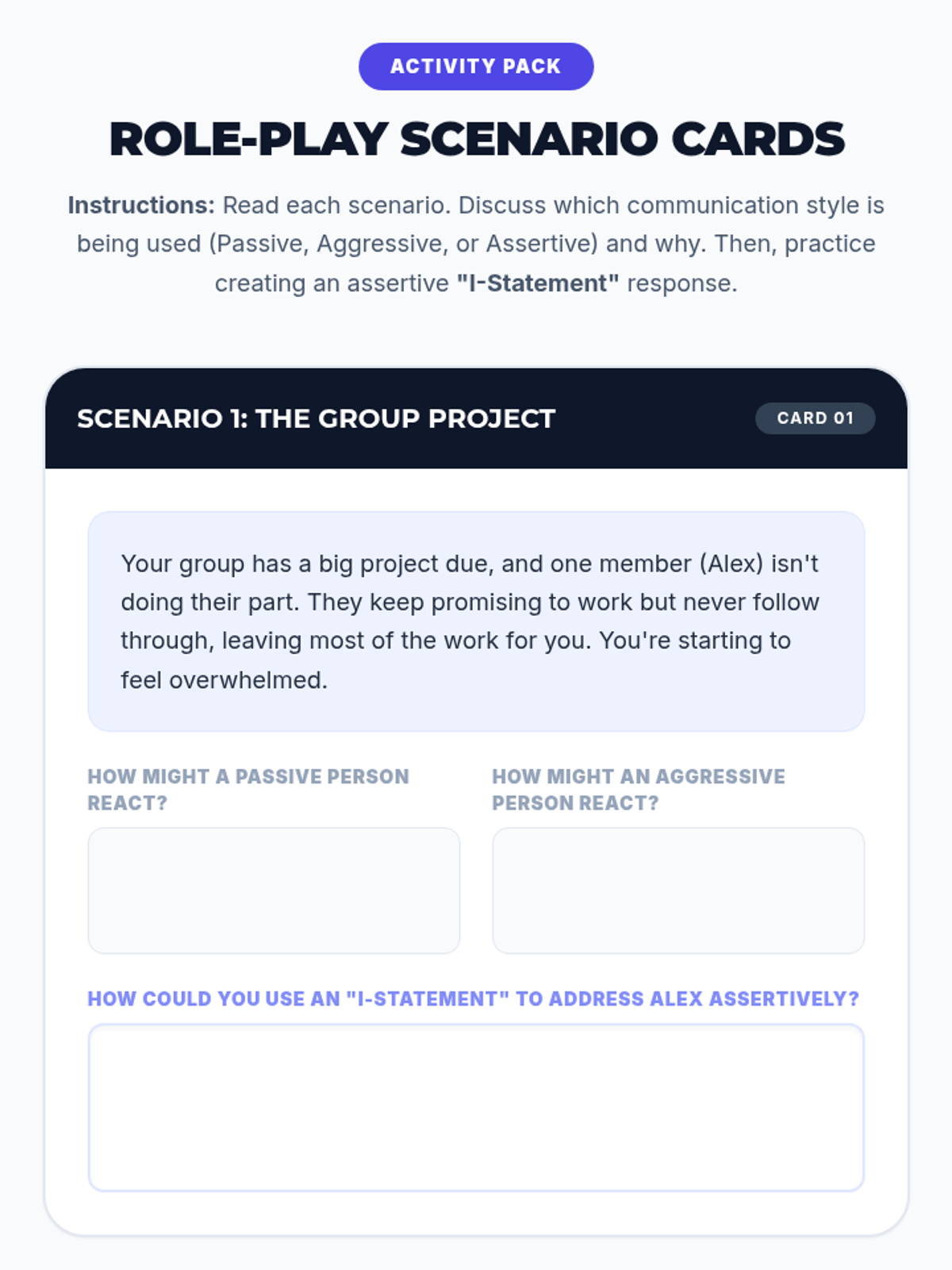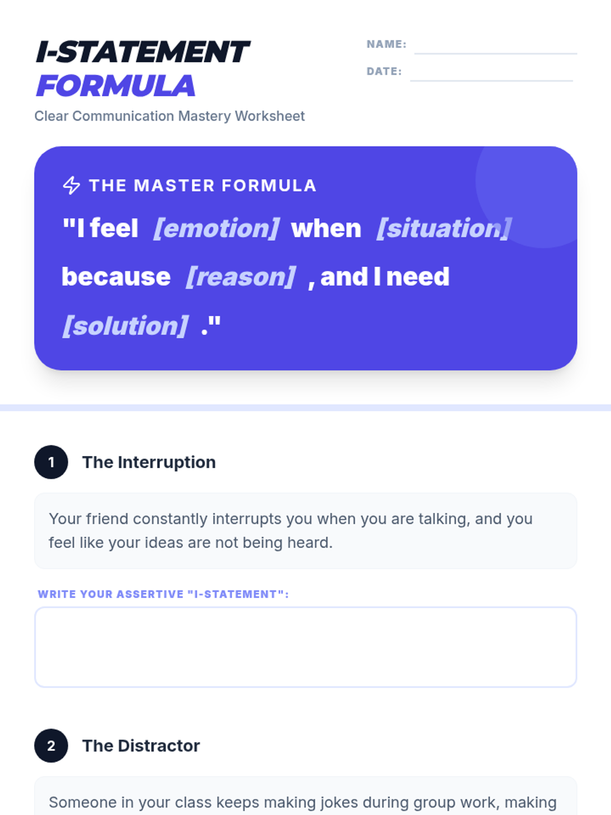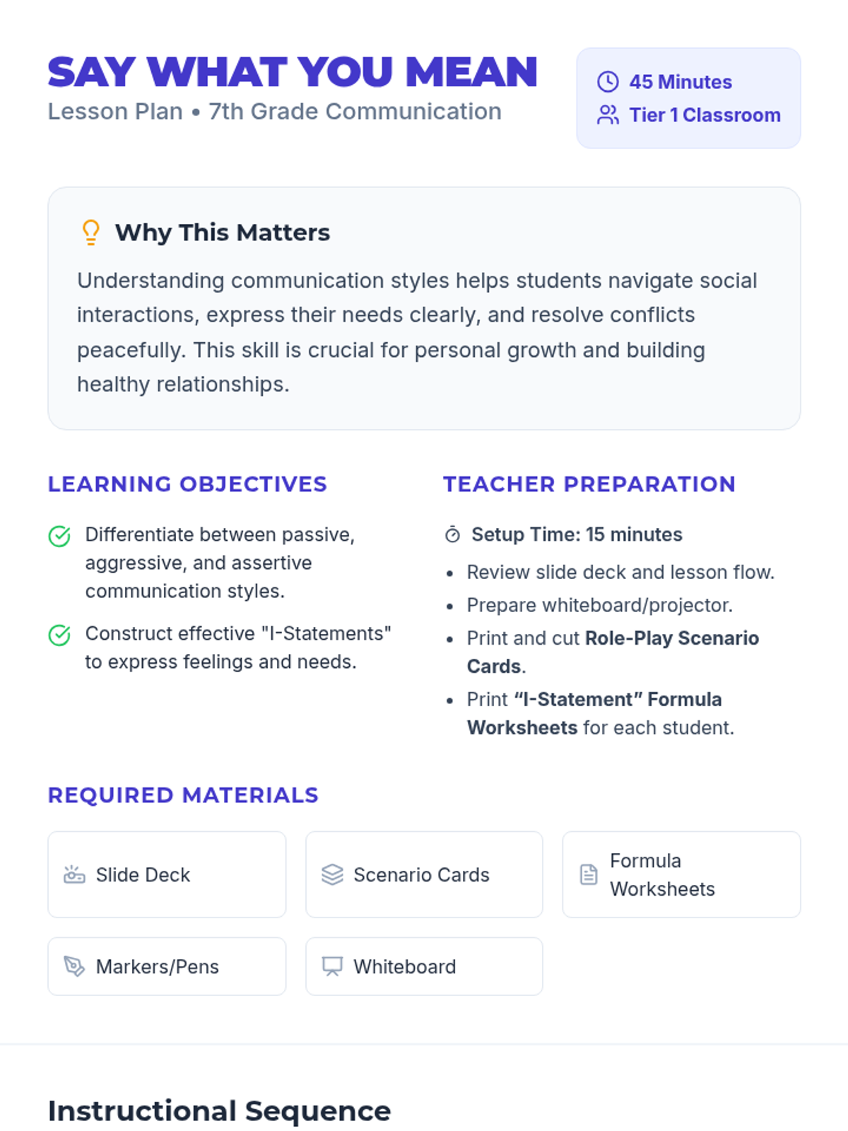 A 45-minute interactive lesson for 7th graders to distinguish between passive, aggressive, and assertive communication styles and master the 'I-Statement' formula for clear self-expression.