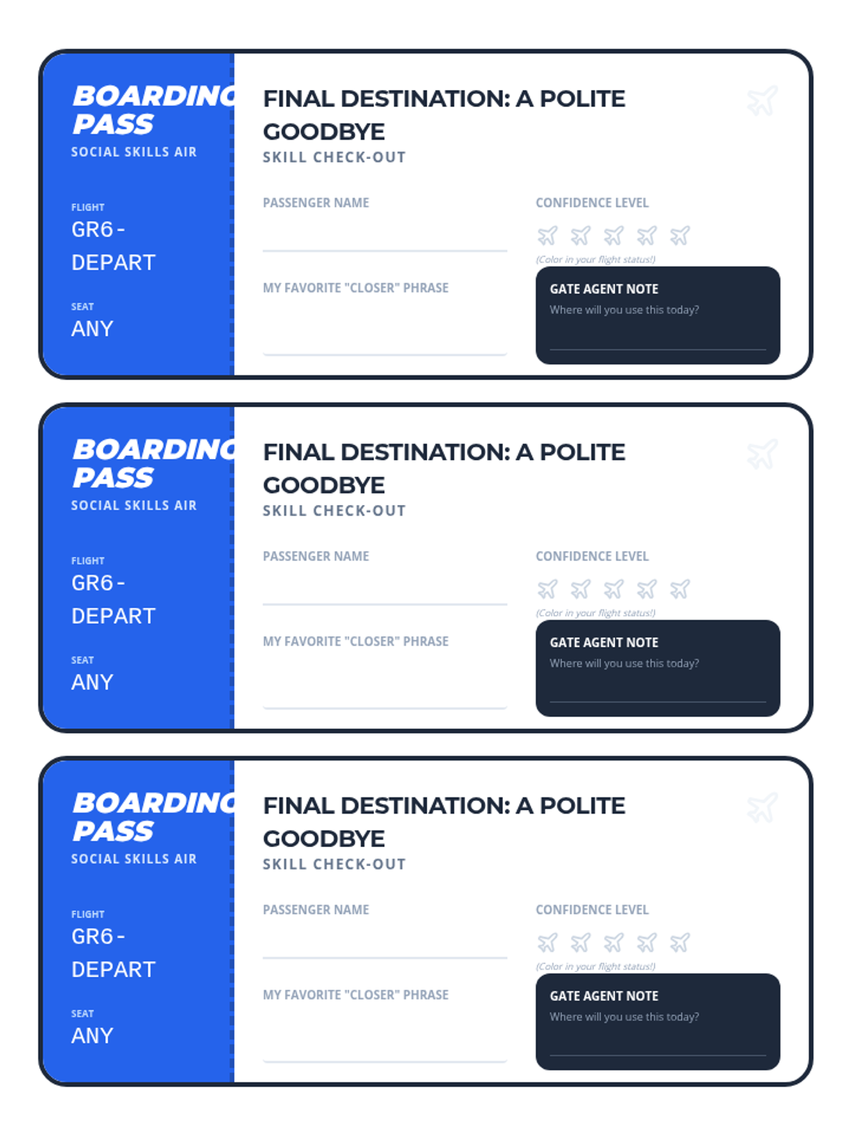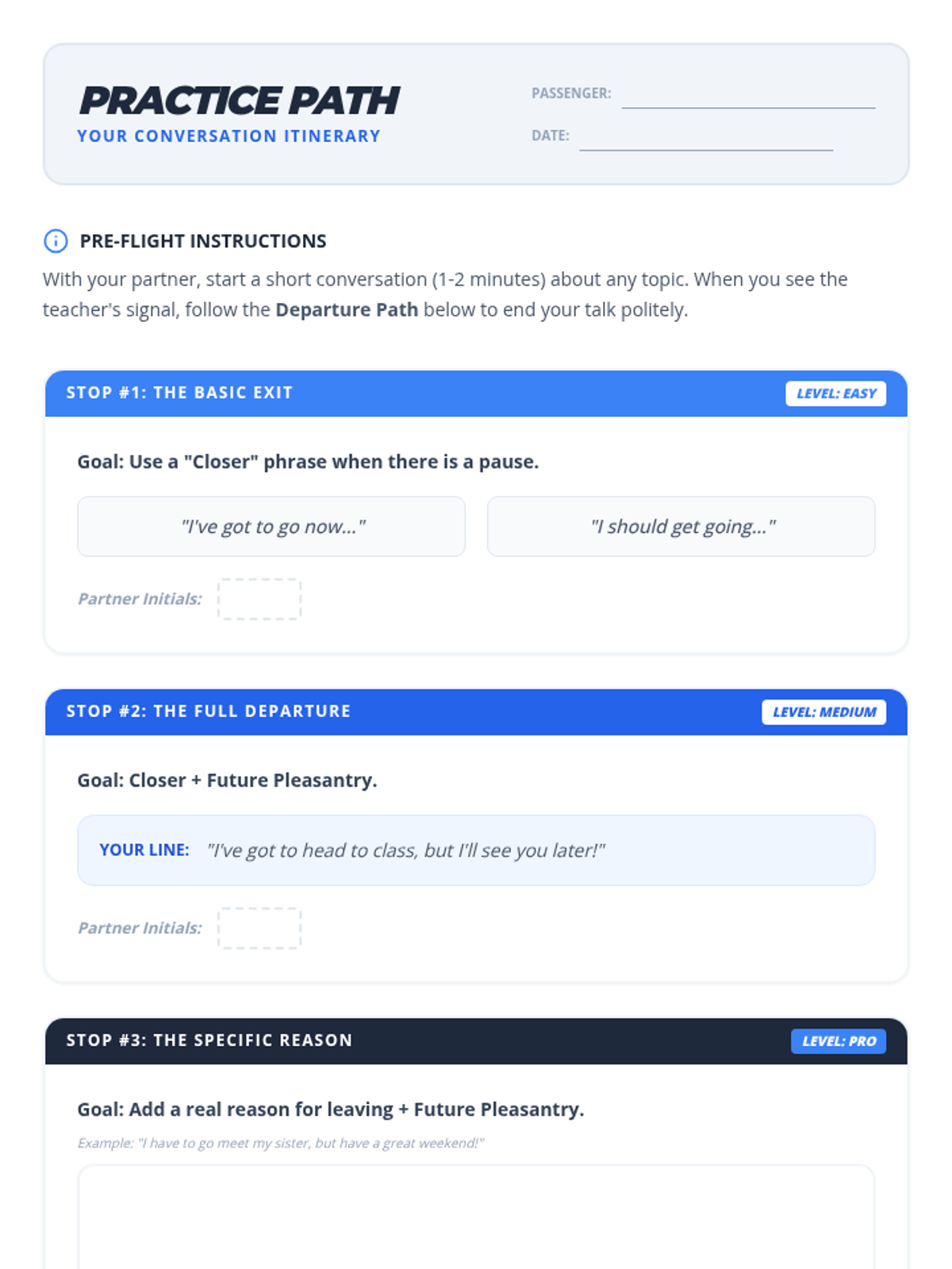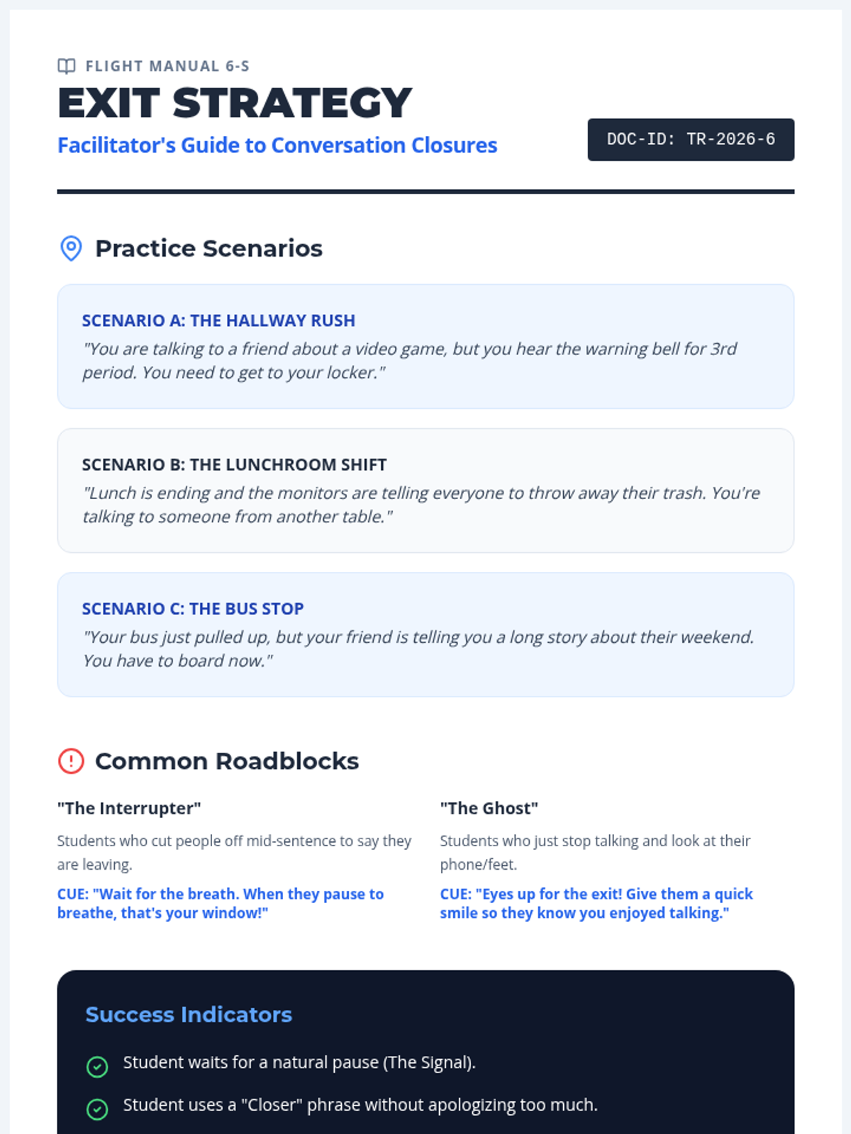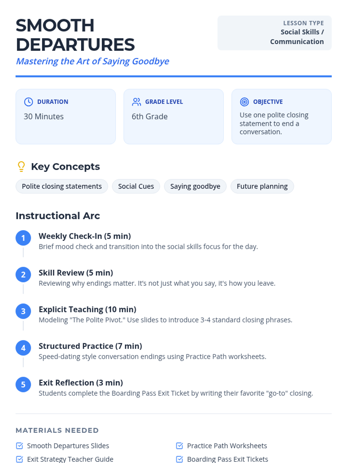 A social skills lesson for 6th graders focused on identifying and using polite closing statements to end conversations effectively and kindly.