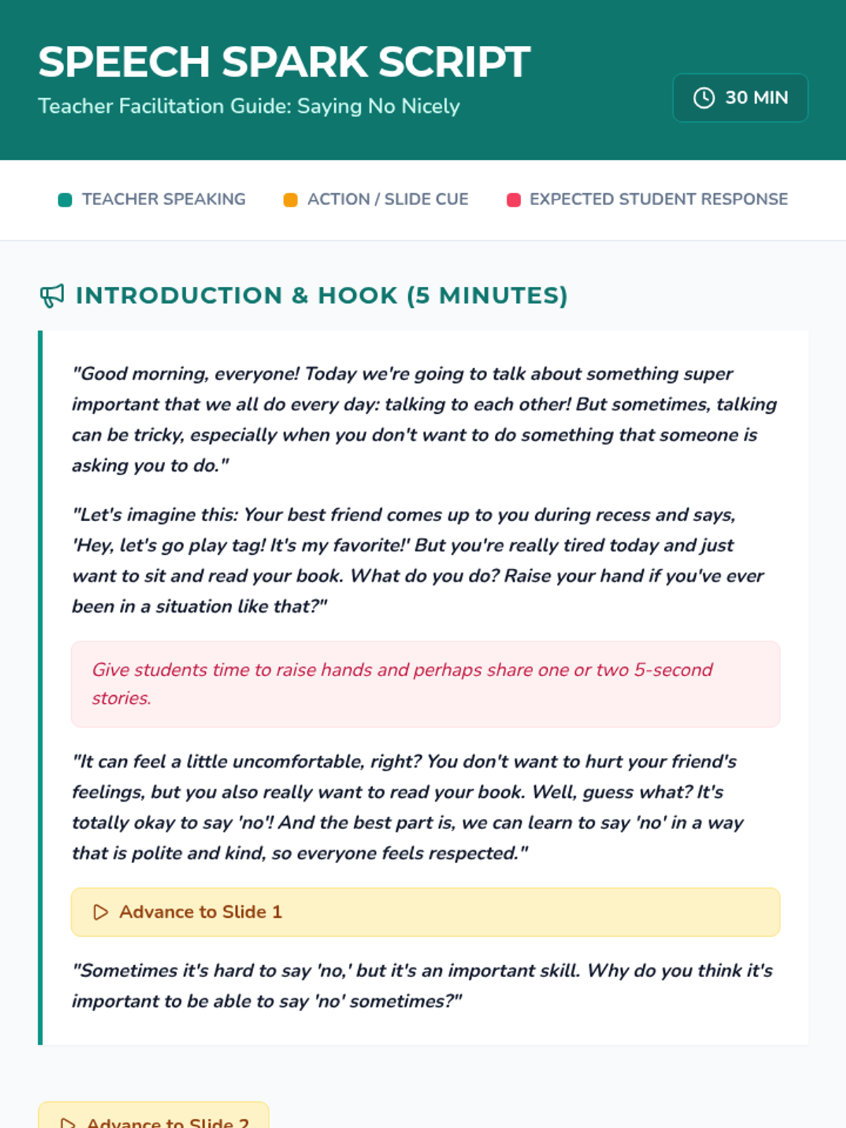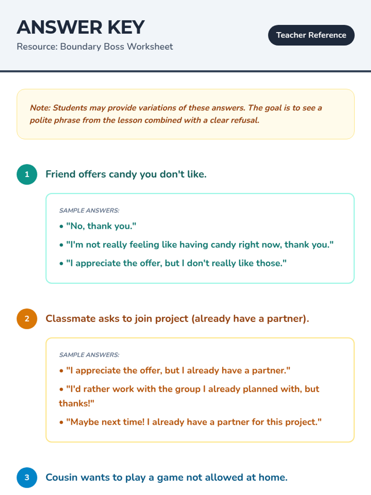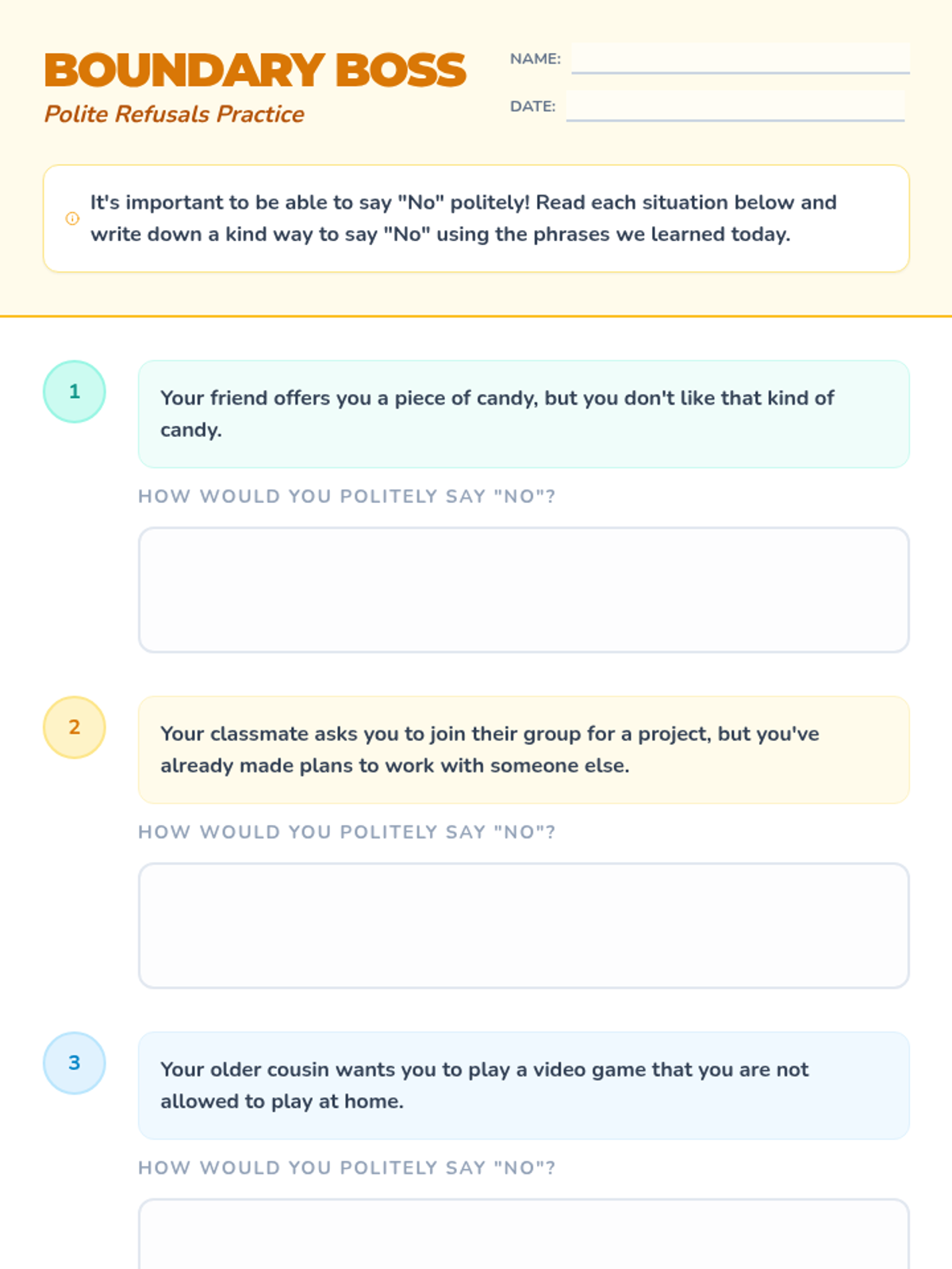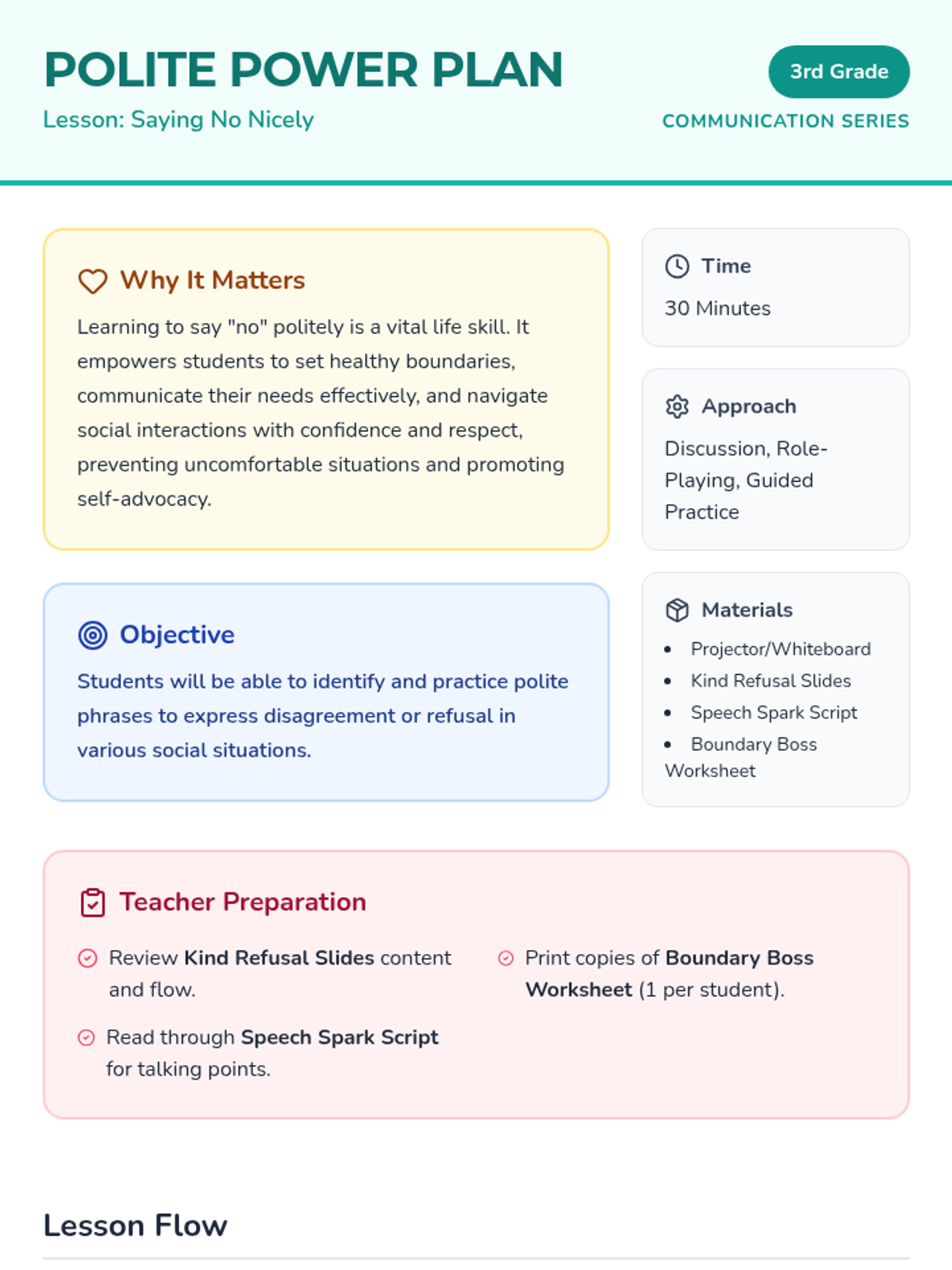 A 30-minute lesson for 3rd-grade students to learn and practice polite ways to express disagreement or refusal, fostering healthy communication and personal boundaries.