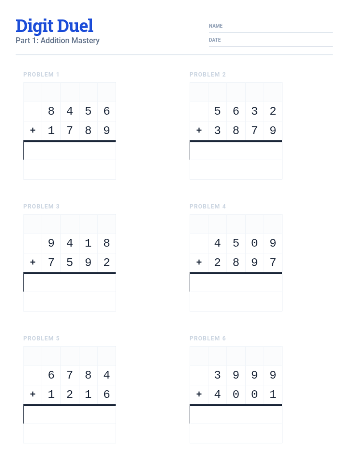 A comprehensive practice set focusing on 3 and 4-digit addition and subtraction with complex regrouping and borrowing across zeros.