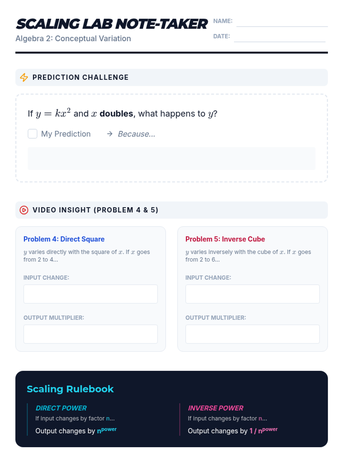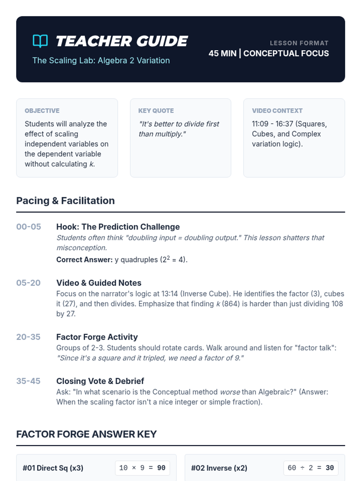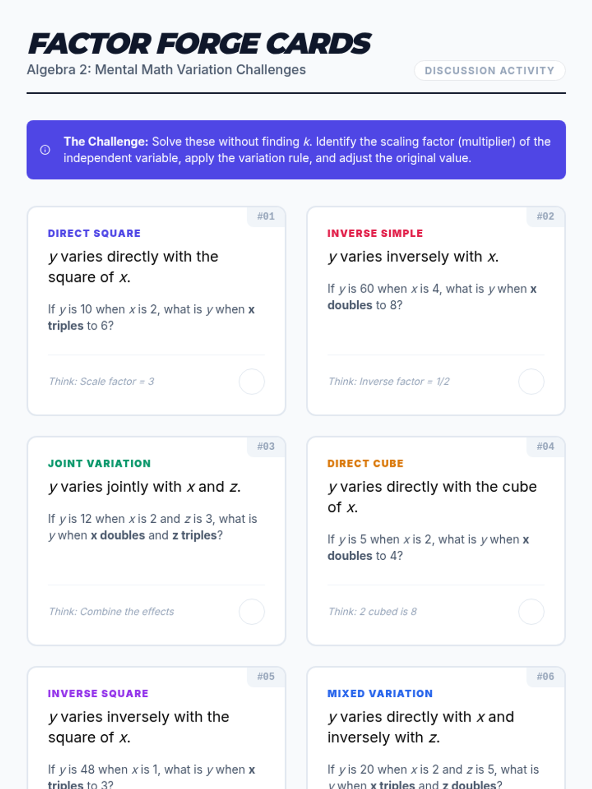 A conceptual approach to Algebra 2 variations, focusing on scaling factors and mental math rather than solving for the constant of variation (k). Students learn to predict changes in dependent variables when independent variables are scaled by factors like doubling or tripling.