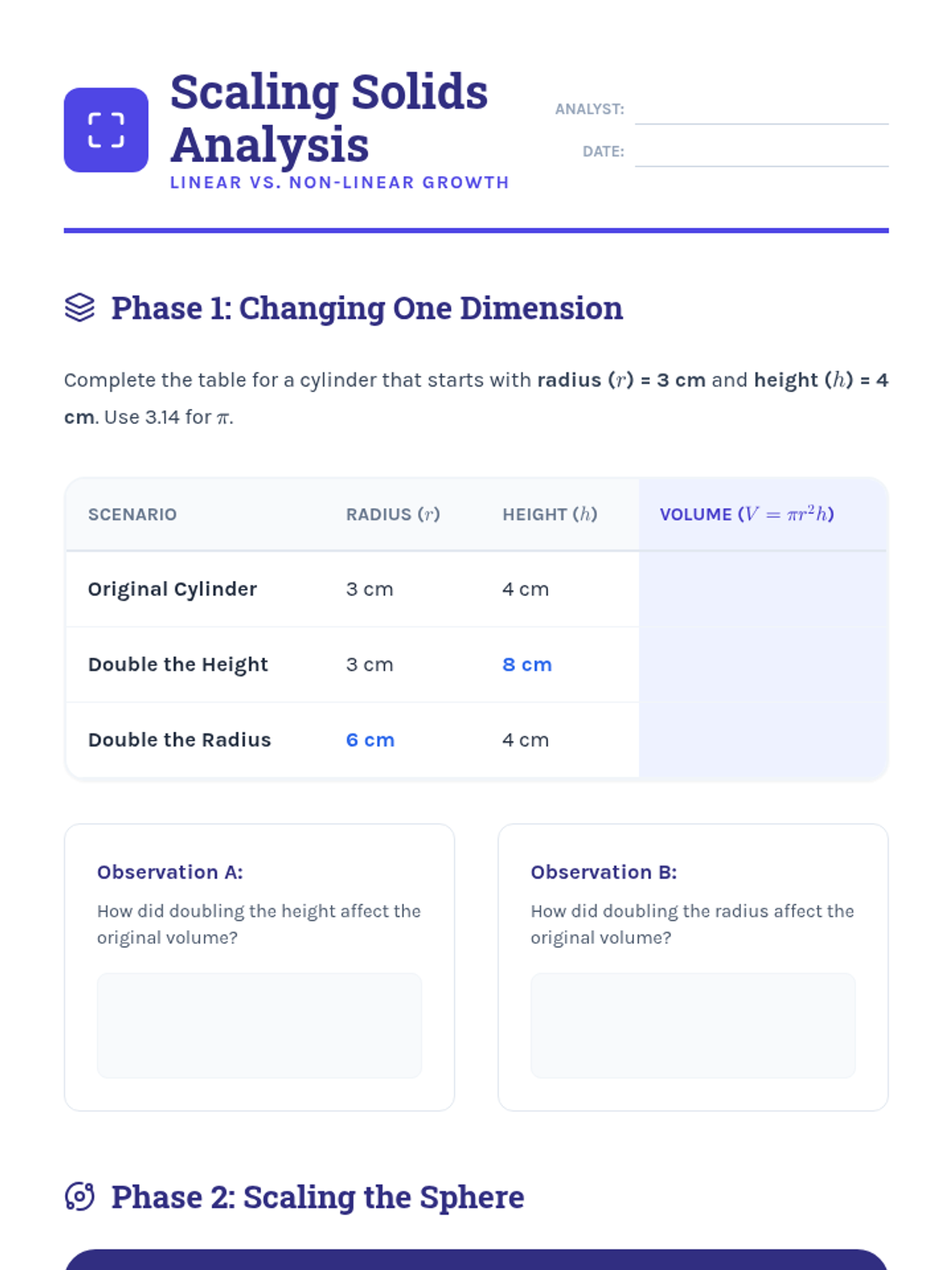 Students explore how doubling the radius vs. doubling the height affects the total volume of these solids, analyzing scale factors and non-linear growth.