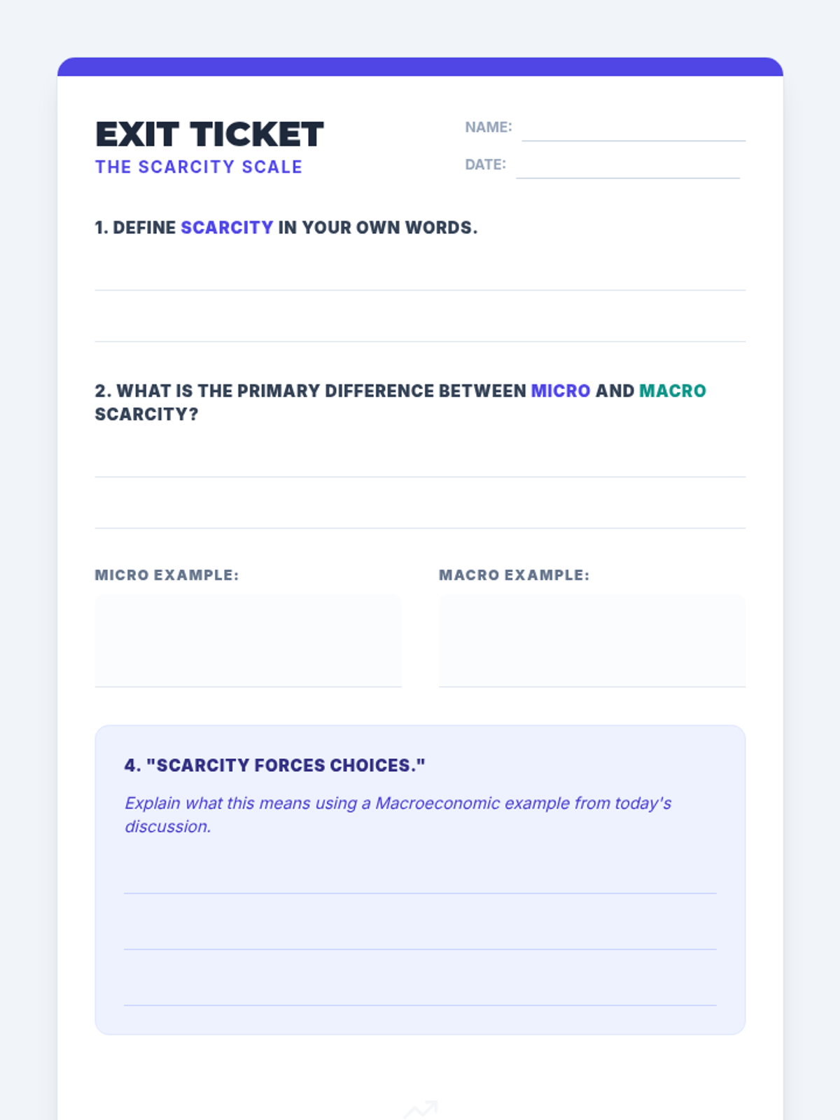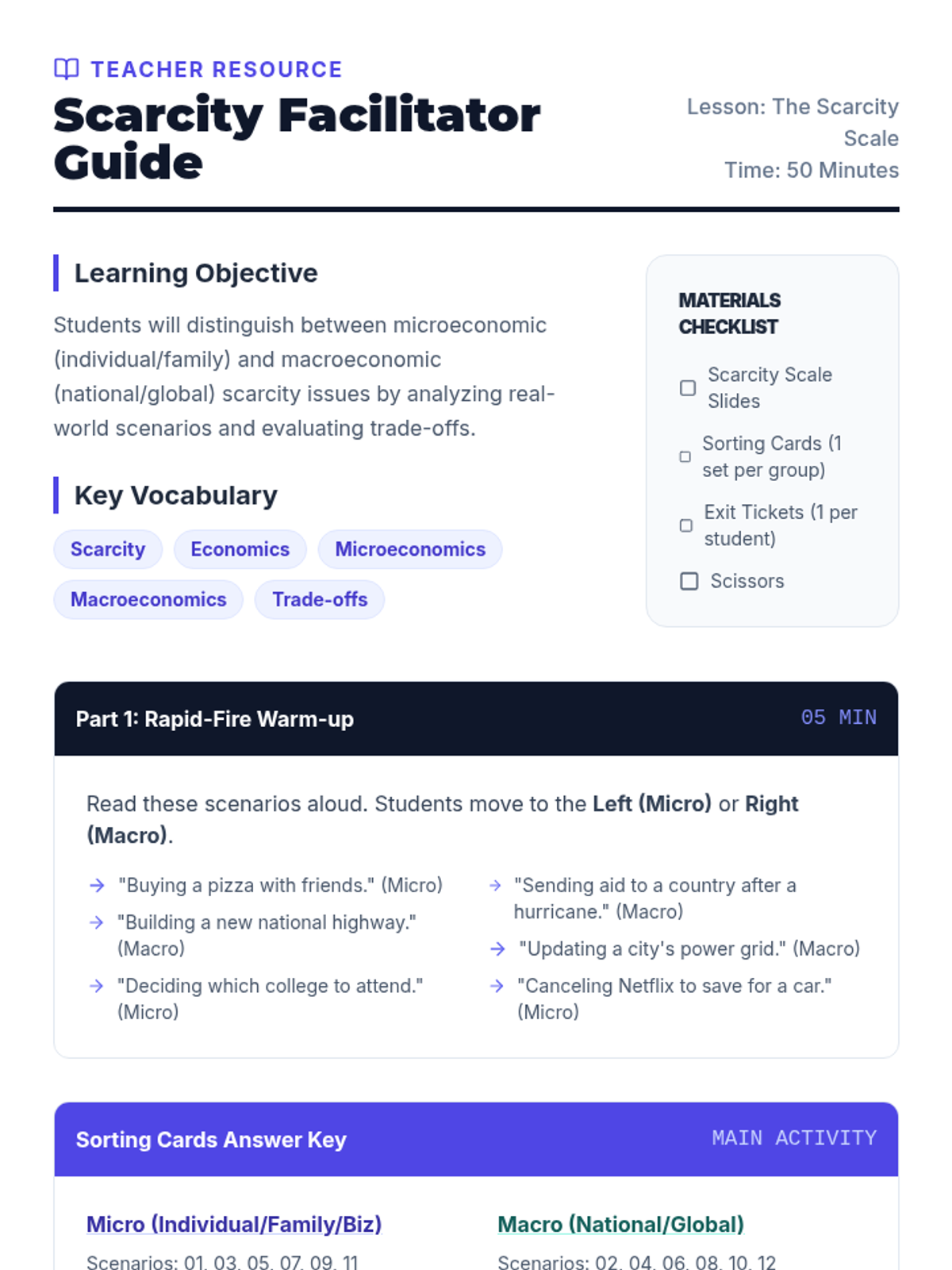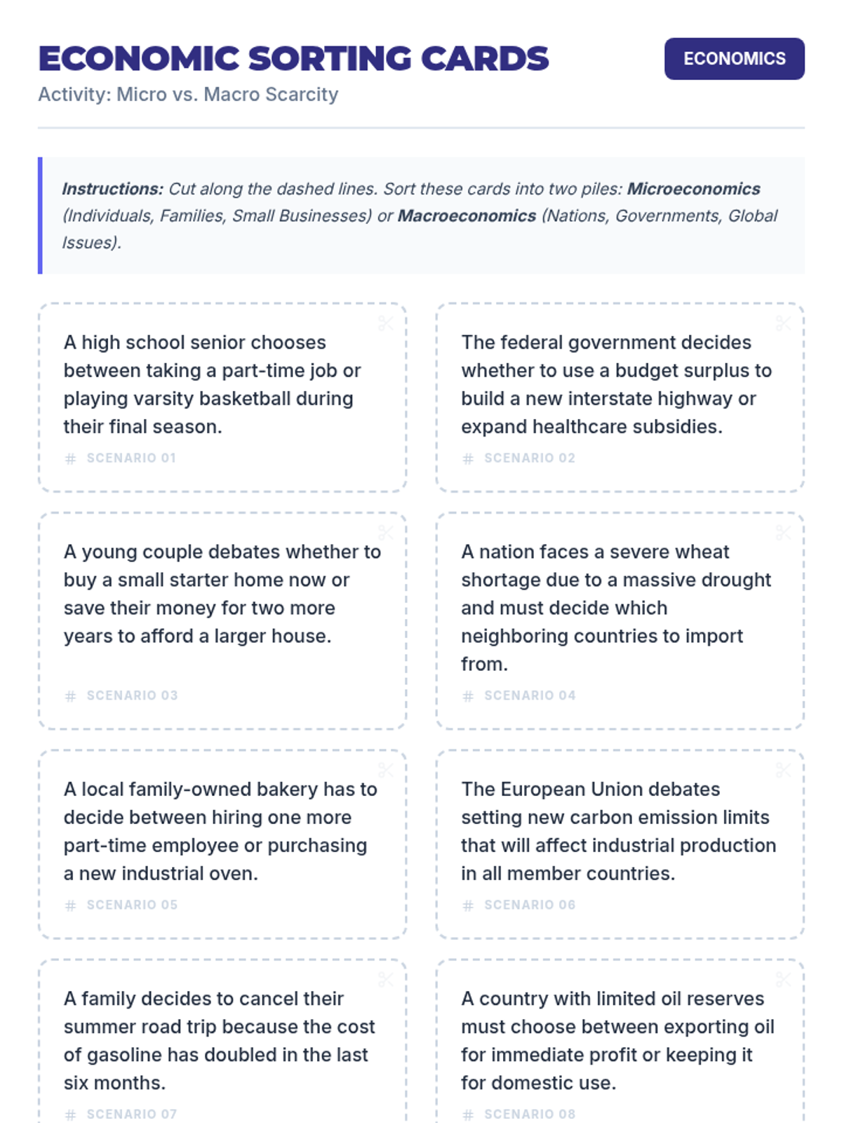 A lesson exploring the fundamental problem of scarcity, distinguishing between microeconomic (individual/family) and macroeconomic (national/global) decisions.
