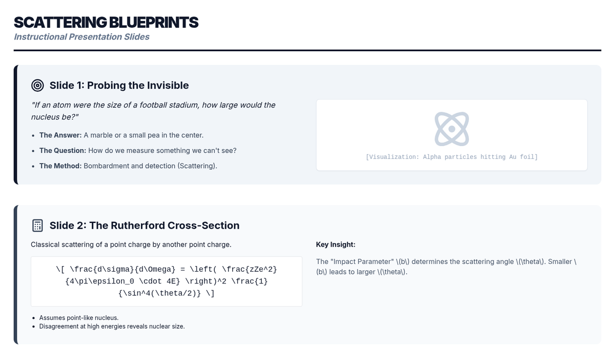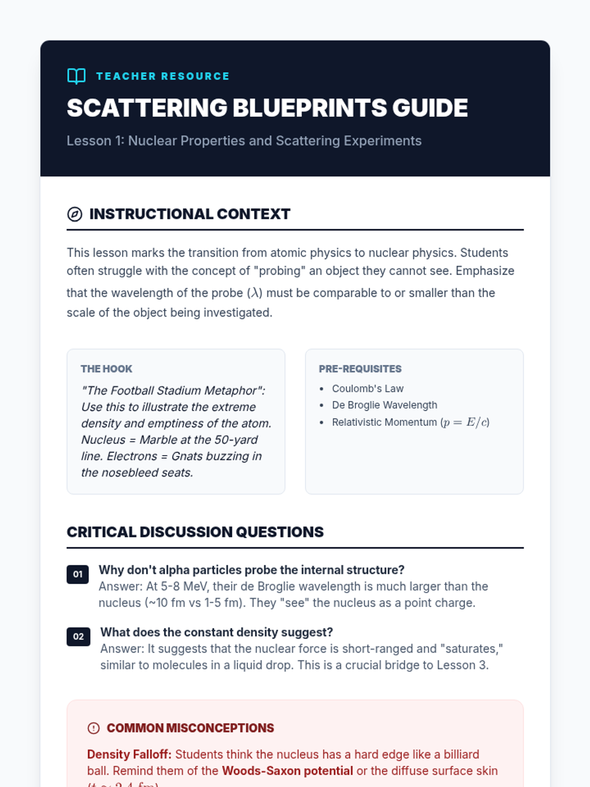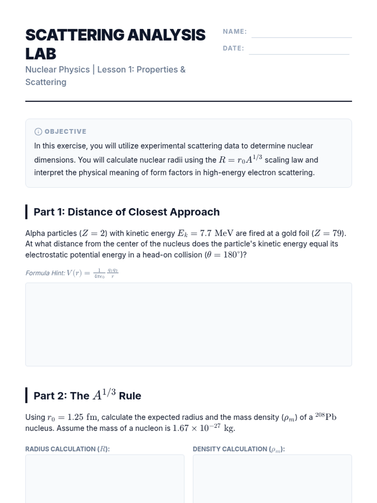 Students analyze Rutherford and electron scattering data to deduce nuclear size, density, and charge distribution. The lesson focuses on the relationship between scattering cross-sections and the nuclear form factor.