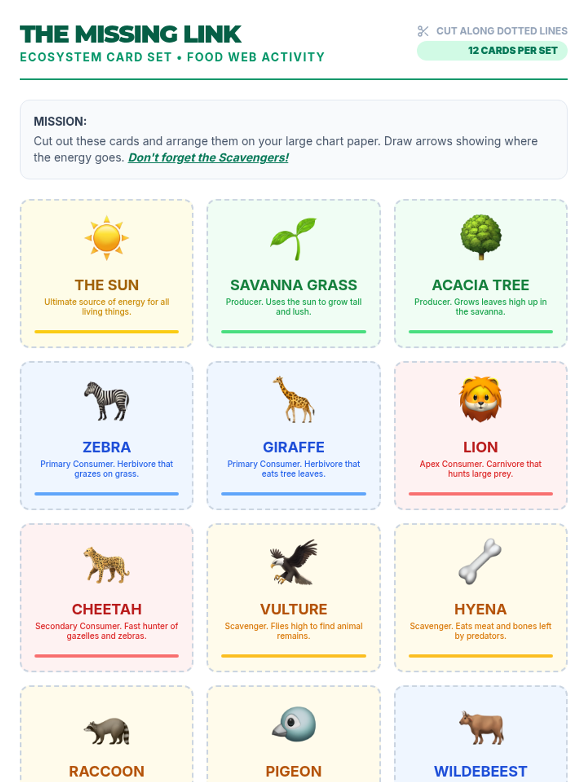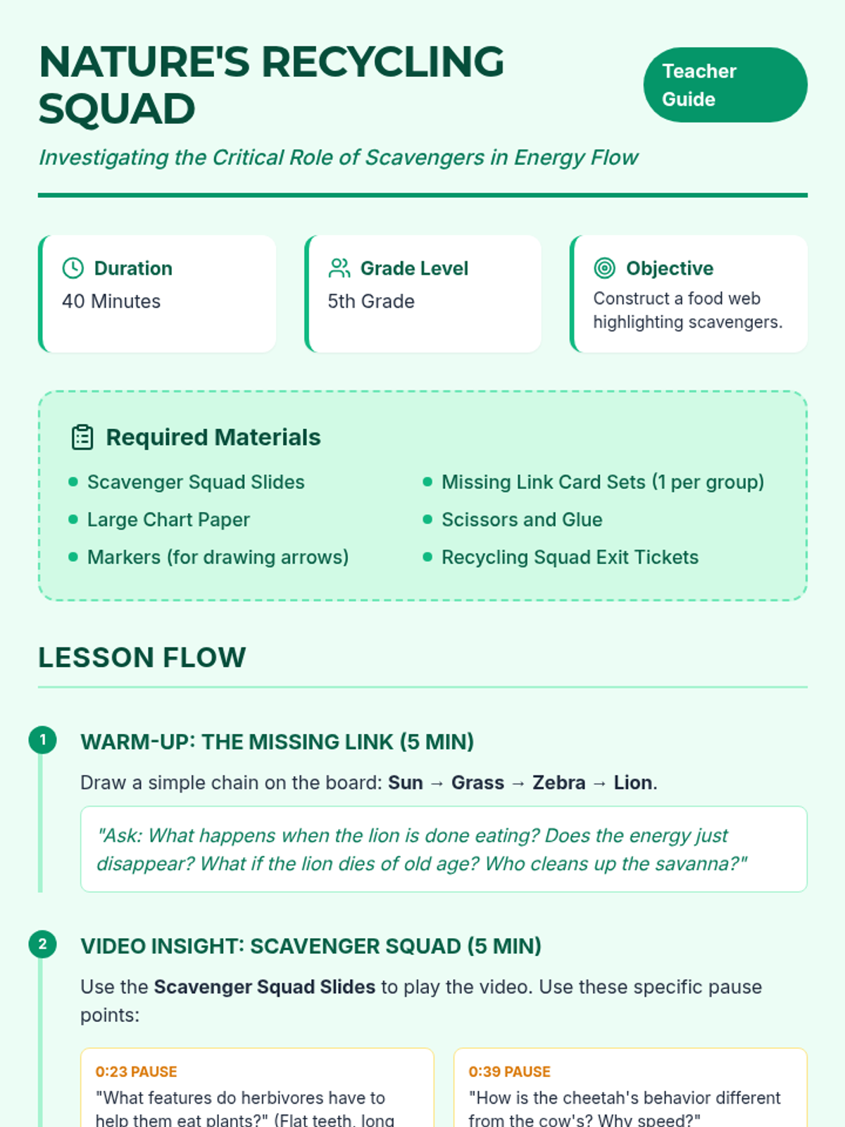 Students explore the vital role of scavengers in ecosystem energy flow through a video-led discussion and a hands-on food web construction activity, culminating in an understanding of nature's 'recycling' process.