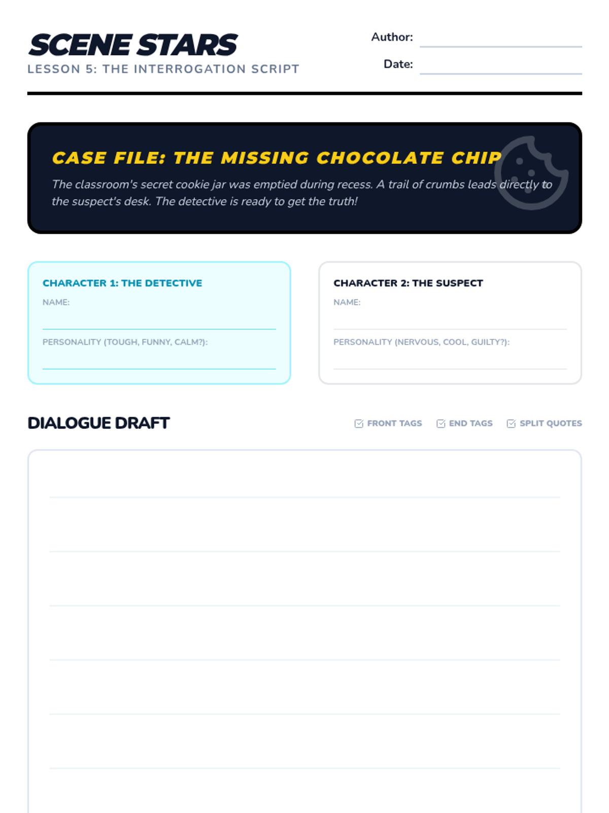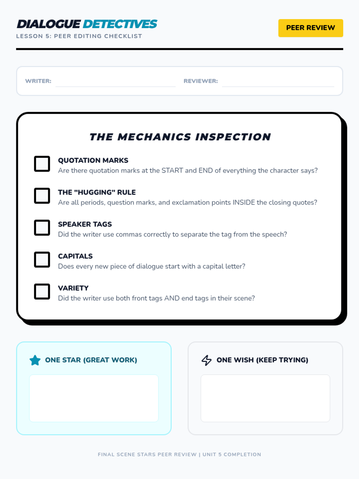 A culminating workshop where students write and edit an original dialogue-heavy narrative scene.