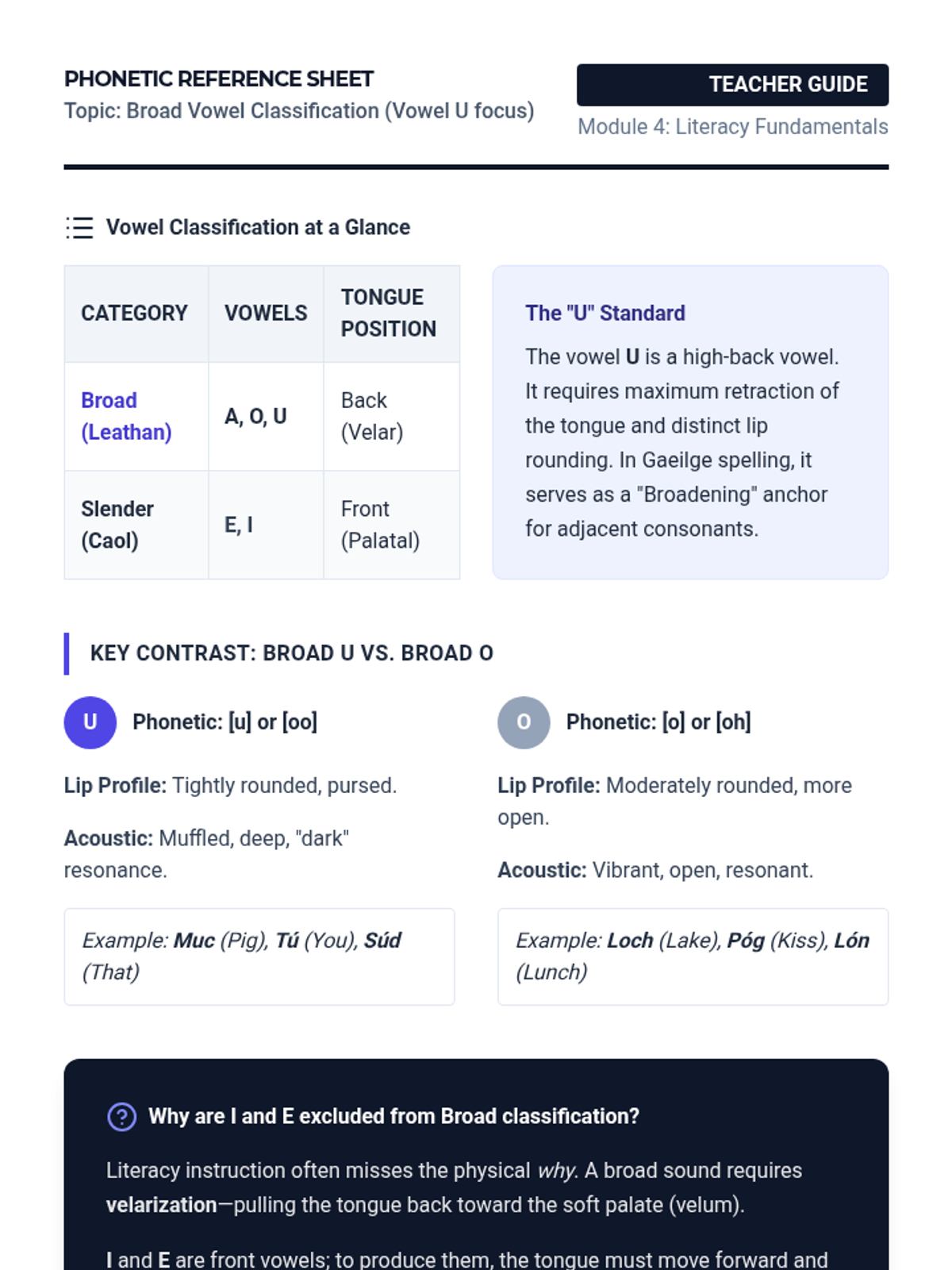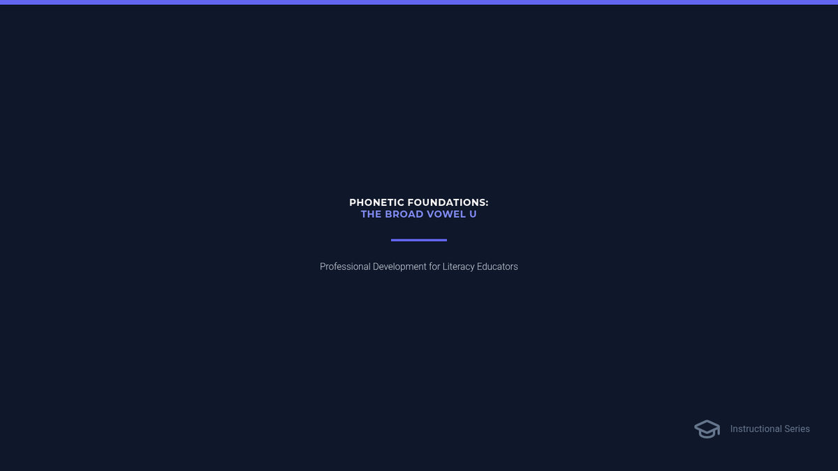 A professional development session for educators focusing on the phonetic properties and instructional strategies for teaching broad vowels, specifically focusing on the vowel 'U'.
