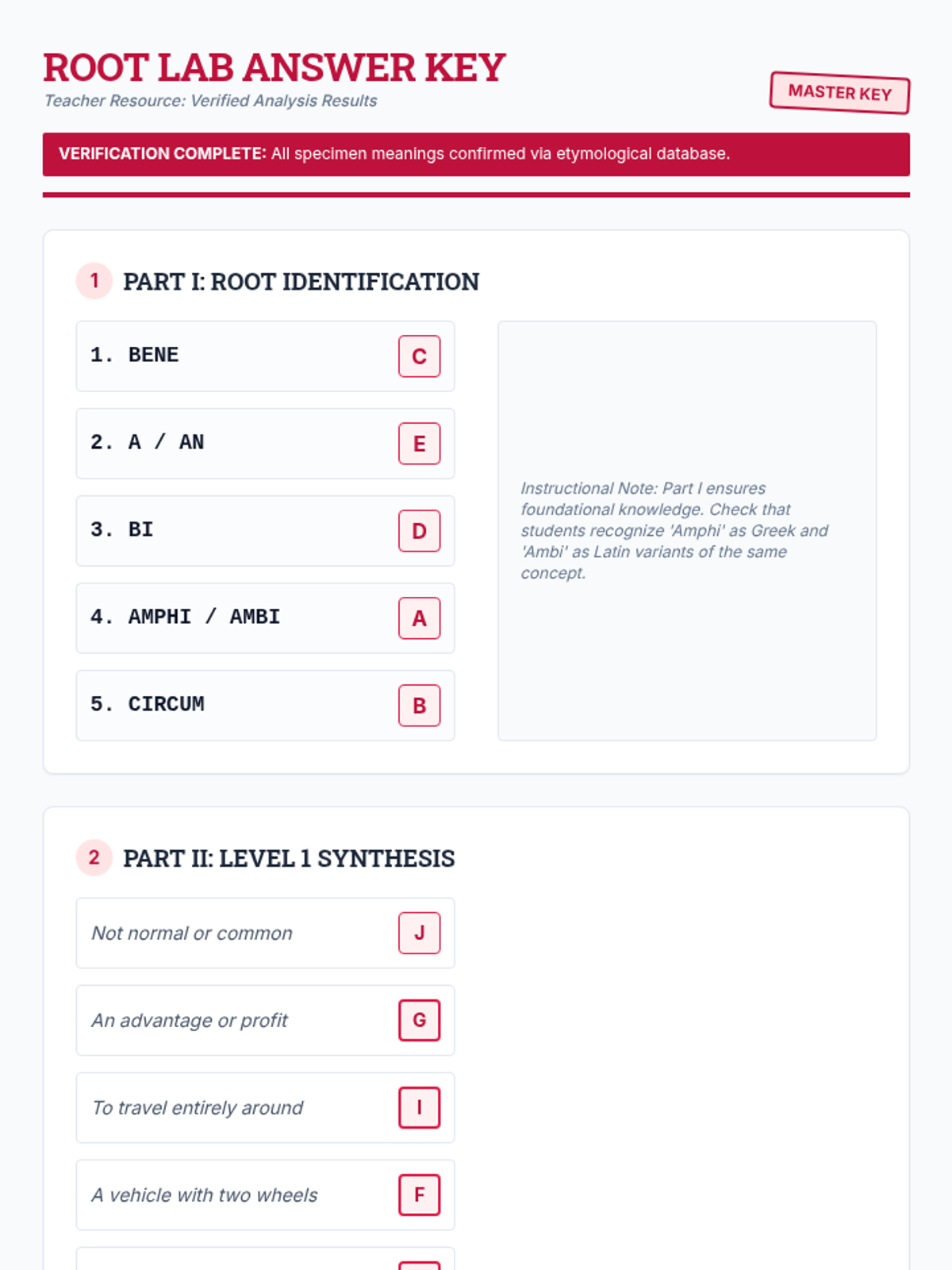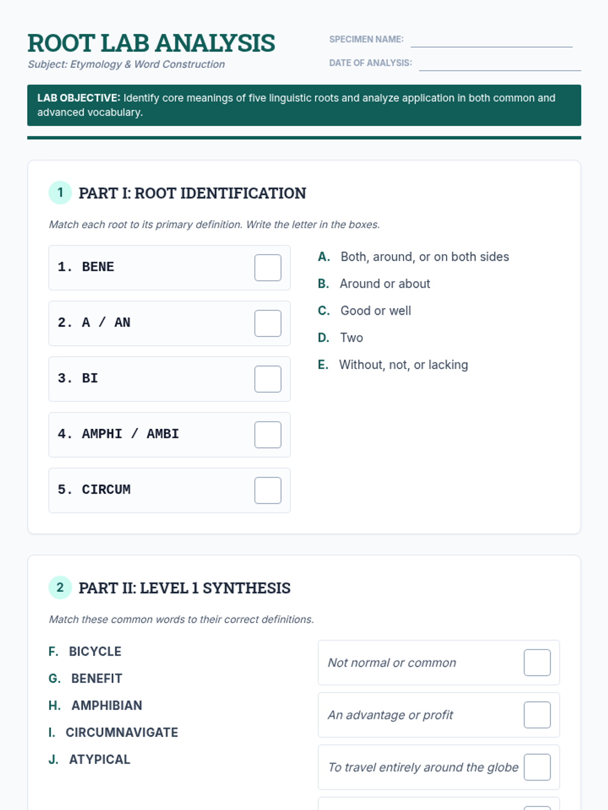 A lesson focused on exploring five common Latin and Greek roots through matching exercises and contextual application. Students will investigate 'bene', 'a/an', 'bi', 'amphi/ambi', and 'circum' using both simple and complex vocabulary.
