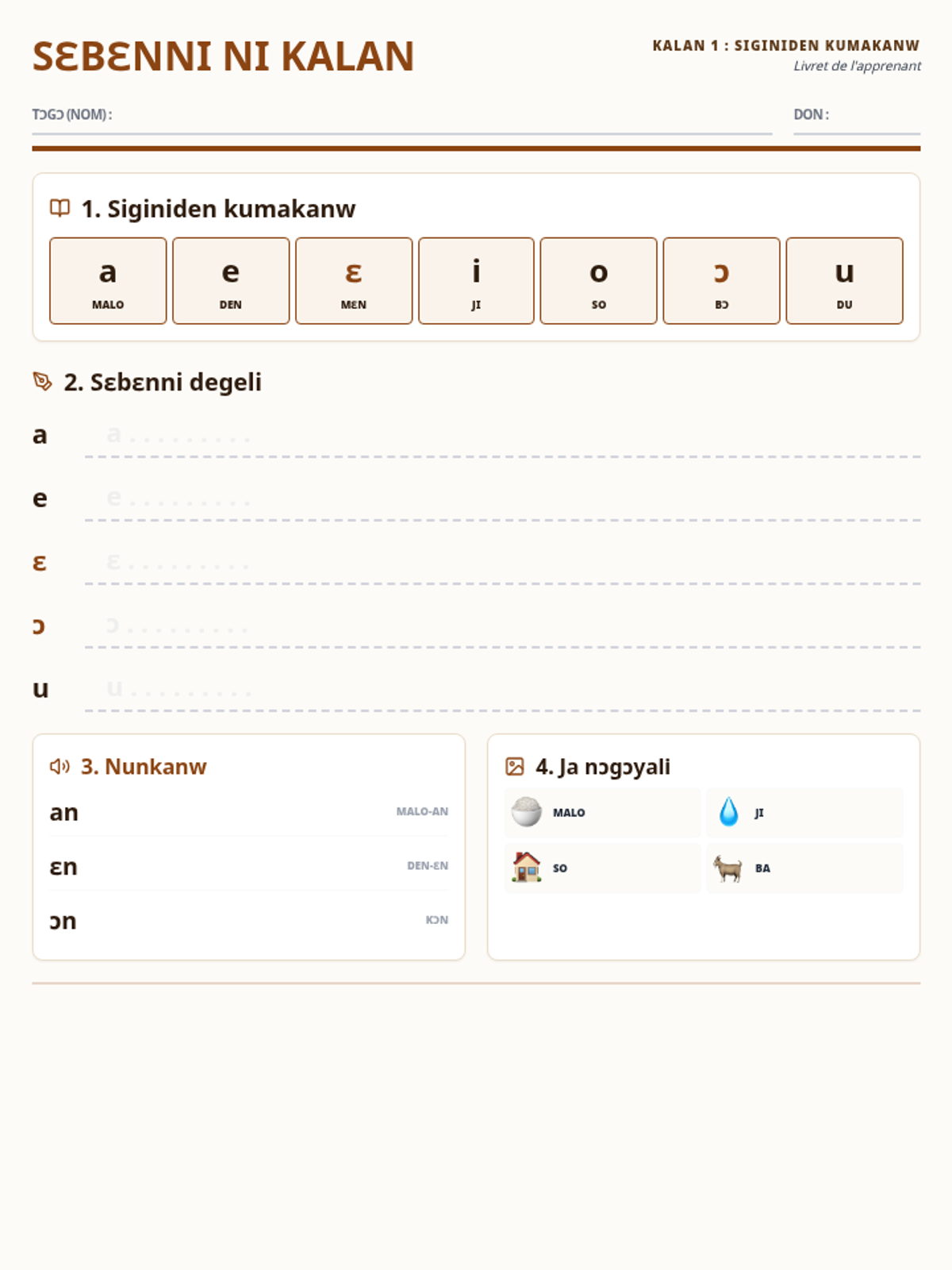 Introduction aux voyelles du Bamanankan (a, e, ɛ, i, o, ɔ, u) et à la nasalisation, avec des exercices de tracé et de reconnaissance auditive.