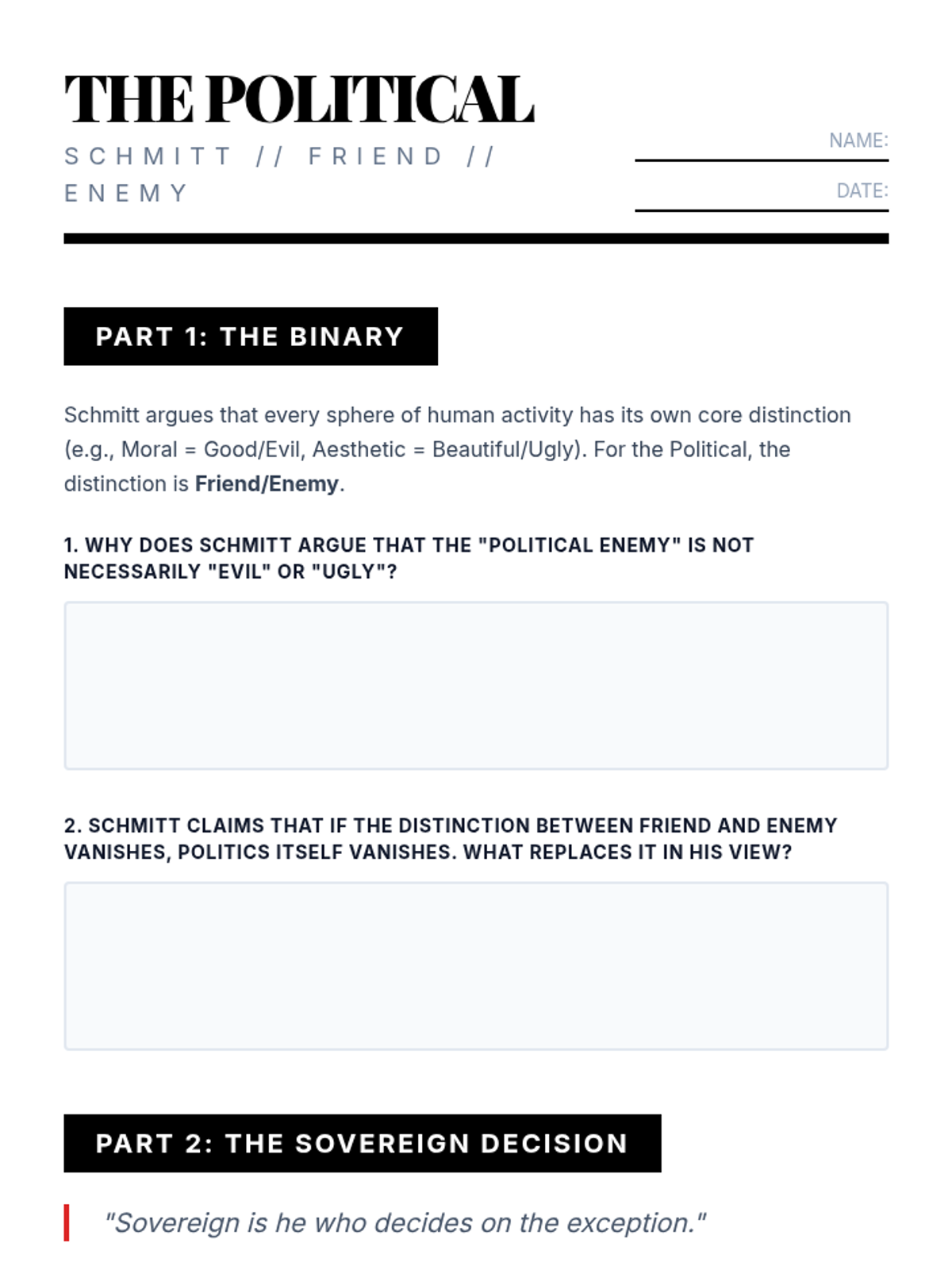 Explores Carl Schmitt's definition of 'the political' as the distinction between friend and enemy, and the role of the sovereign in deciding the 'state of exception'.