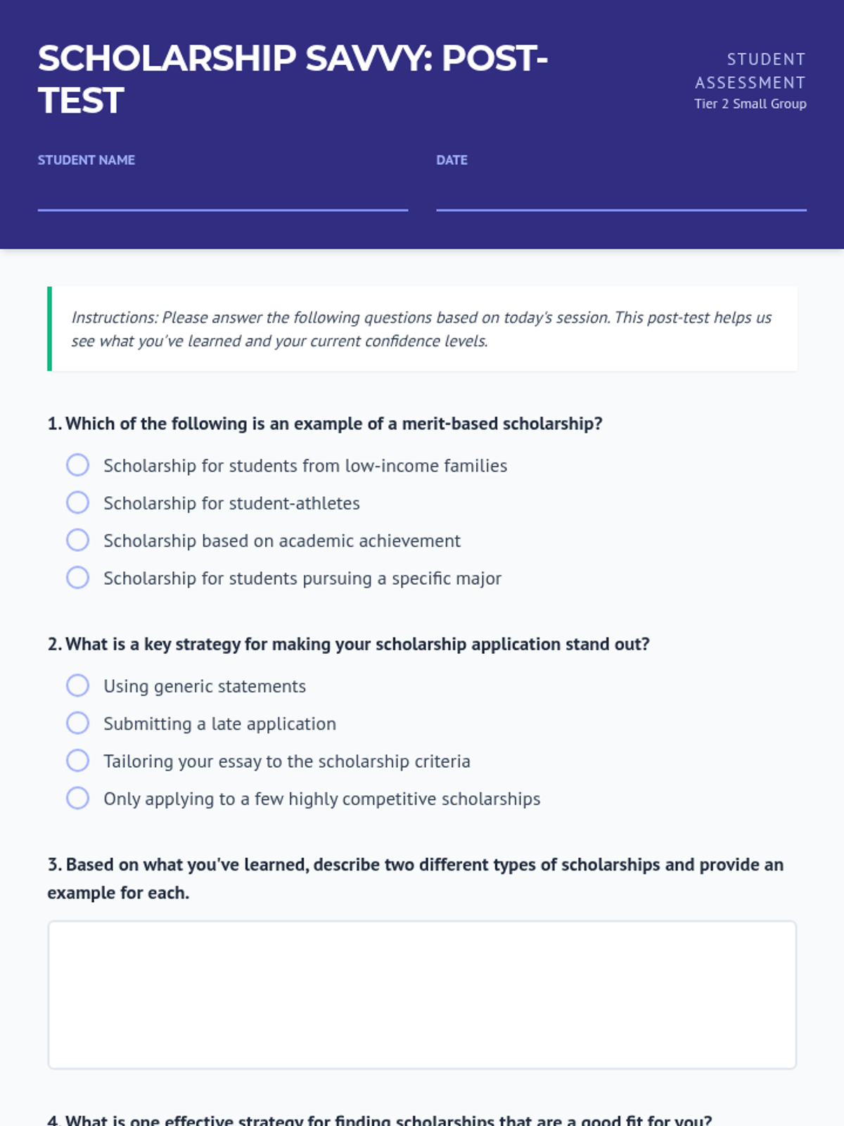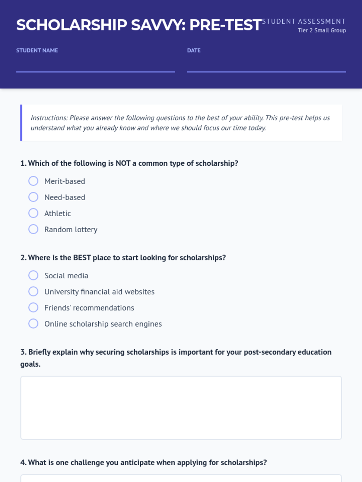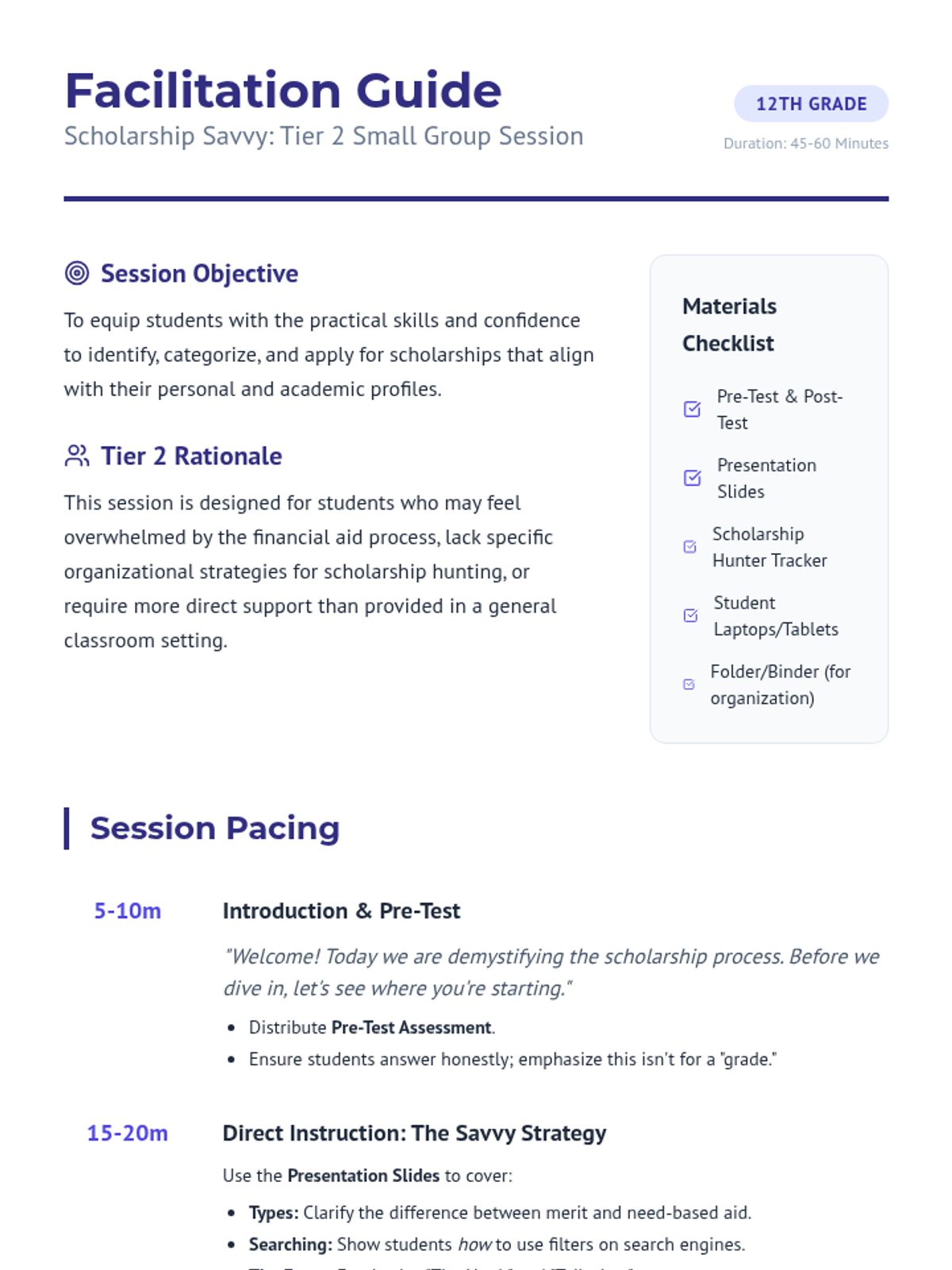 A Tier 2 small group session for 12th graders focused on navigating the scholarship application process, understanding scholarship types, and application strategies.