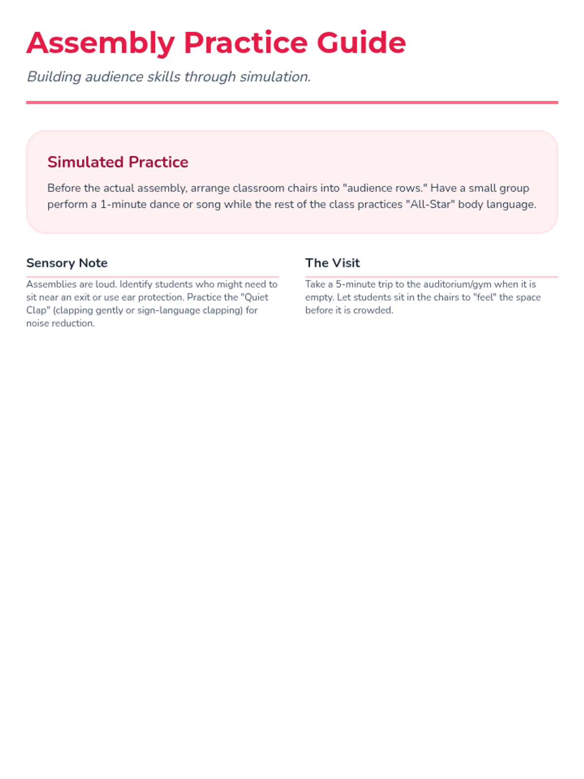 Students examine a story about sitting in a large group and watching a performance. They practice 'assembly behavior' (clapping, sitting still) in the classroom before visiting the auditorium to see the space.