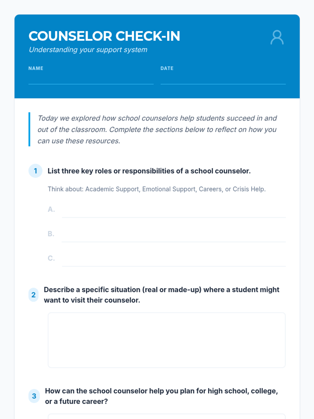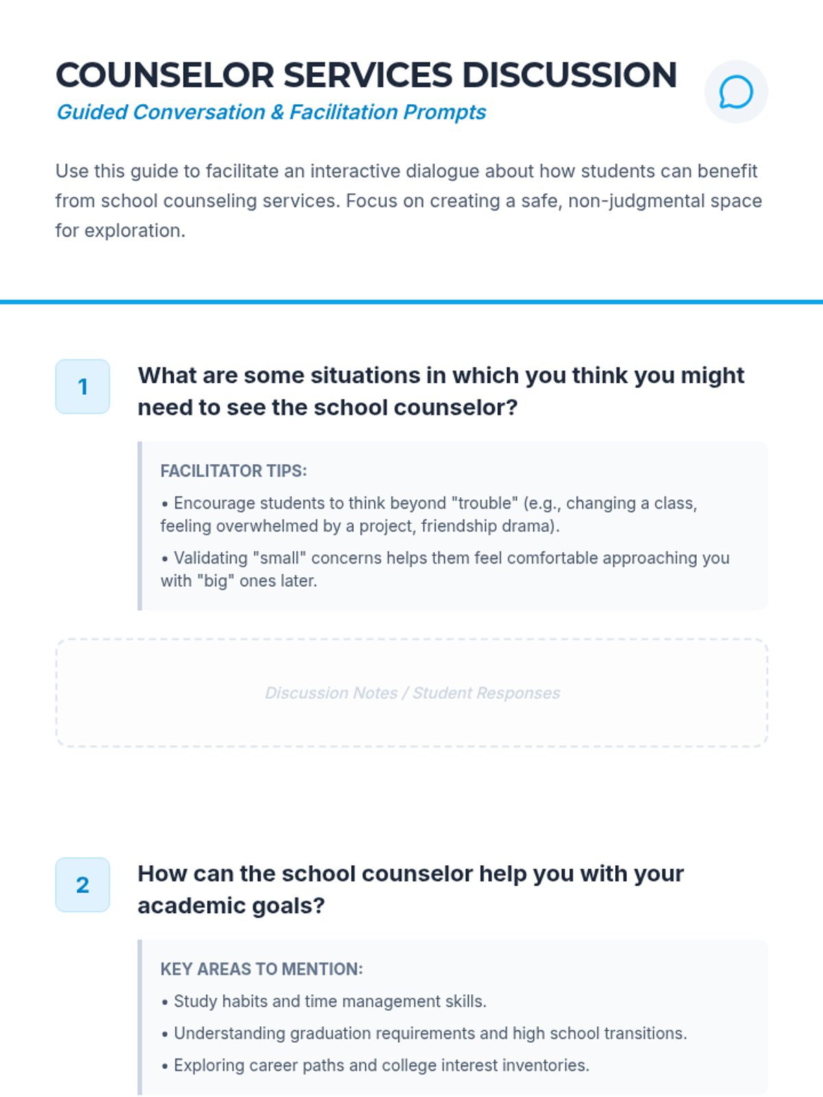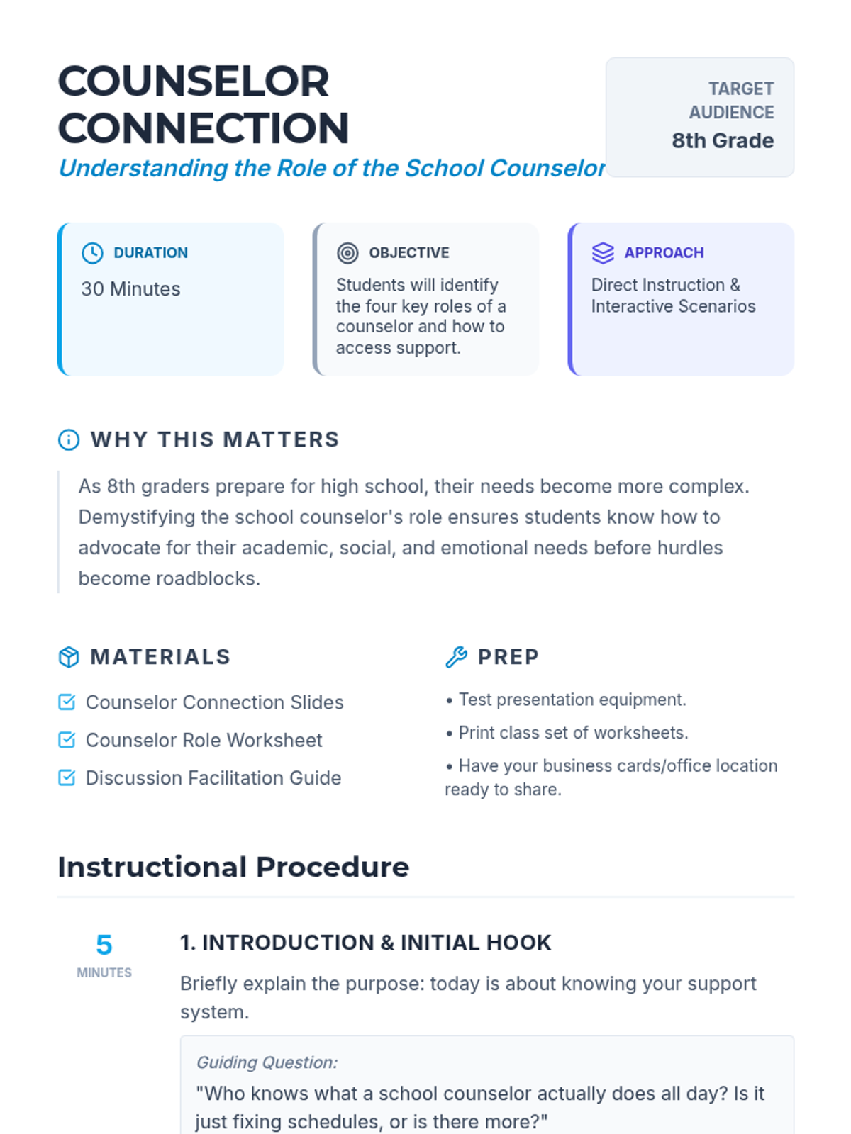 An 8th-grade lesson designed to demystify the school counselor's role, covering academic support, career planning, and social-emotional guidance.